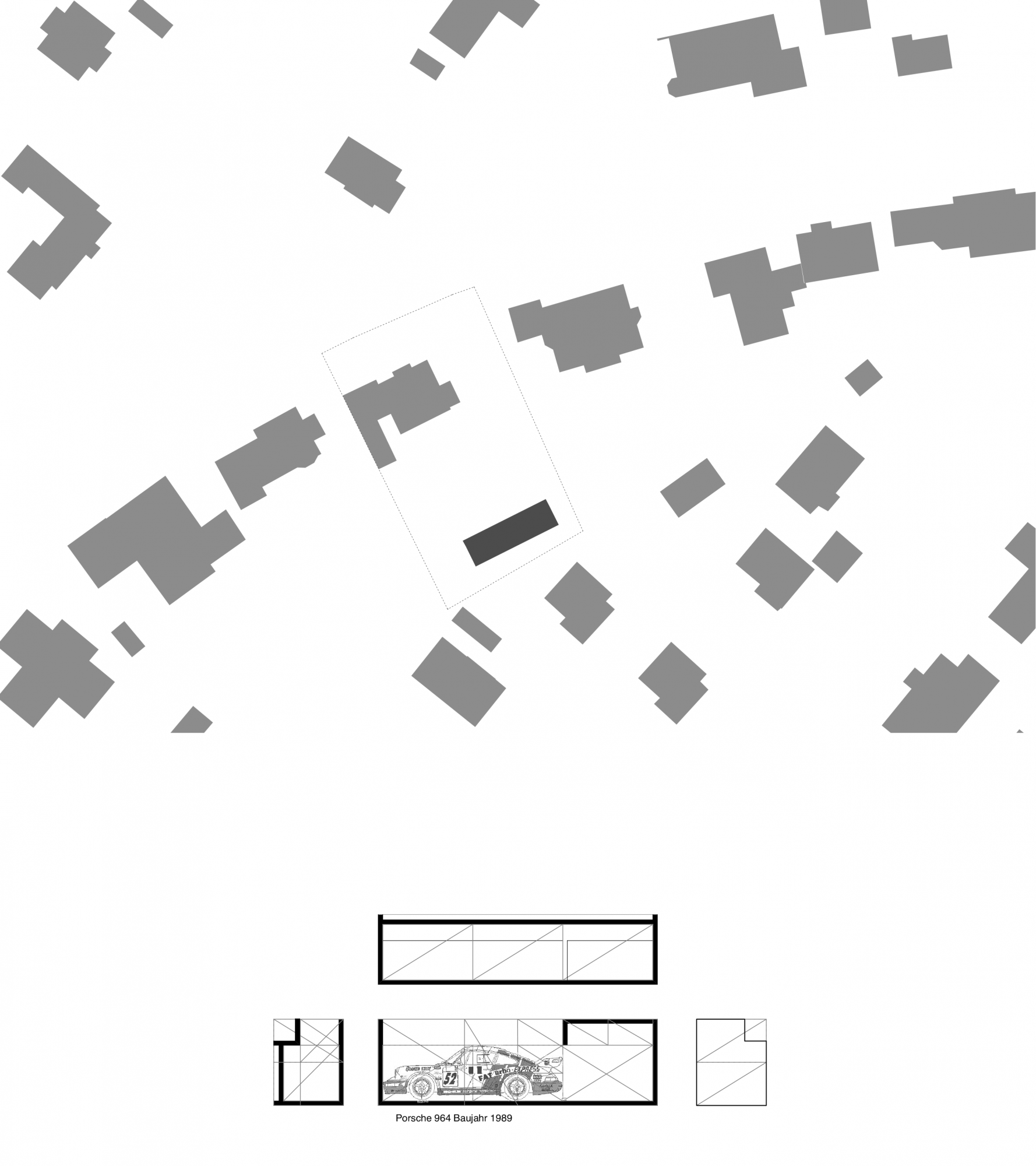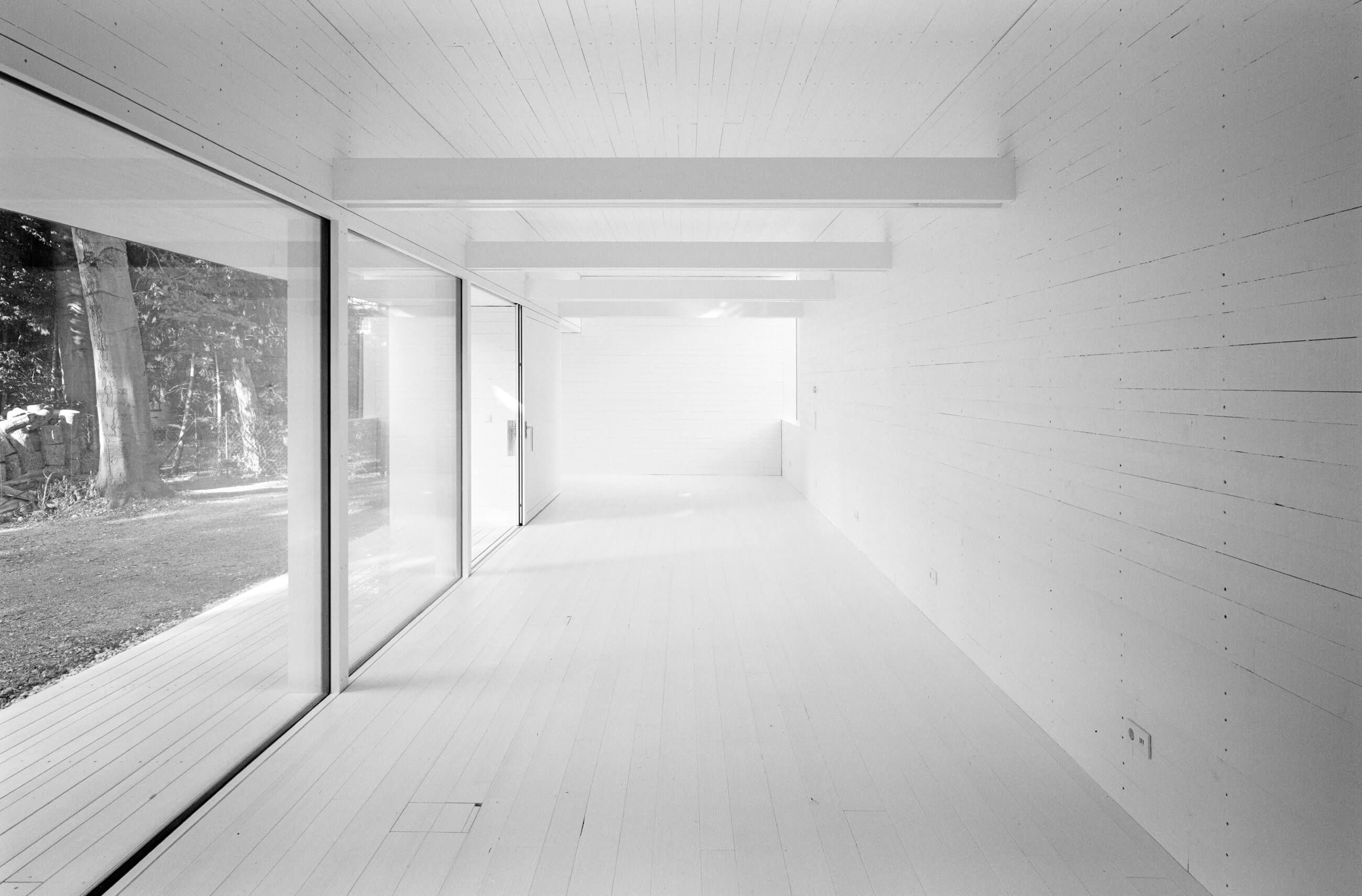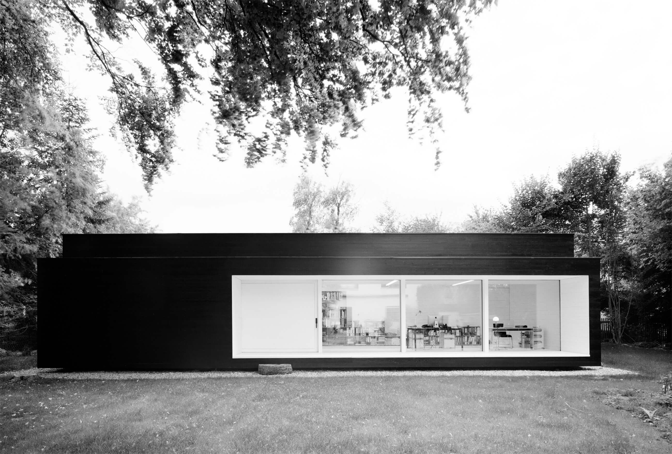 Das Atelier des Fotografen fasst das Grundstück am südlichen Rand und spannt zwischen sich und dem Bestandshaus den Raum des Privatgartens auf. Das Atelier liegt sanft, fast schwebend auf dem Rasen, konzipiert als struktureller Holzbau. Charakteristisch für den Baukörper ist das Thema Schwarz/Weiß, in Analogie zur Fotografie. Dieses zeigt sich in der Gestaltung der Oberflächen: außen schwarz und innen ganz in Weiß. Der dadurch in seiner Haltung extrovertierte Arbeitsraum thematisiert das Vis-a-vis zwischen Alt und Neu. Ein Proportionsschema liegt allem zugrunde, es schafft Harmonie im Auge des Betrachters. Die differenzierten Höhen folgen der inneren Nutzung und Funktion: Der überdachte Vorbereich und die Abstellzone sind niedriger als der Arbeitsraum.