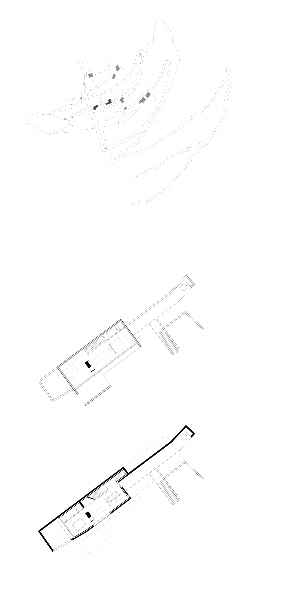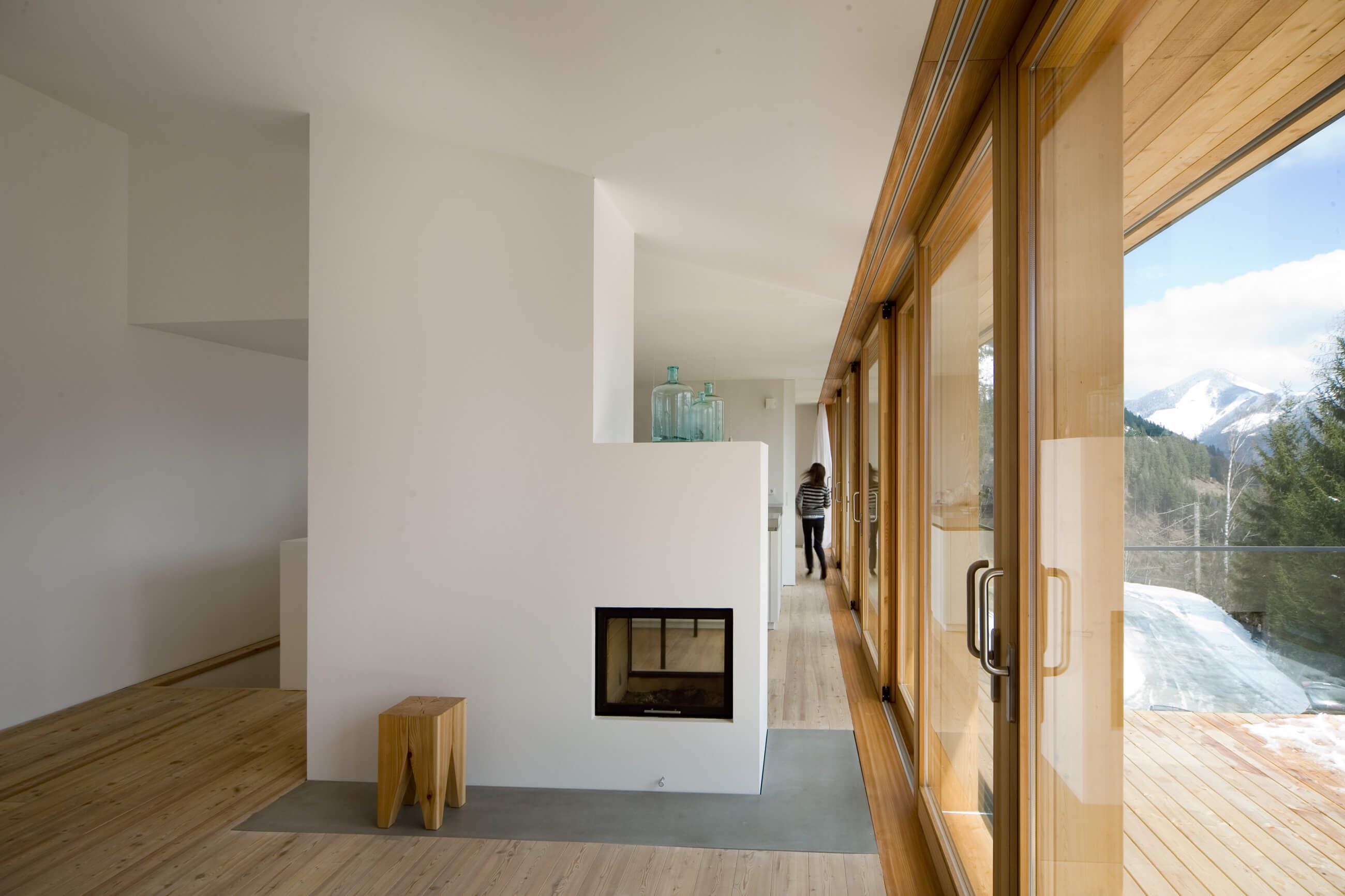 Im Haus sind zwei Wohnungen, die eine introvertiert, ein Patio, ein Alkoven ausgekleidet mit grauem Loden – sie lehnt sich gegen den steilen Hang. Der rohe, steinerne Boden aus Gneis ist polygonal verlegt. Mit bloßen Füßen ist der Fels zu spüren, auf dem das Haus steht. In die weißen Wände sind die Fensteröffnungen tief eingeschnitten und geben dem Ausblick in die Landschaft einen Rahmen.