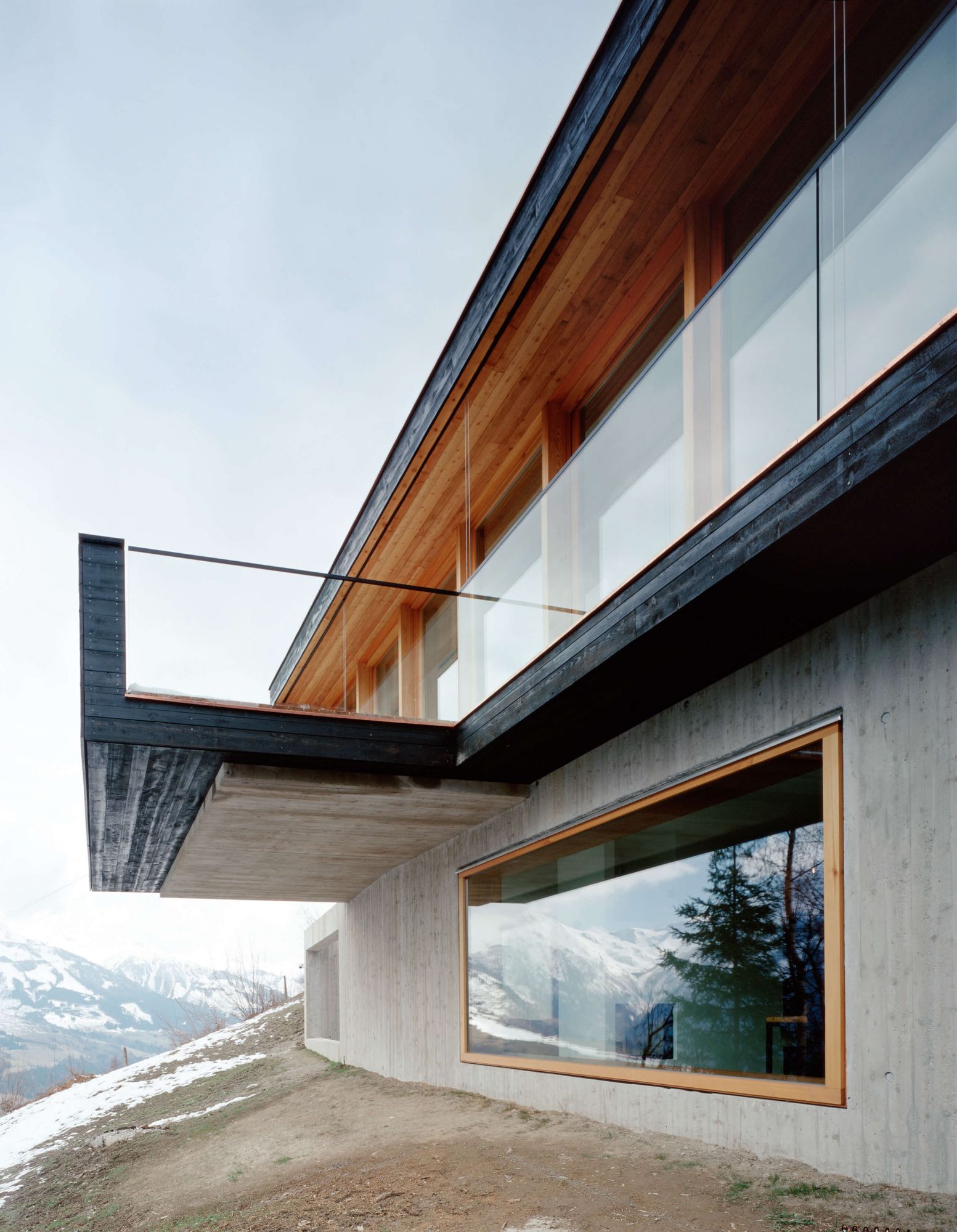 Ein steiler Hang, ein kleines Haus am Berg, 1113 Meter über Normalnull. Der Blick geht nach Süden auf Gletscher und in zwei Täler. Dem Weg ins Haus folgt eine Mauer aus Stahlbeton. Die schützende Hülle aus Lärchenholzbrettern ist schwarz gestrichen.