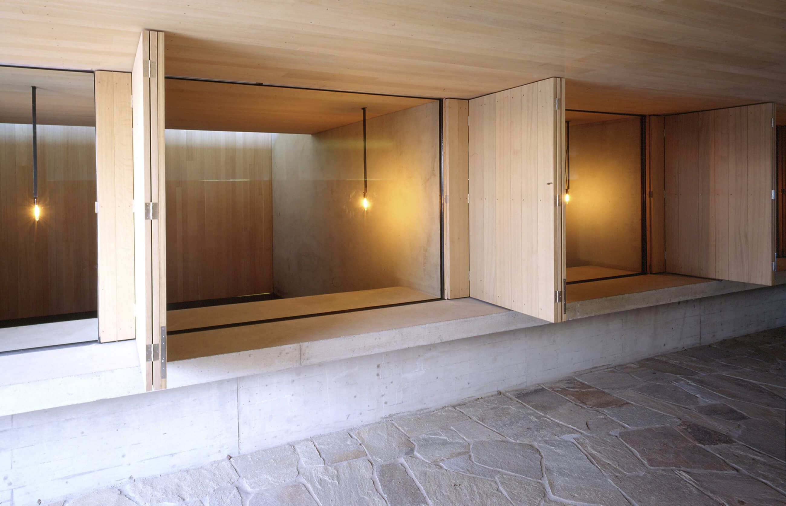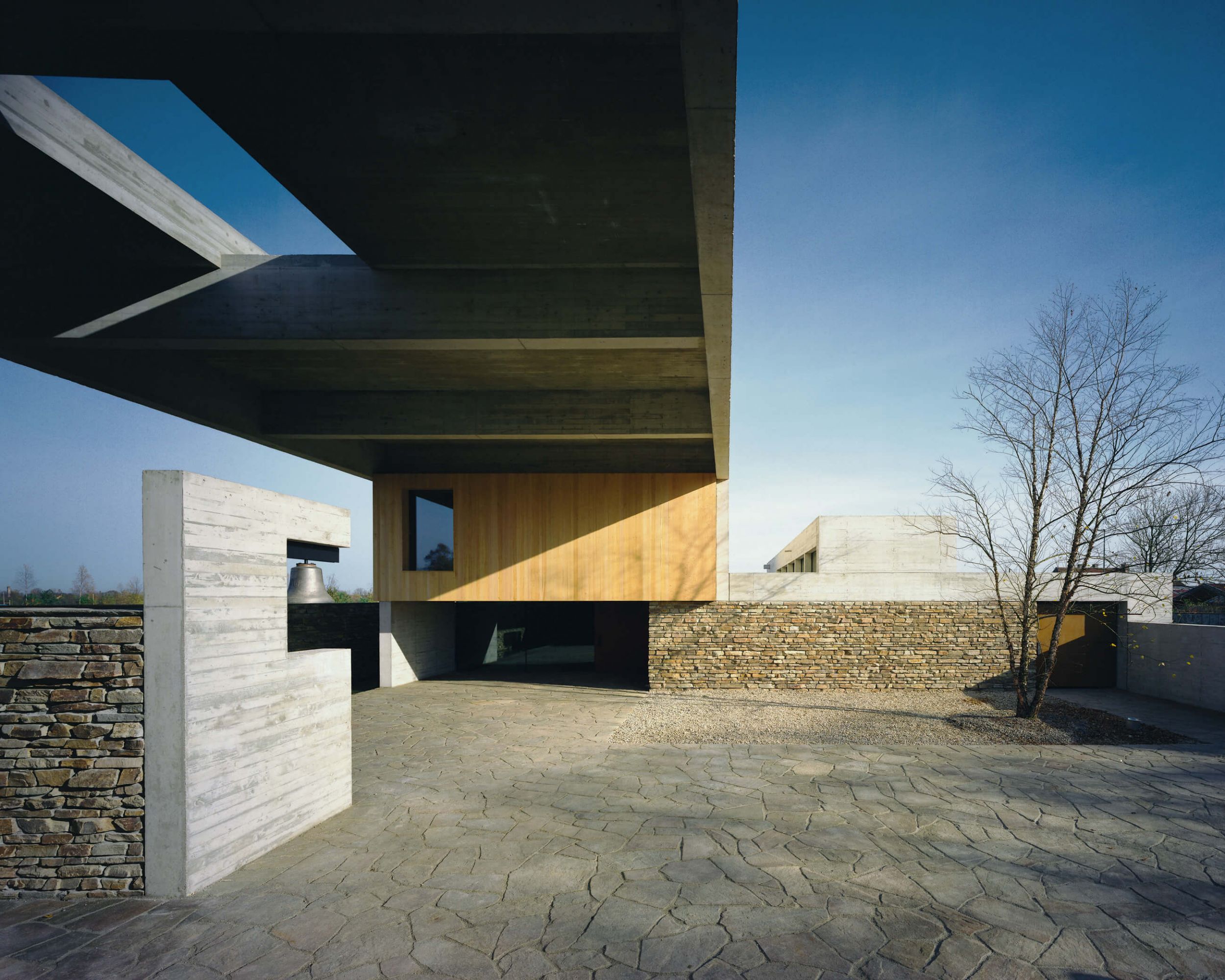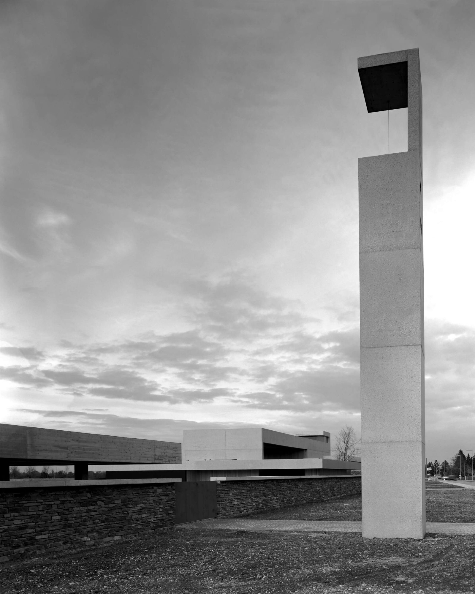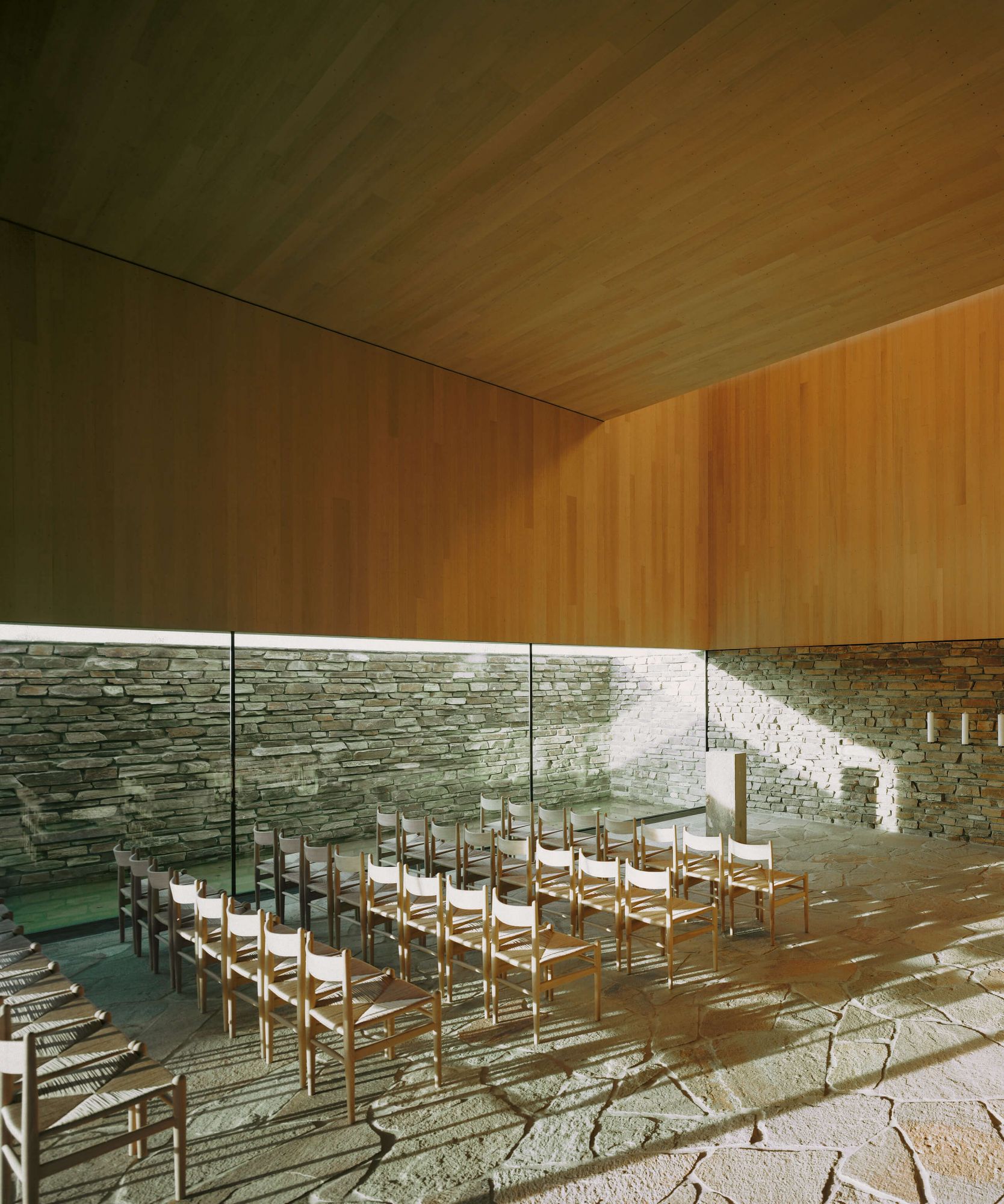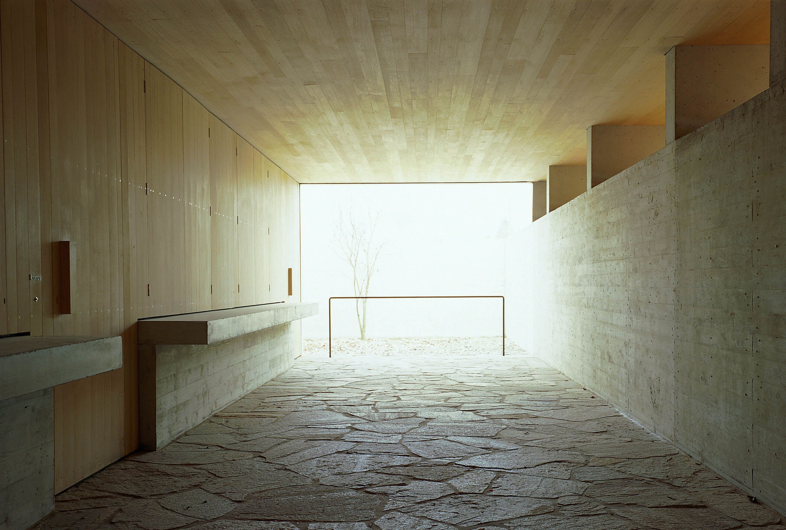 Eingespannt in einen Lindendom liegt die Aussegnungshalle zwischen altem und neuem Friedhofsteil. Sie ist unter ein bergendes Steindach gestellt, ein glatter Eichenholzkubus, ganz im Gegensatz zu den rauen, aus Bruchsteinen gemauerten Hofumfassungswänden und den Böden aus Stein. Die Stimmung in der Aussegnungshalle ist durch den warmen Holzton der Umfassungswände geprägt und hat einen introvertierten, sakralen Charakter, der durch die Vermeidung eines direkten Ausblicks entsteht. Eine goldene Wasserfläche verleiht als meditativer Blickpunkt dem Raum ein besonderes Licht und Atmosphäre. Von der Aussegnungshalle geht der Weg des Sarges über den gedeckten Vorhof am Wasser und an der Totenglocke vorbei über knirschenden Kies zum Friedhof.