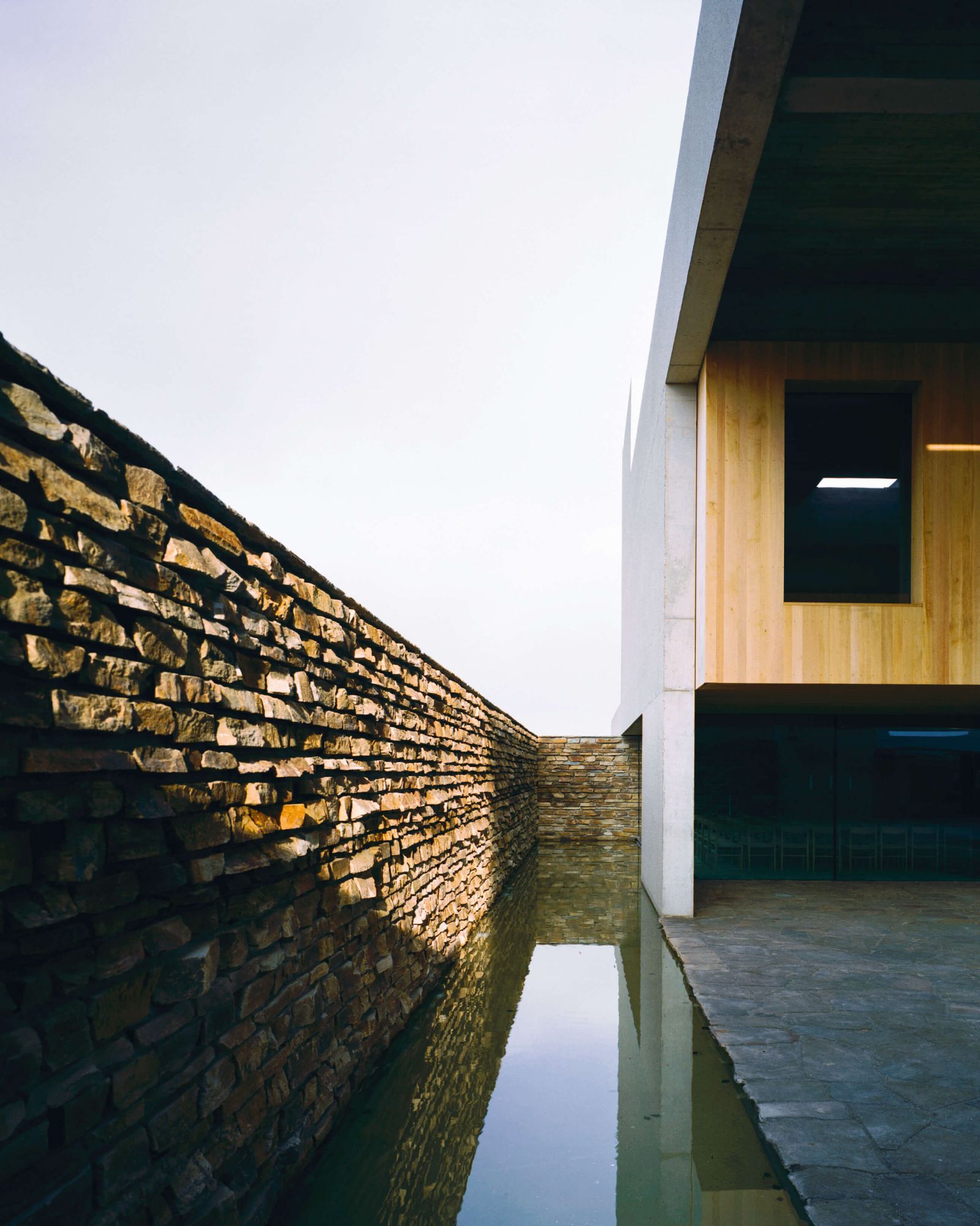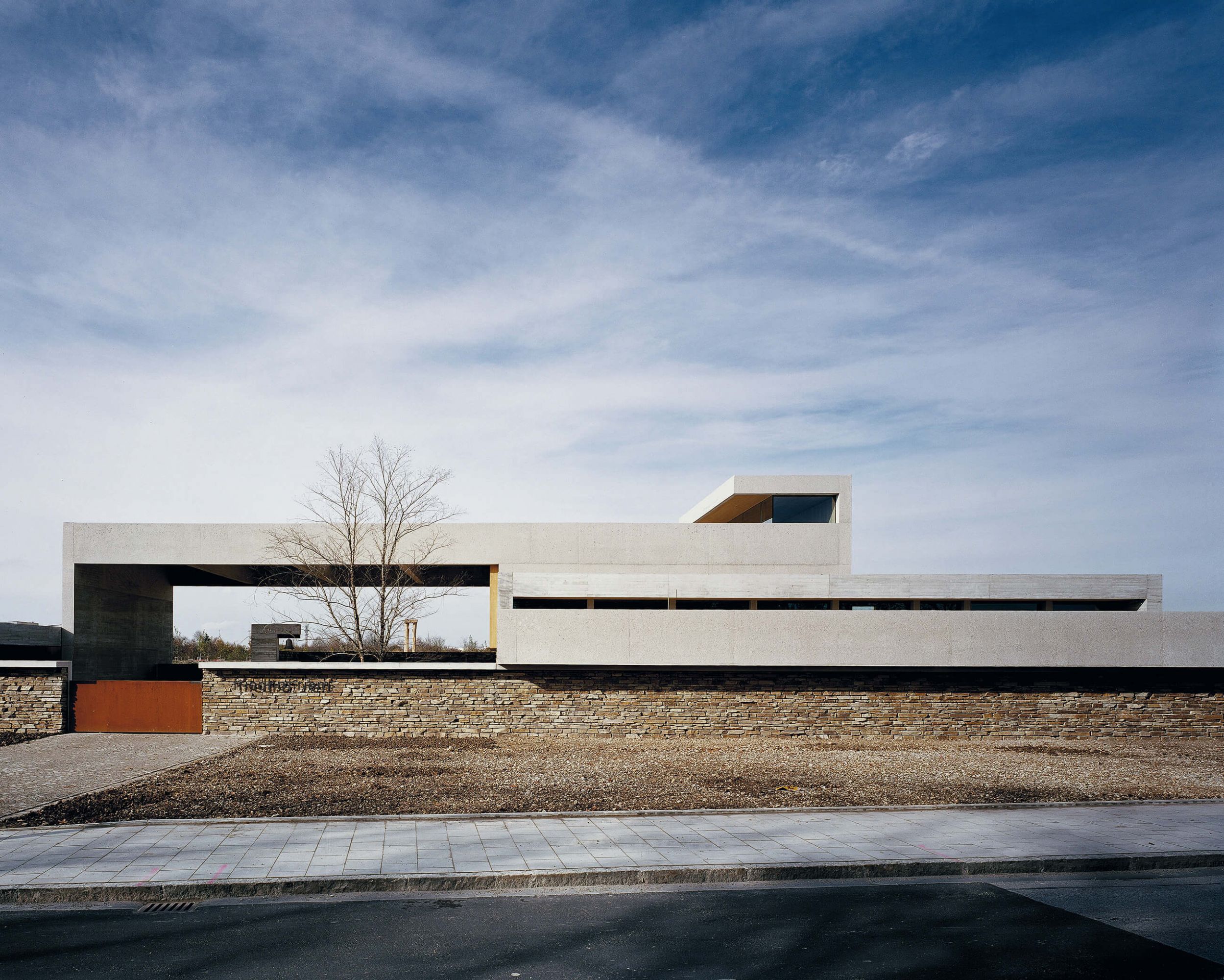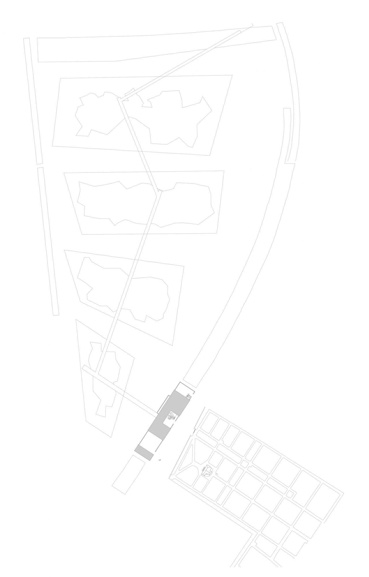 Die Bestattungsflächen treiben wie Toteninseln, leicht erhoben, in der umgebenden Wiesenlandschaft. Nach innen umgrenzen Trockenmauern die Grabfelder und lassen den Blick nur in die Ferne offen. Wege verbinden die Schollen untereinander, mit der Aussegnungshalle und dem alten Friedhofsteil, Wasserstellen betonen die Knickpunkte.