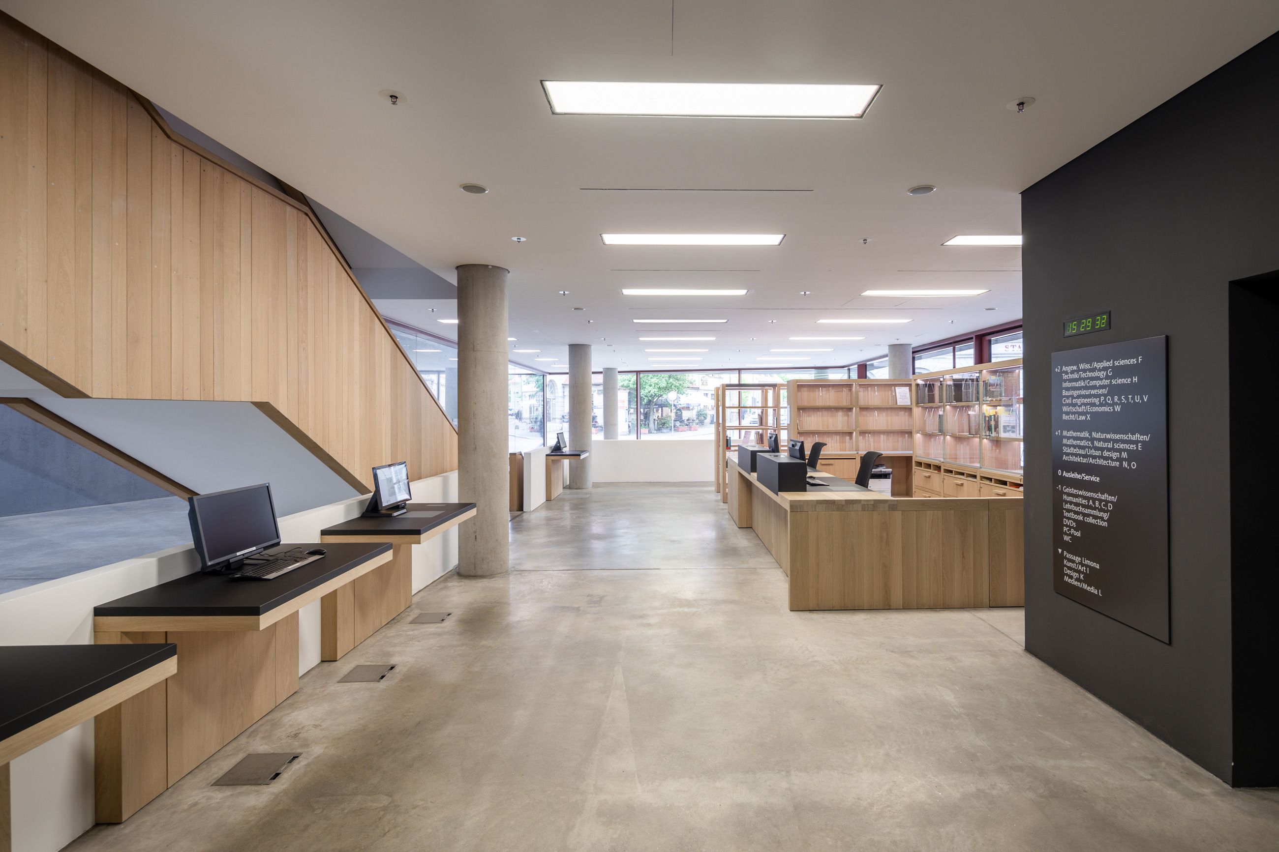 Als Fortschreibung des architektonischen Konzeptes zeigt sich der umgestaltete Ausleihebereich in massivem Eichenholz und behält somit die bibliotheksinterne Analogie zur „hölzernen Anna-Amalia-Bibliothek“ bei. Als Kontrast dazu dient der bestehende Boden aus grauem Hartstoffestrich und die Intarsien im Mobiliar aus matt-schwarzem Super-Nanotech-Material. Durch die offenen Regale und die transluzenten, mit Schrift bedruckten Glasvitrinen bleibt der Ausleihebereich von allen Seiten einsehbar und erlebbar.