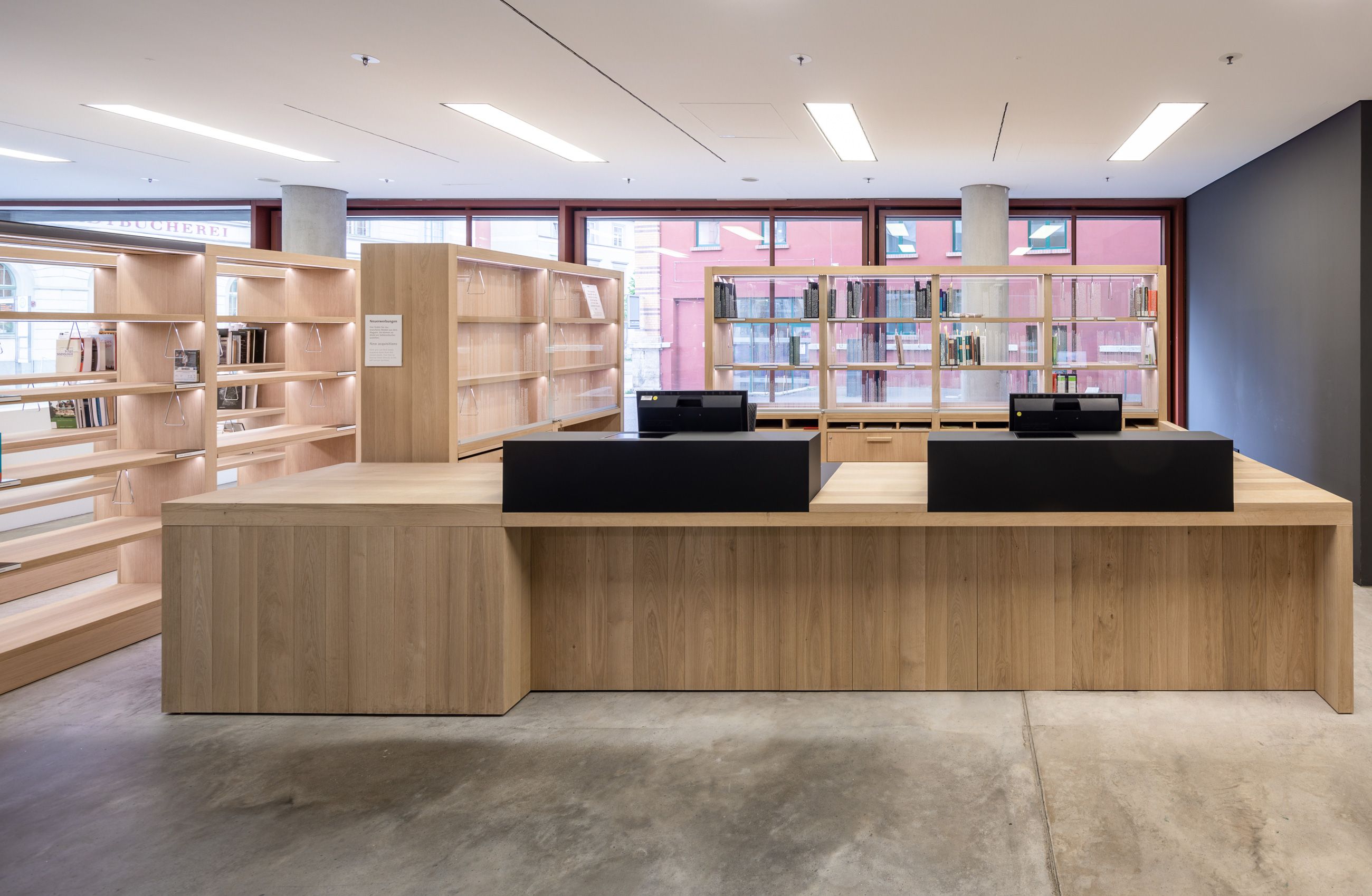 Obwohl die Bibliothek zukünftig auf eigenhändiges Verbuchen setzt, behält sie mit den verbleibenden Arbeitsplätzen eine persönliche und einladende Adresse. Für die Bibliotheks-Mitarbeiter:innen entstehen zwei qualitätvolle, großzügige Arbeitsplätze, die einen guten Überblick über den Ausleihebereich erlauben.