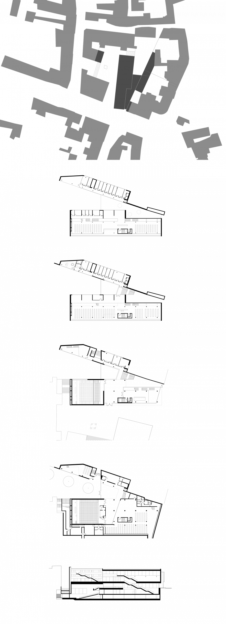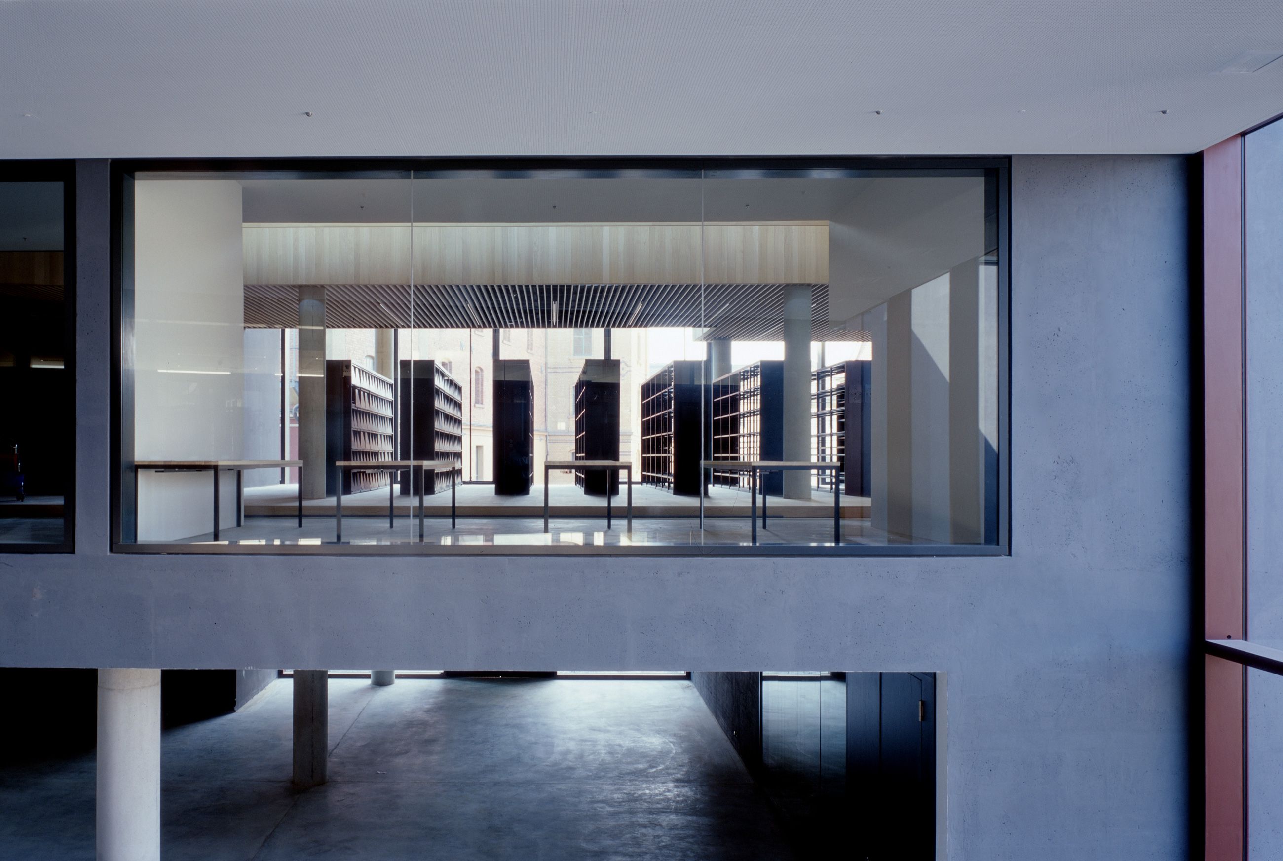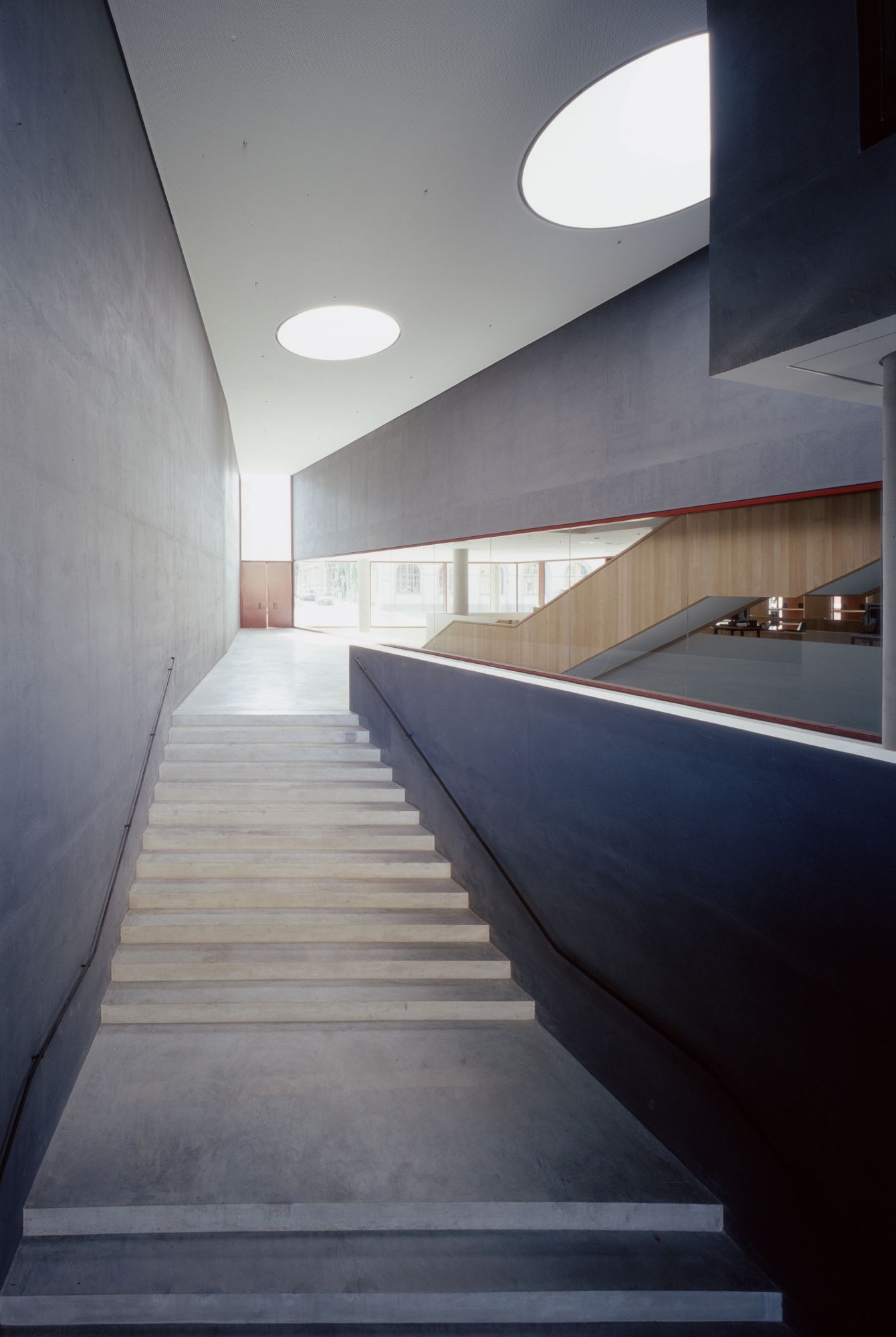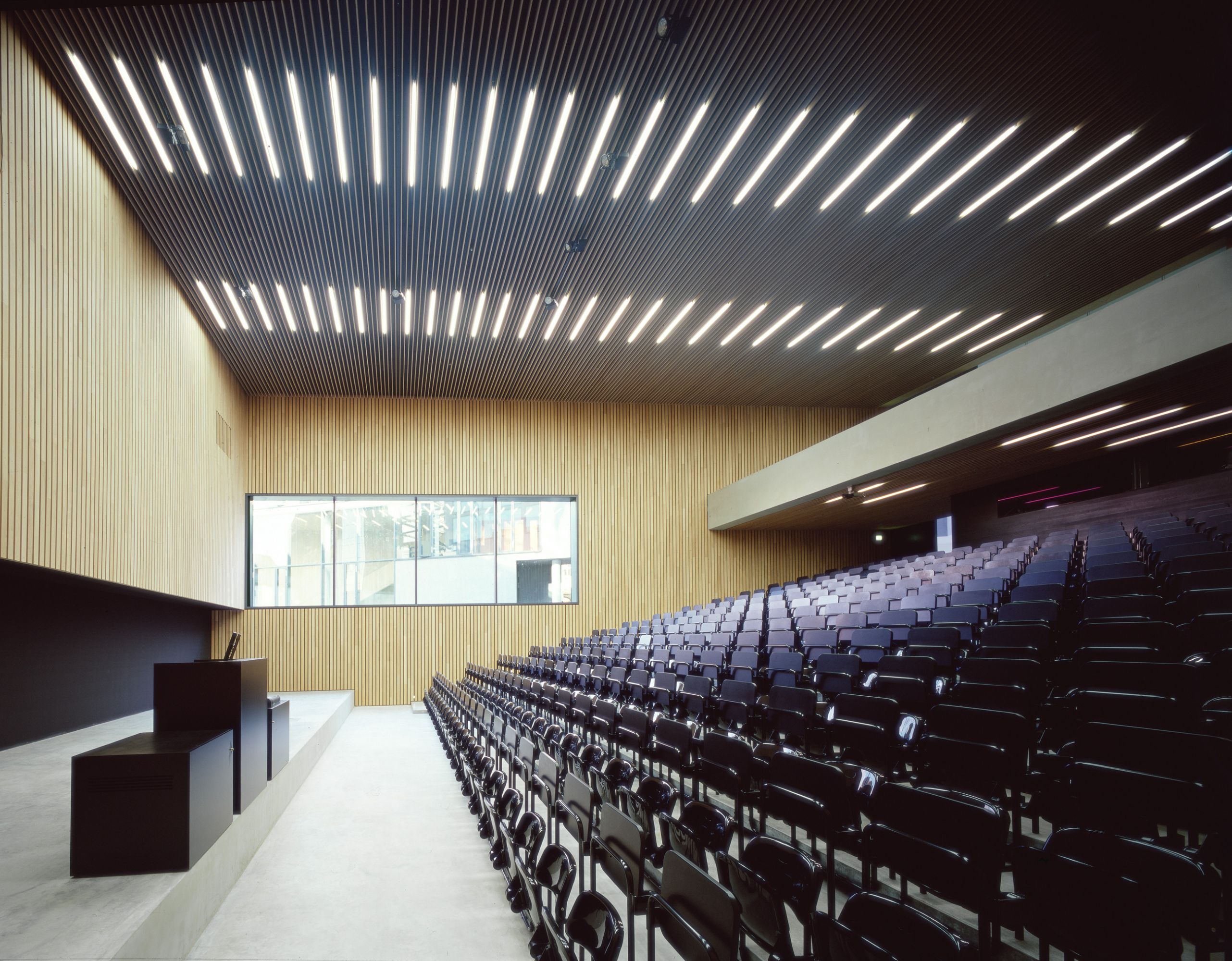 Das Volumen des Hörsaals folgt der fallenden Topographie und ist in den Geländesprung integriert: Es entstehen zwei Zugangsbereiche – einer auf Ebene der Bibliothek und einer mit öffentlichem Foyer auf der Ebene des Hörsaals. In der Gestaltung lehnt sich der Baukörper an das Bild eines Bücherregals an: In einen großen Rahmen sind über die Geschosse Regalreihen eingestellt wie Bücher in Regalböden.