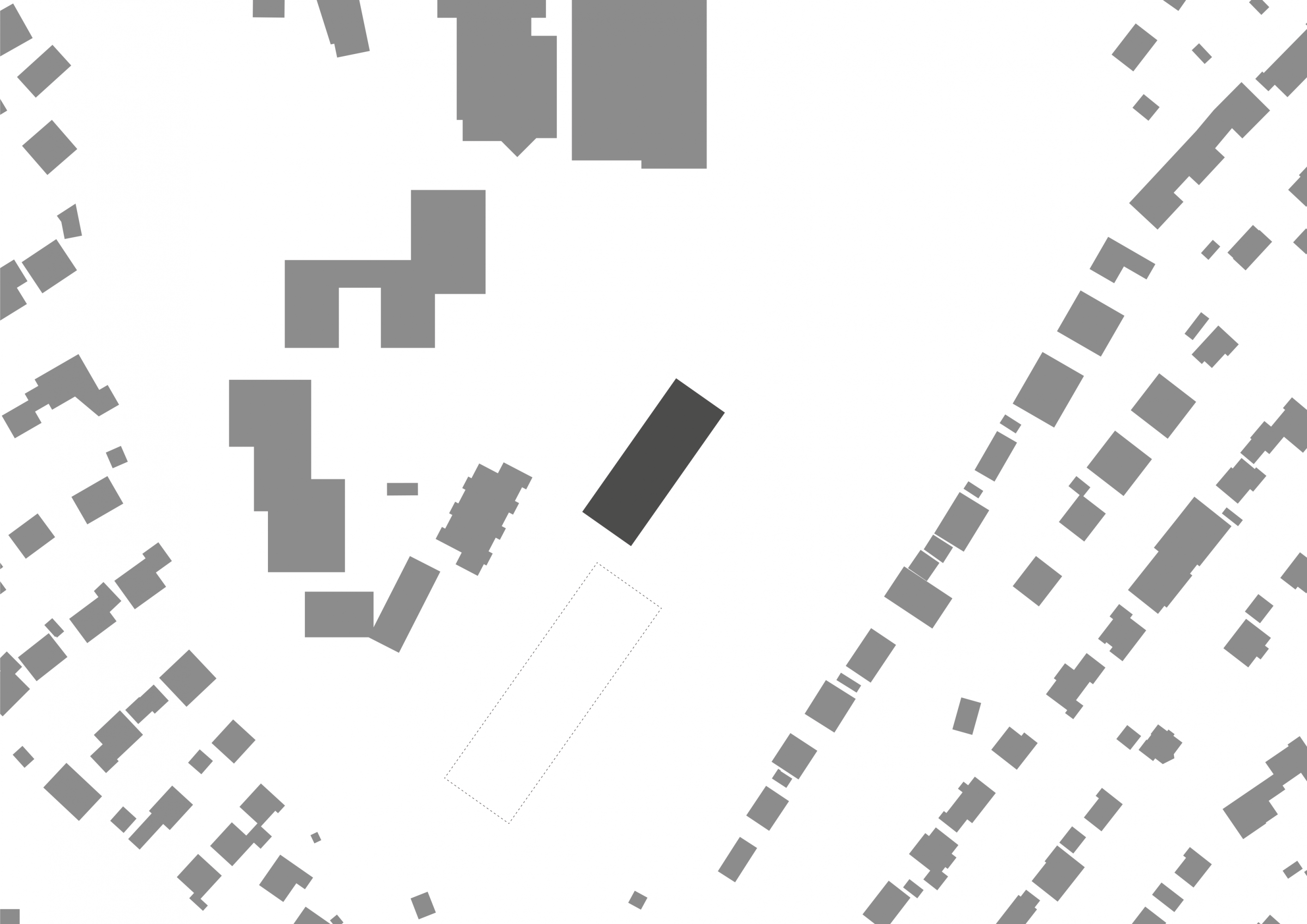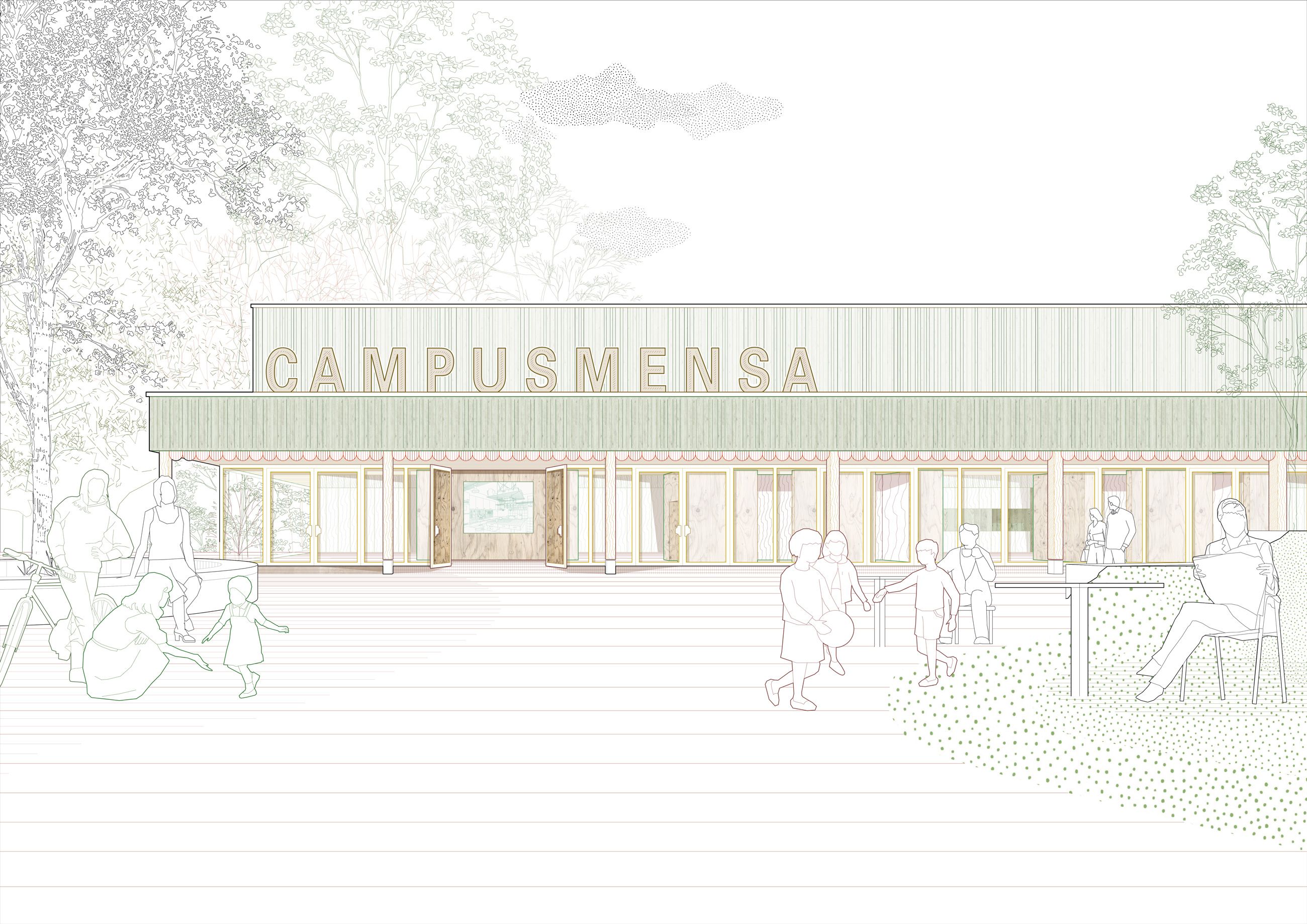 Die Setzung der Baumasse folgt der natürlichen Hangkante. Der in seiner Höhenentwicklung differenzierte, aber gleichsam ruhige und unaufgeregte Baukörper ist als Langhaus konzipiert und respektiert den Festzelt-Standort. Auch bei aufgestelltem Festzelt bietet sich ein ungehinderter Blick. Die Campusmensa wird von den bestehenden Bäumen umrahmt, die grundsätzlich erhalten bleiben.
