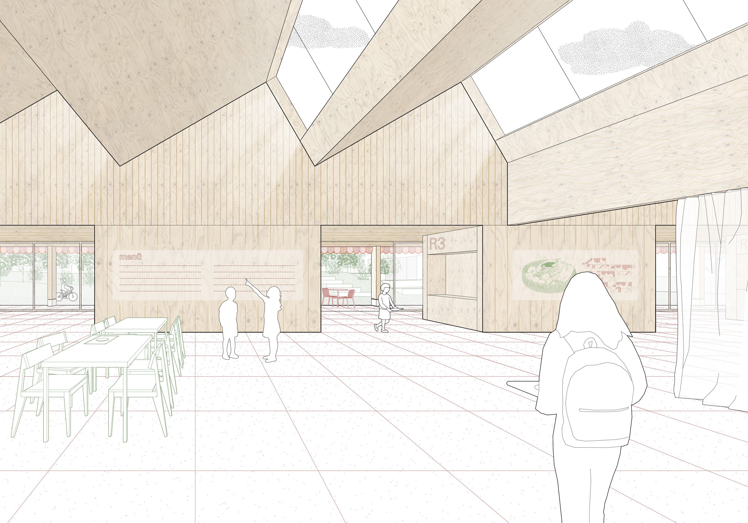 Im Inneren herrscht eine lichtdurchflutete, freundliche und ruhige Atmosphäre als Grundlage für eine erholsame Mittagspause. Innerer und äußerer Ausdruck werden durch die Holzbauweise bestimmt. Mit ihrer Logik und ihrem Raster entsteht eine der Bauaufgabe angemessene, unaufgeregte Einfachheit.