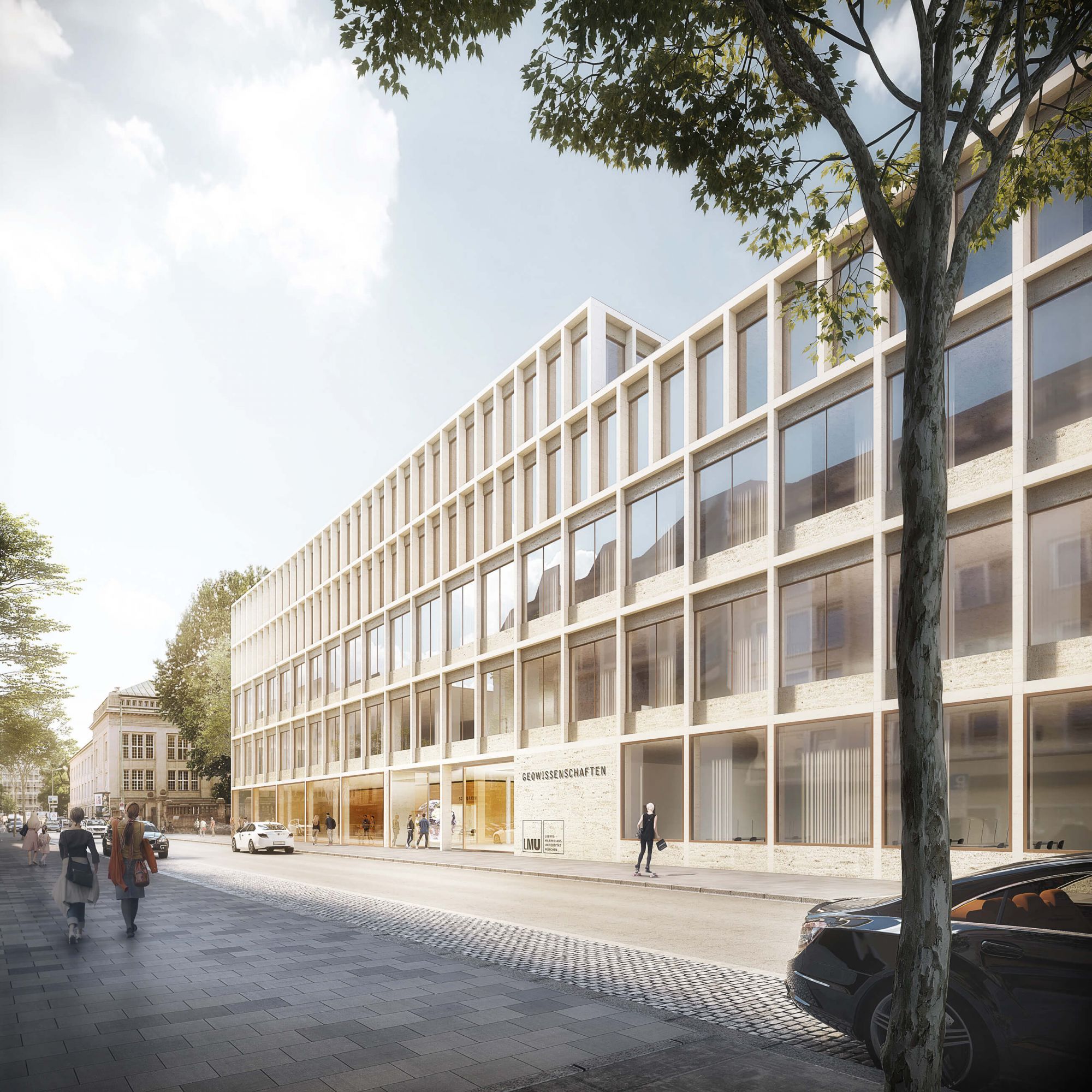 Die vorgeschlagene städtebauliche Konzeption reagiert mit einer differenzierten Höhen- und Tiefenentwicklung der Baukörper auf die vorgefundene Situation, um stadträumlichen und denkmalschutzrelevanten Aspekten Rechnung zu tragen. Sie orientiert sich dabei an den Baukörperprofilen der an das Grundstück angrenzenden Bebauung. An der Ecke zwischen Pettenkofer- und Schillerstraße artikuliert ein Vorplatz und fünfgeschossiger Hochpunkt den städtischen Auftritt des Departments der Geo- und Umweltwissenschaften und wird durch das hier angedachte Forum der Geowissenschaften adressbildend unterstützt.