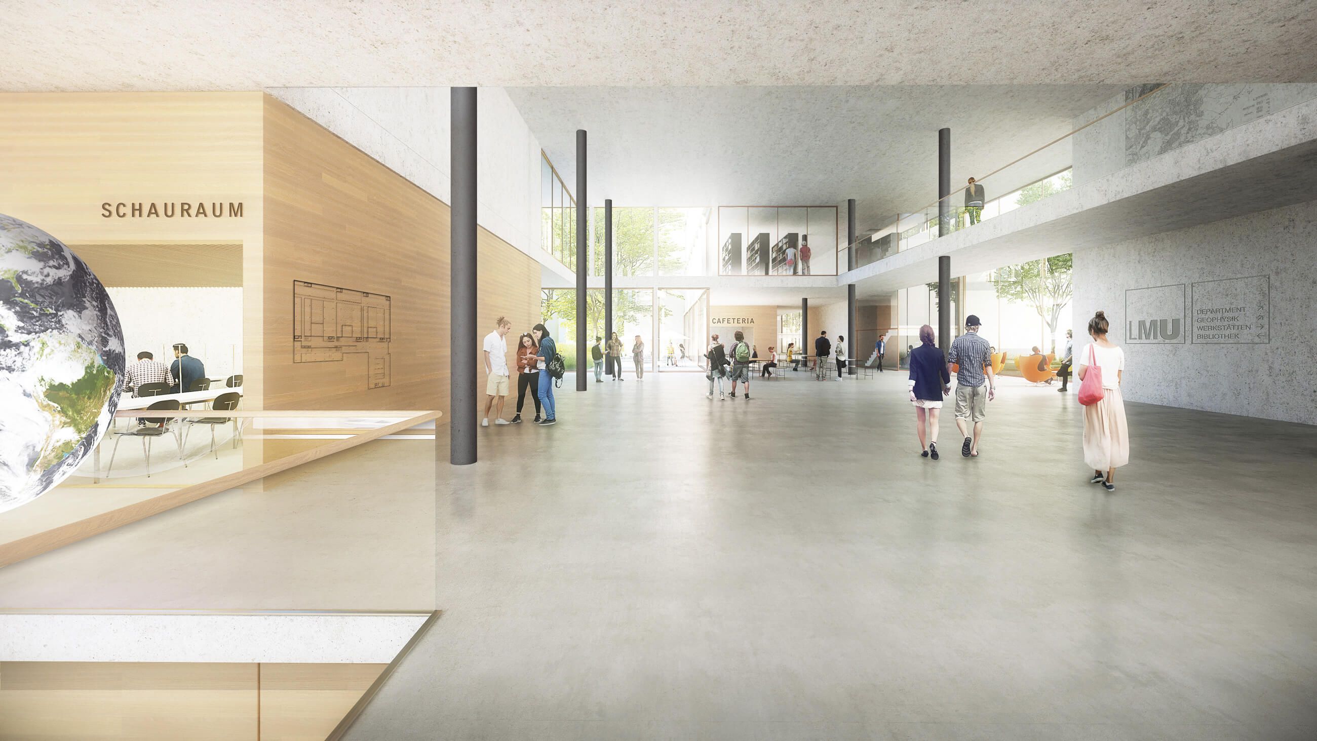 Das Foyer erhält durch Lufträume in verschiedenen Ebenen eine räumliche Kompexität mit attraktiven Raumsequenzen bis ins Untergeschoss. Von hier wird durch einen zusätzlichen Übergang zur Pettenkoferstraße die Nutzbarkeit und Flexibilität des Campus gesteigert. Über alle Geschosse hinweg vernetzt die "Magistrale" als Haupterschließung die öffentlichen und nicht öffentlichen Nutzungen und bietet dabei großzügige und vielseitige Ausstellungsmöglichkeiten für das Forum der Geowissenschaften. Dahinterliegend schafft eine zweihüftig organisierte Kammstruktur eine effiziente und flexible Labor- und Werkstattstruktur für die fünf Forschungseinheiten der Geo- und Umweltwissenschaften und die staatlichen naturwissenschaftlichen Sammlungen Bayerns. Es entsteht eine übergreifende, inhaltliche Verflechtung der angestrebten Nutzungen bei gleichzeitig klarer Abgrenzungsmöglichkeit der Funktionsbereiche. Die jeweiligen Büro- und Verwaltungsbereiche werden als geistige Krone in den obersten Geschossen angeordnet.