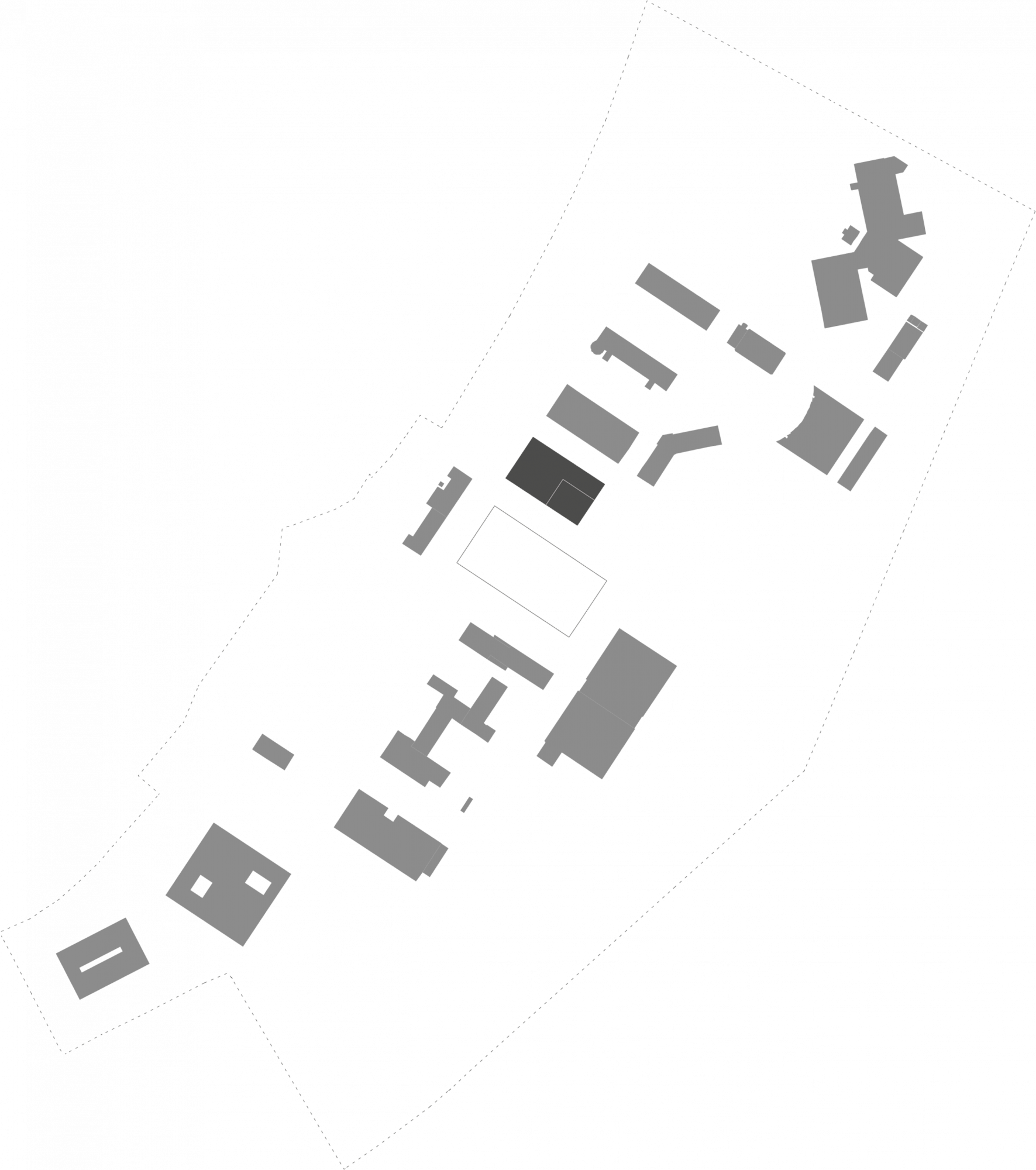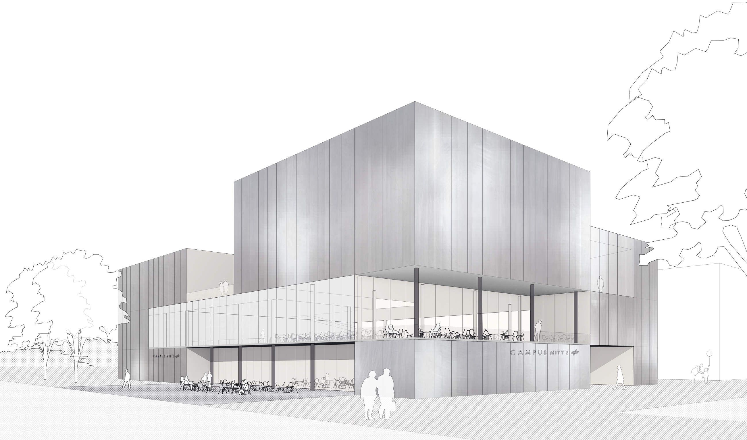 Die städtebauliche Setzung der Baumasse folgt einer integrativen Haltung. Die Rasterstruktur des Campus wird hierbei ebenso aufgegriffen und respektiert, wie der besonderen Lage des Baufeldes Rechnung getragen, als südlicher Schlusspunkt der Bebauung entlang der Haupterschließungsstraße. Die neue zentrale von einem Baumhain überstandene Freifläche bildet das adäquate Vorfeld der neuen Campusmitte.