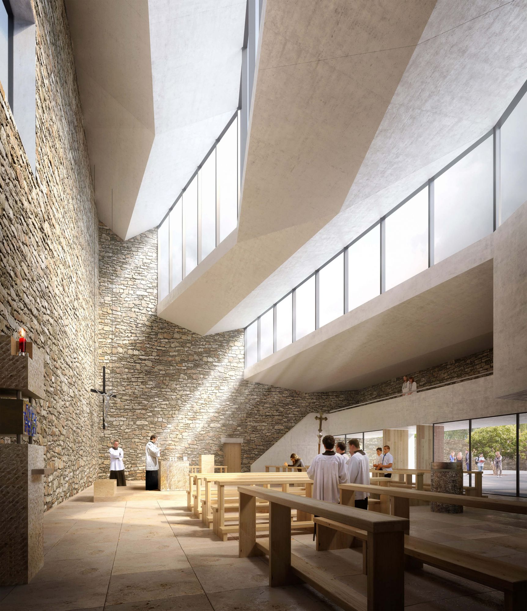 Die gewünschte franziskanisch zurückhaltende Gestaltung findet sich in der Wahl von einfachen, robusten Materialien wieder, welche sich an den bestehenden orientieren und durch weitere lokale Baustoffe ergänzt werden. Die naturbelassenen, unbehandelten Materialien verleihen dem Raum ein besonderes Licht und Atmosphäre. Der Baukörper ist als hoch wärmegedämmter Massivbau konzipiert. In Verbindung mit den damit verbundenen Speichermassen können im Rahmen des Passivkonzeptes die Heizkosten mit einfachsten Mitteln dauerhaft niedrig gehalten werden.