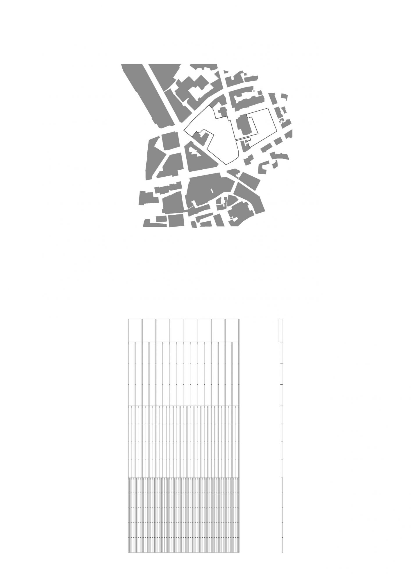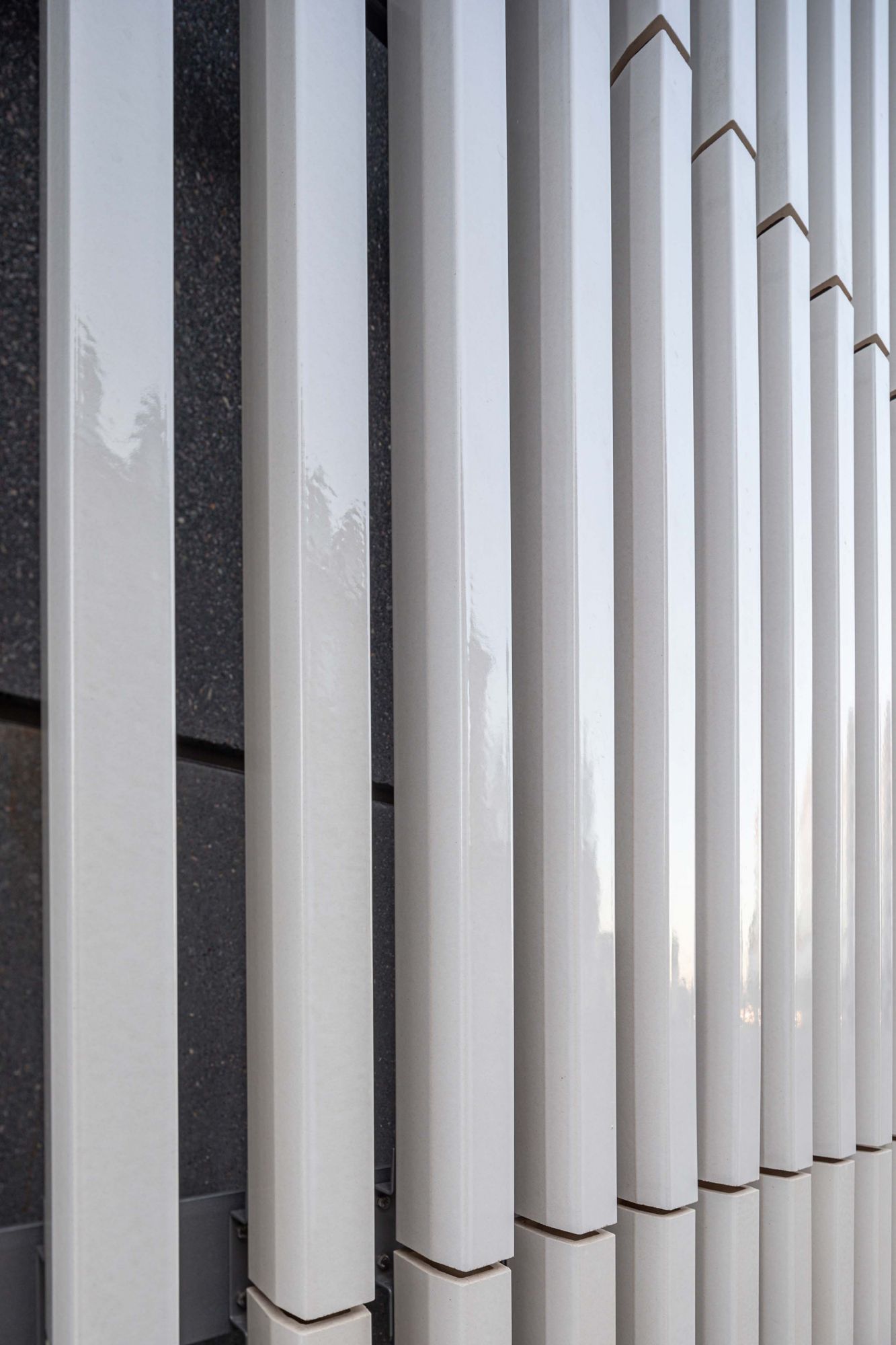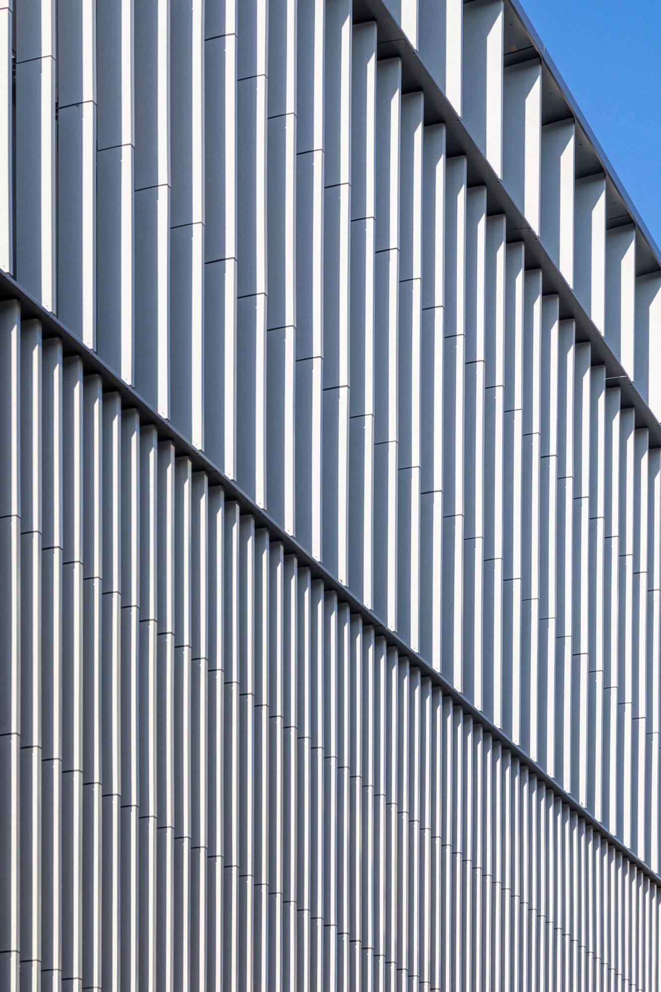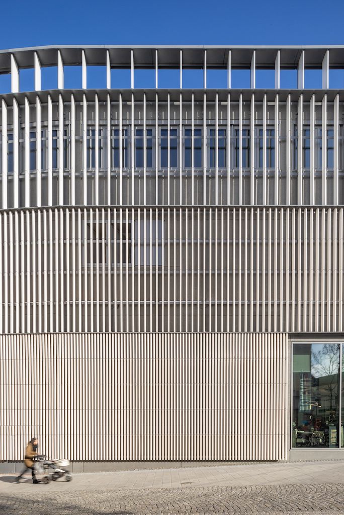 Durch die Reihung der stabförmigen Keramikelemente und die nach oben hin stufenweise gestaffelte und abnehmende Dichte des keramischen Kleides entstehen vertraute städtische Elemente der vertikalen und horizontalen Gliederung, die eine sympathische Maßstäblichkeit sicherstellen.
