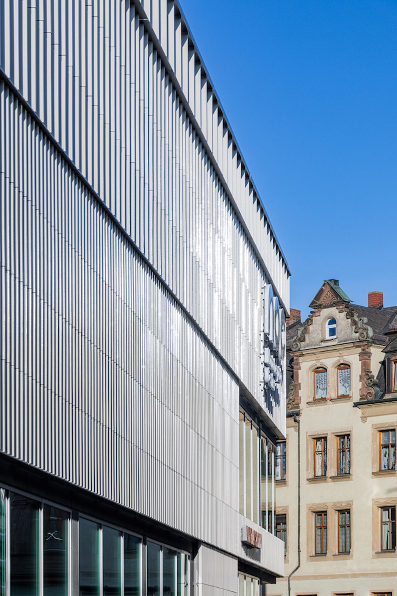Bei Tageslicht wirkt die Keramikoberfläche als Lichtfilter und außenliegende Verschattung. Nachts wechselt die Lichtsituation: Das Gebäude leuchtet von innen heraus und erlaubt Einsicht in Struktur und Inhalt. Die massiven Außenwände aus dunkel eingefärbtem Stahlbeton schmiegen sich mit ihren ruhigen, großformatigen Lochfassaden an den Charakter der historischen Massivbauten an, die das Bild der Weidener Altstadt prägen.