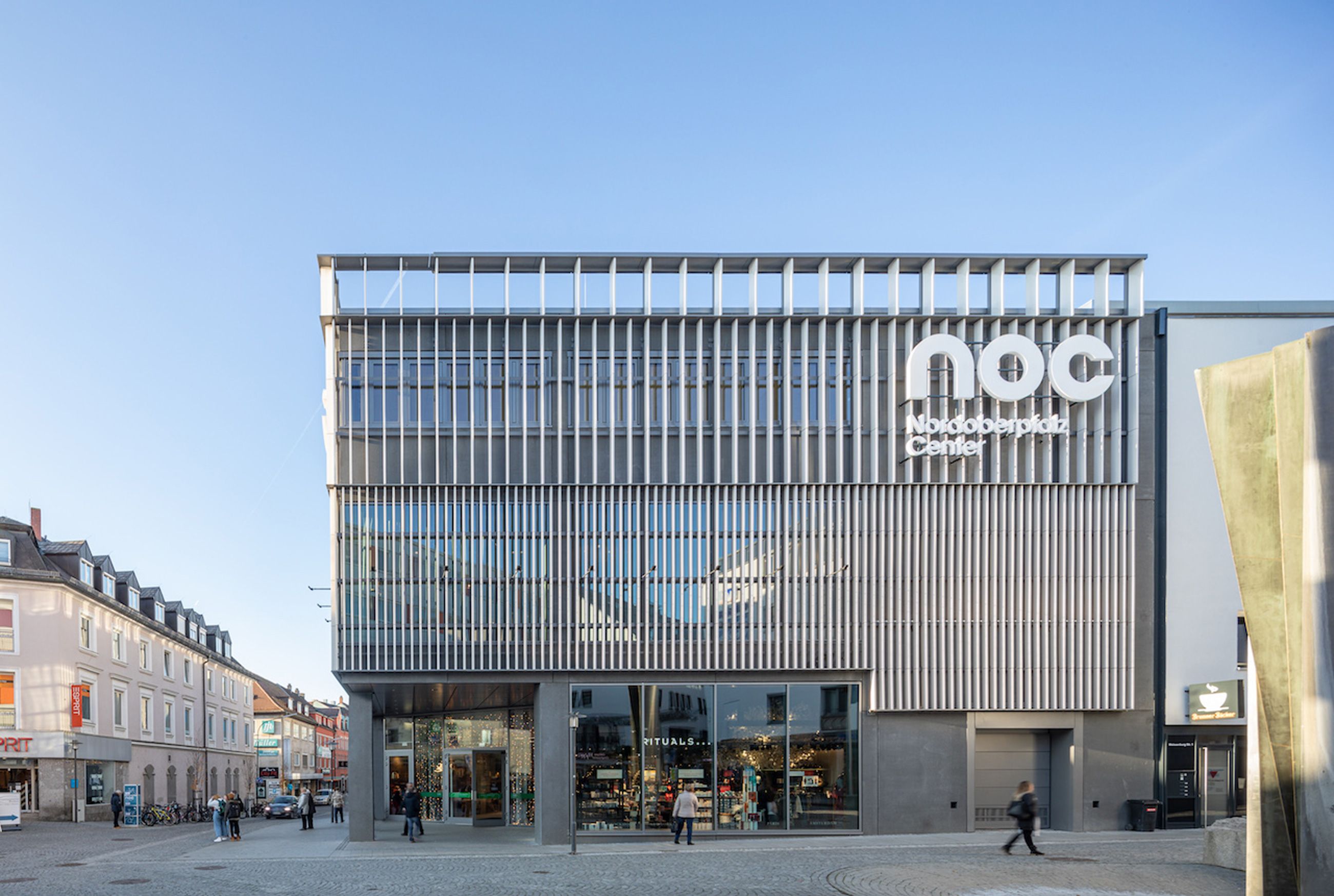 Dem historischen Bezug der Stadt Weiden als Standort der Keramikherstellung entlehnt, bestimmt die den massiven Außenwänden vorgehängte, offene und in ihrer Struktur semi-transparente Bekleidung aus seriellen, weiß glasierten Keramikelementen die Erscheinung der Fassaden. Mit dieser Hülle und dem irisierenden Spiel aus Licht, Schatten und Spiegelungen darauf wird das Nordoberpfalz Center zum identifizierbaren Gebäude und zur besonderen Adresse in Weiden: einer neuen Kathedrale des Handels.
