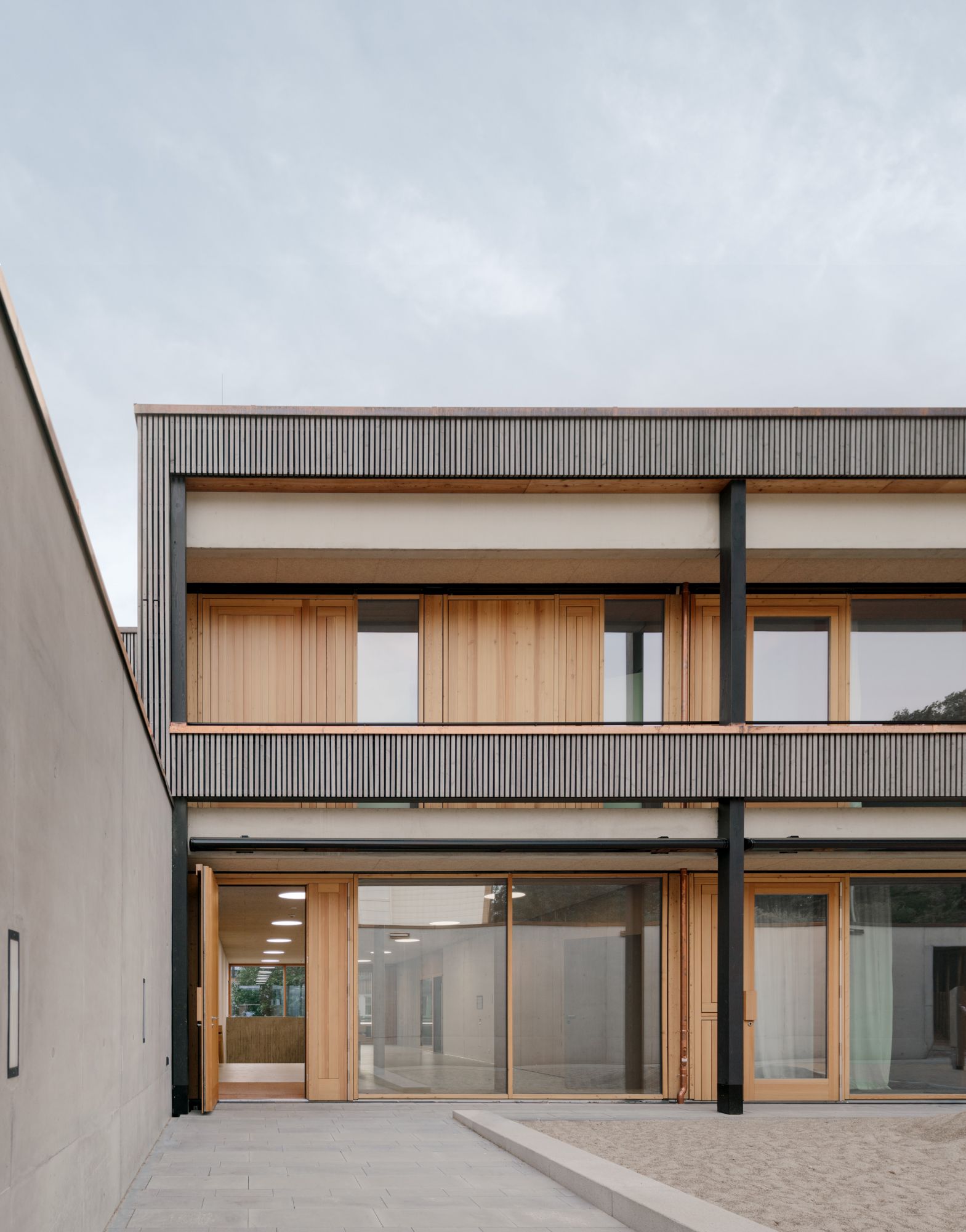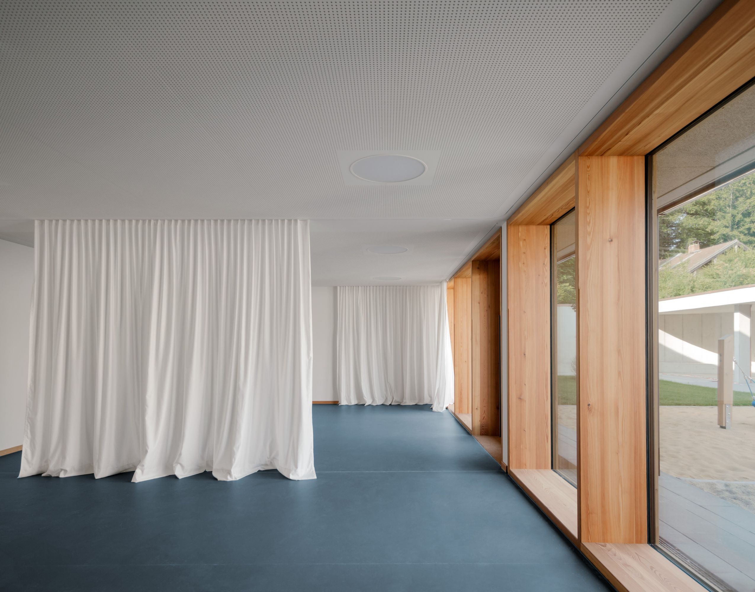 Die Bekleidung der Außenwände mit einer vertikalen Leistenschalung aus Lärchenholz verleiht dem Kinderhaus eine ehrliche Haut. Auch den Innenräumen schenken natürliche Materialien – Massivholz und Natursteinböden aus Jurakalk – eine qualitative, ehrliche Haptik, die die Räume für Kinder begreifbar macht. Bodentiefe Fenster fluten das Gebäude mit Tageslicht und öffnen einen ungehinderten Ausblick nach draußen.