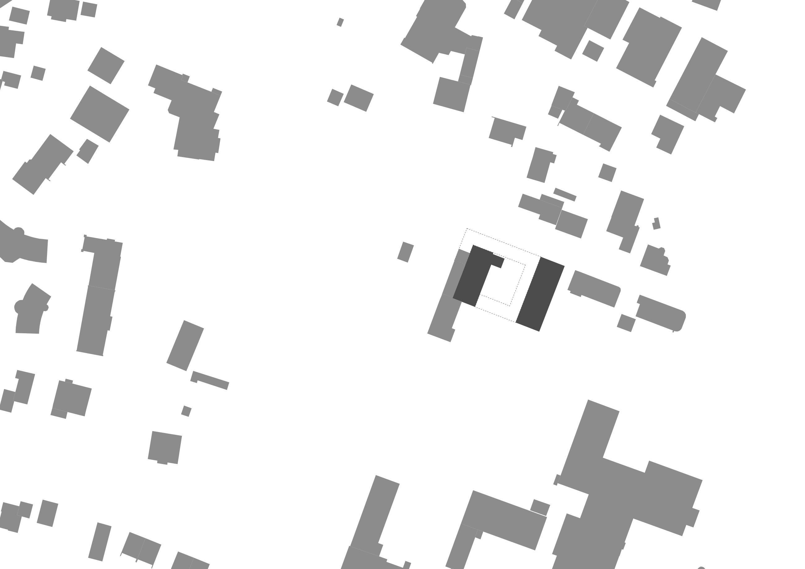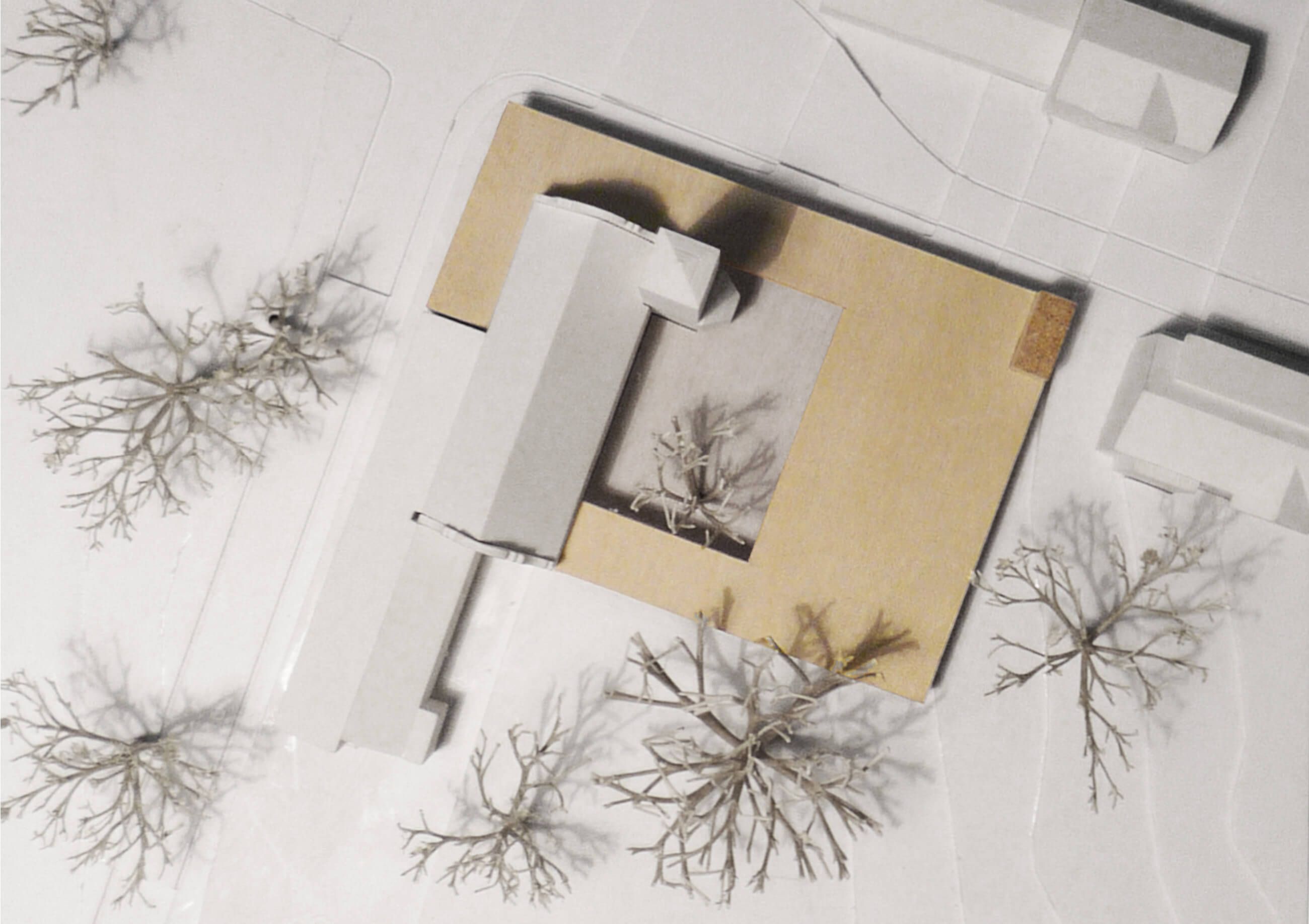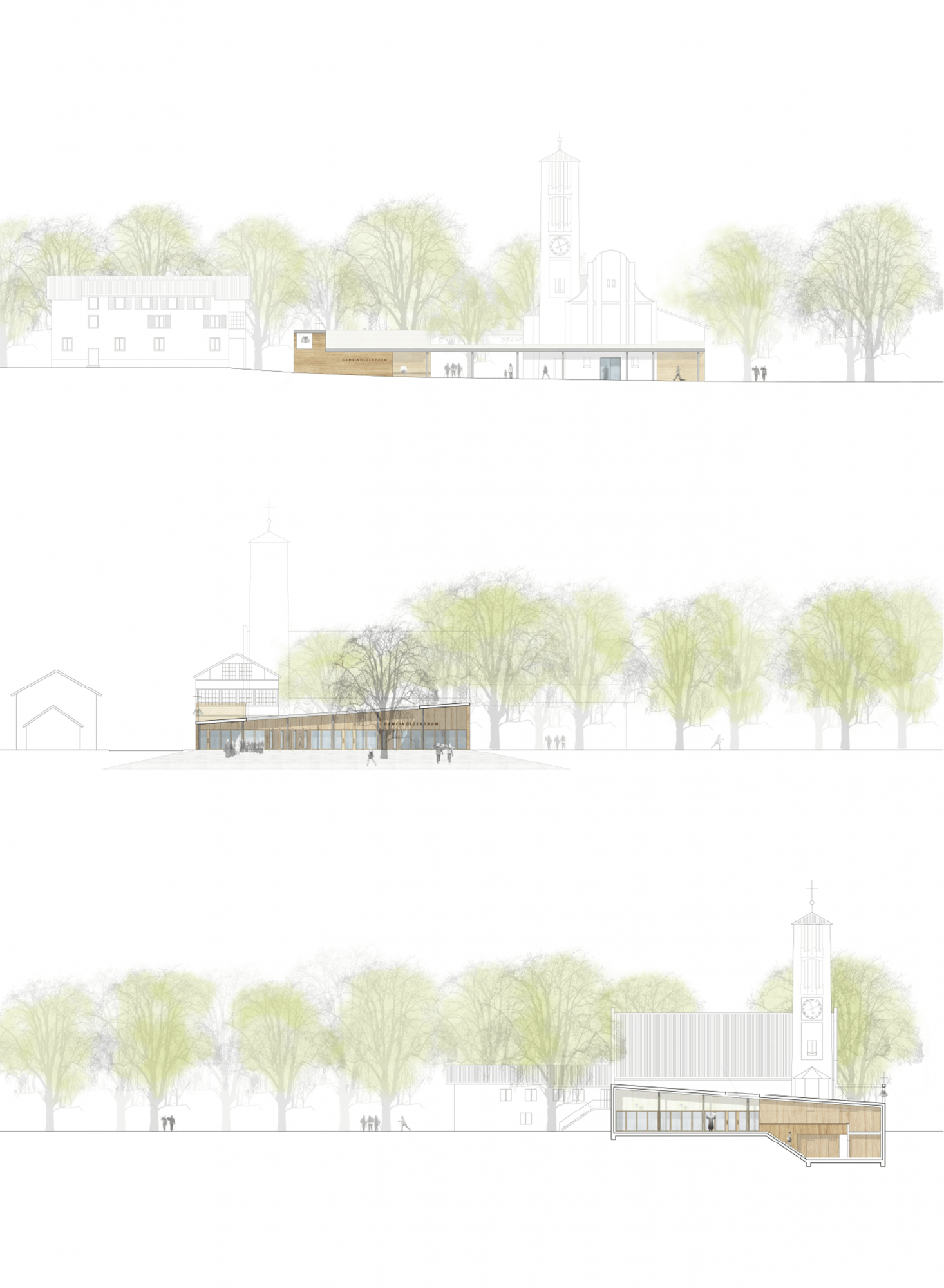 Der von uns konzipierte Neubau zeigt sich als ruhiger, unaufgeregter Baukörper mit flach geneigtem Dach, welches sich zum Kurpark hin öffnet. Die unterschiedlichen Nutzungseinheiten und Räumlichkeiten werden in einem äußerst kompakten und multifunktionalen Baukörper zusammengefasst. Die innere Organisation des Neubaus ist von einem Höchstmaß an Flexibilität bestimmt. Unterschiedlichste Nutzungsszenarien werden über die Zusammenschaltbarkeit einzelner Räume und Raumgruppen ermöglicht, die einzelnen Räume bleiben hierbei stets eigenständig nutzbar und können gegebenenfalls auch fremdvermietet werden. Die Raumabfolge ist der Dachneigung folgend mit zunehmenden Raumgrößen gestaffelt. Damit gelingt es uns für jede Raumgröße eine angenehme Raumproportion zu erzeugen. Bei großen Festen kann das gesamte Gemeindehaus auf den teils überdachten Kirchplatz erweitert werden. Überschattet von einem Baum, besitzt die gemeinschaftliche Freifläche bei jeder Witterung eine hohe Aufenthaltsqualität.