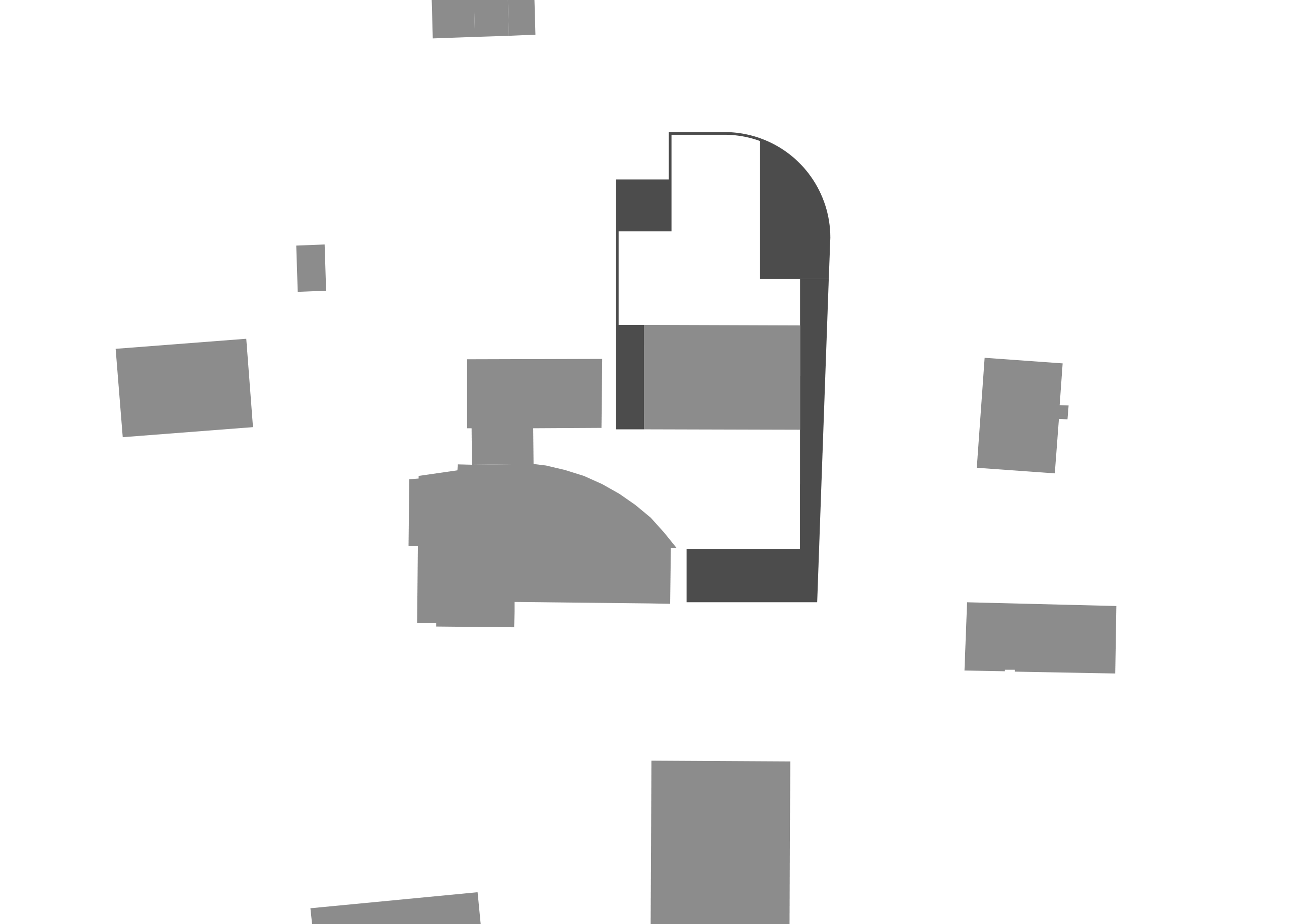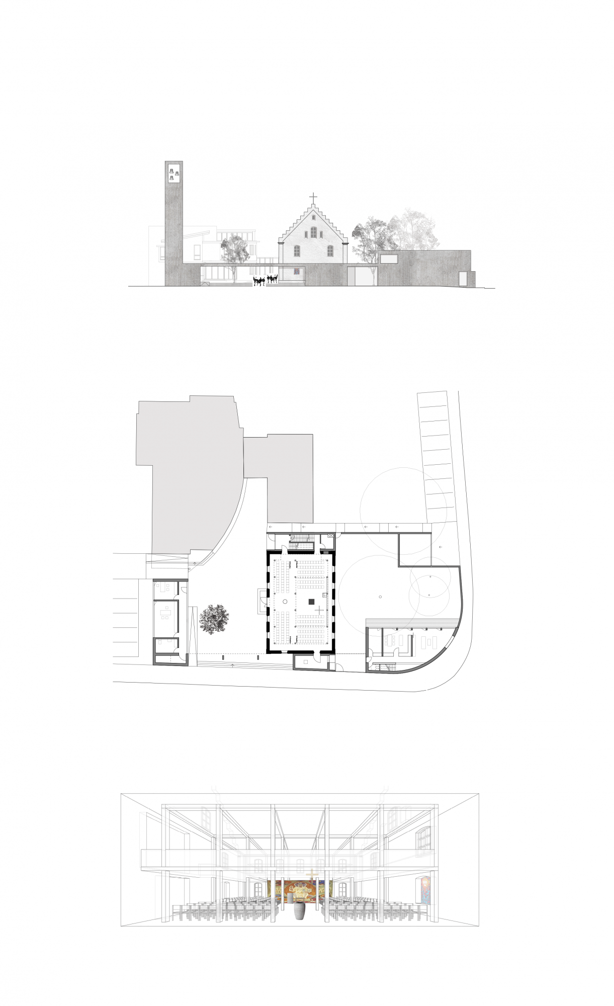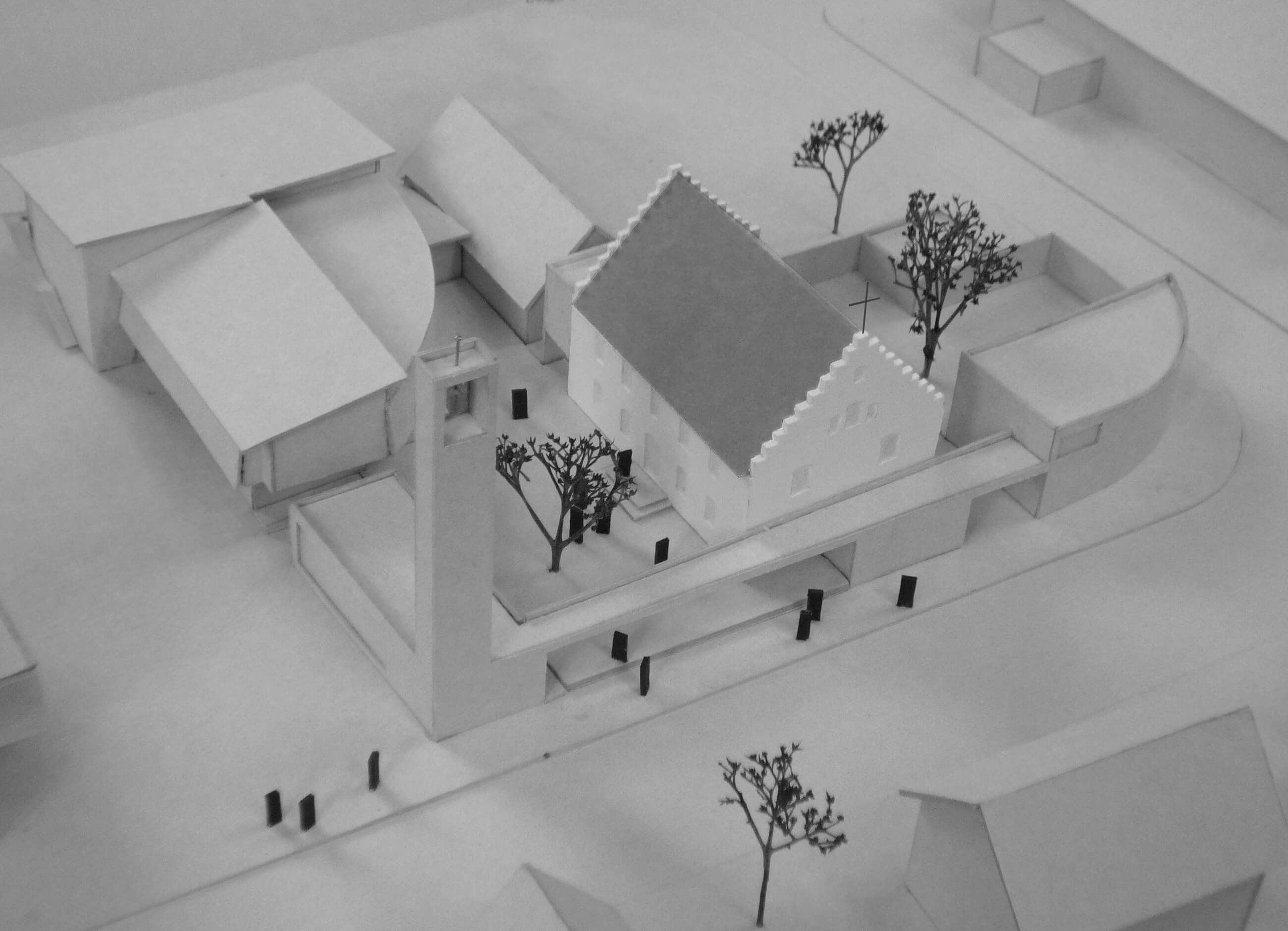 Die von uns entwickelte Raumkonzeption für die neue Kirche bewegt sich im Spannungsfeld zwischen der alten, denkmalgeschützten Substanz und den neuen Eingriffen, die im Zuge der Umnutzung zum Sakralraum mit seinen spezifischen Anforderungen notwendig werden. Gemäß der Auslobung zum vorausgegangenen Wettbewerbsverfahren wird das denkmalgeschützte Pfarrhaus zur Kirche (sakrale Nutzung) umgestaltet. Flankierende, giebelseitig angelehnte Ergänzungsbauten beherbergen die Erschließung und die dem Kirchenraum dienenden Räumlichkeiten wie Sakristei und Lager.