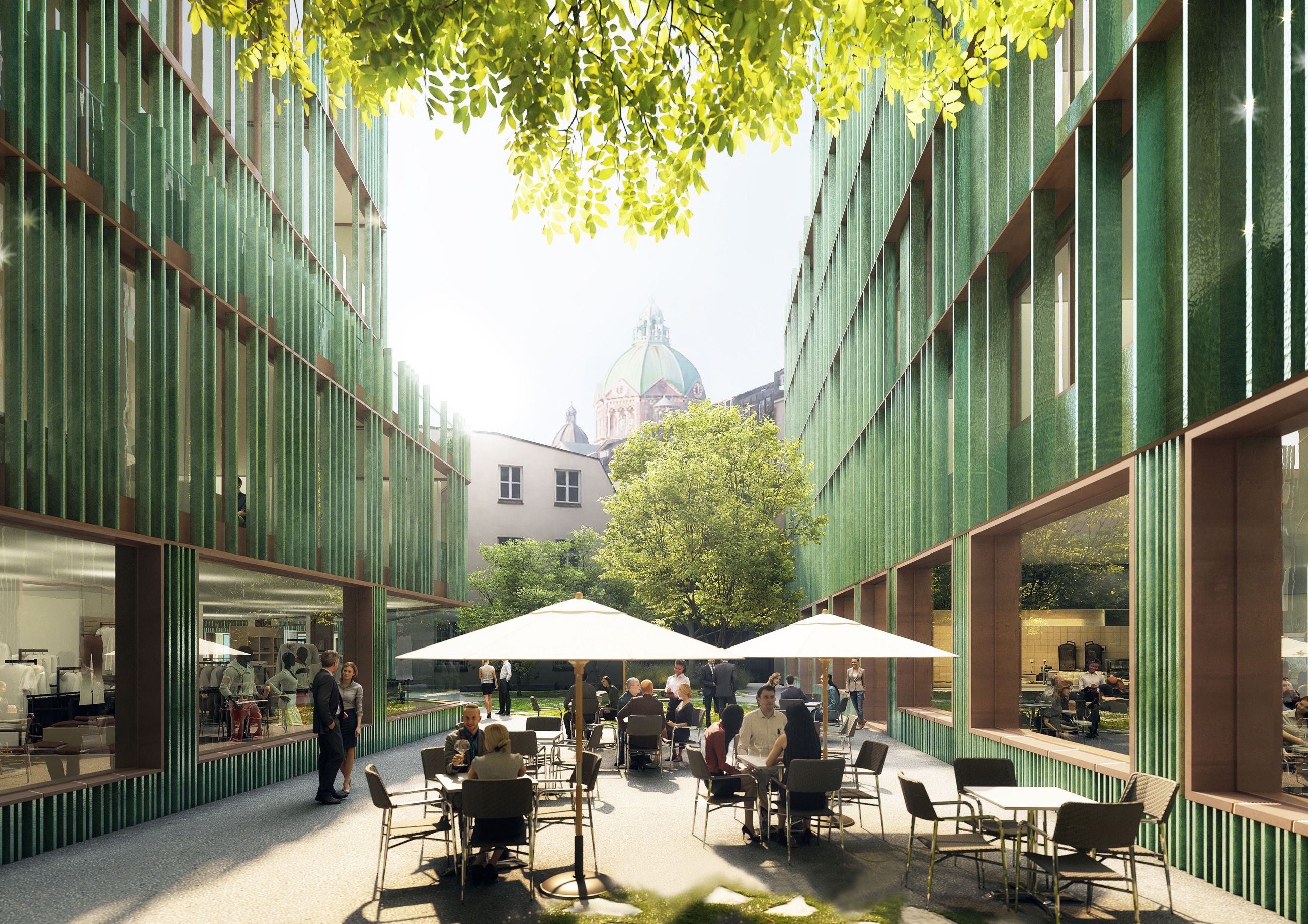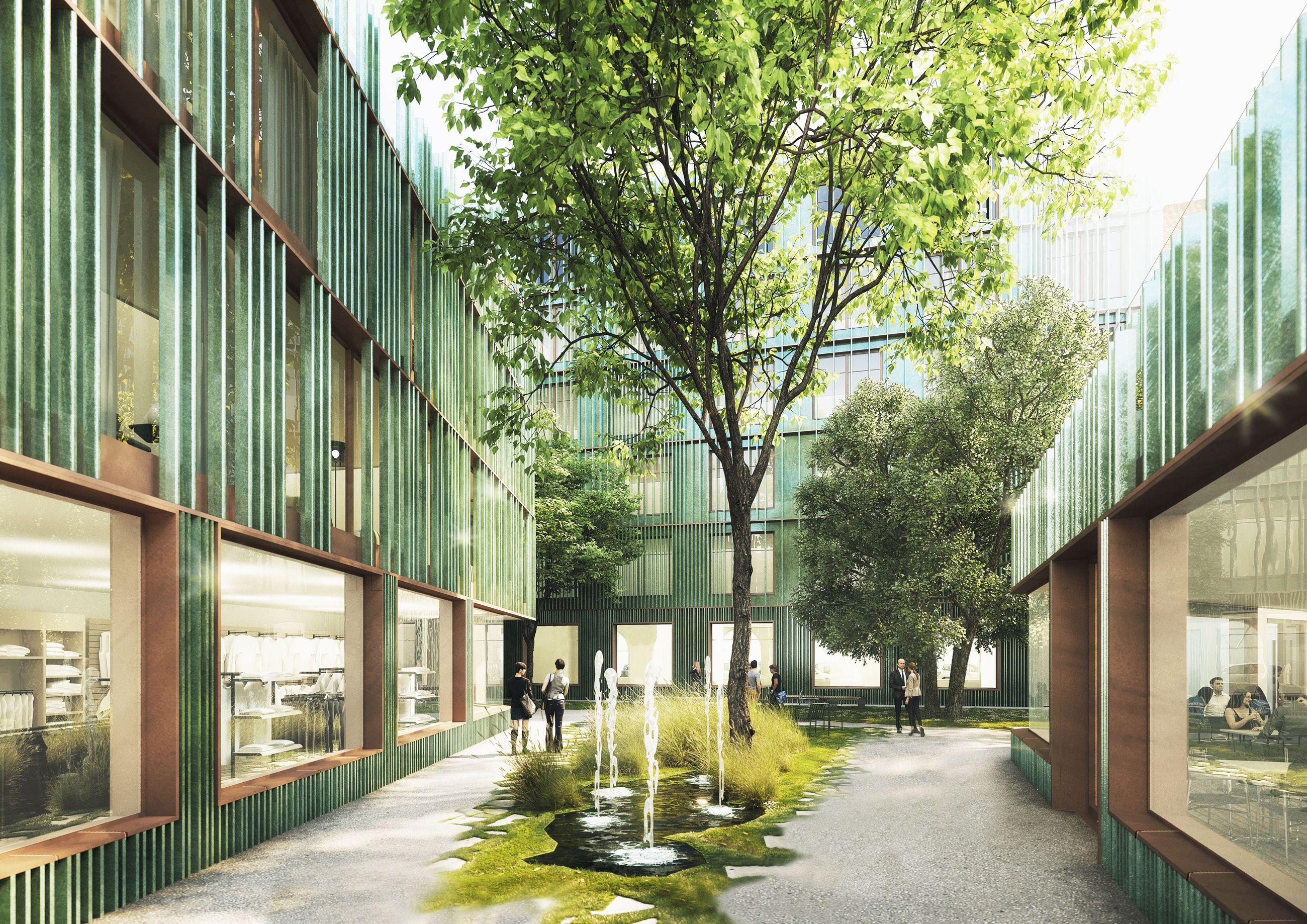 Die Hofbebauung greift die vorhandenen Brandwände auf. Es entstehen drei gegliederte Baukörper, deren geschossweise einspringende Formen durch Berücksichtigung der Abstandsflächen, Belichtungsverhältnisse und Durchwegung im Erdgeschoss entsteht. Die Bildung von fließenden Außenräumen als grüne Hoflandschaft geht damit einher. Hierbei soll der Charakter des Lehels, dessen Name von Lohe kommend „lichter Auwald“ bedeutet, aufgenommen werden. Die damals von Wasserläufen durchzogene Auenlandschaft ist hier prägend für die grünen fließenden Außenräume. In verschiedenen Grüntönen lasierte, vertikal stehende Keramikelemente als Außenkleid sollen das Bild des Waldes stärken. Wie die Baumkrone in der Höhe lichter wird, lösen sich die Elemente nach oben auf.