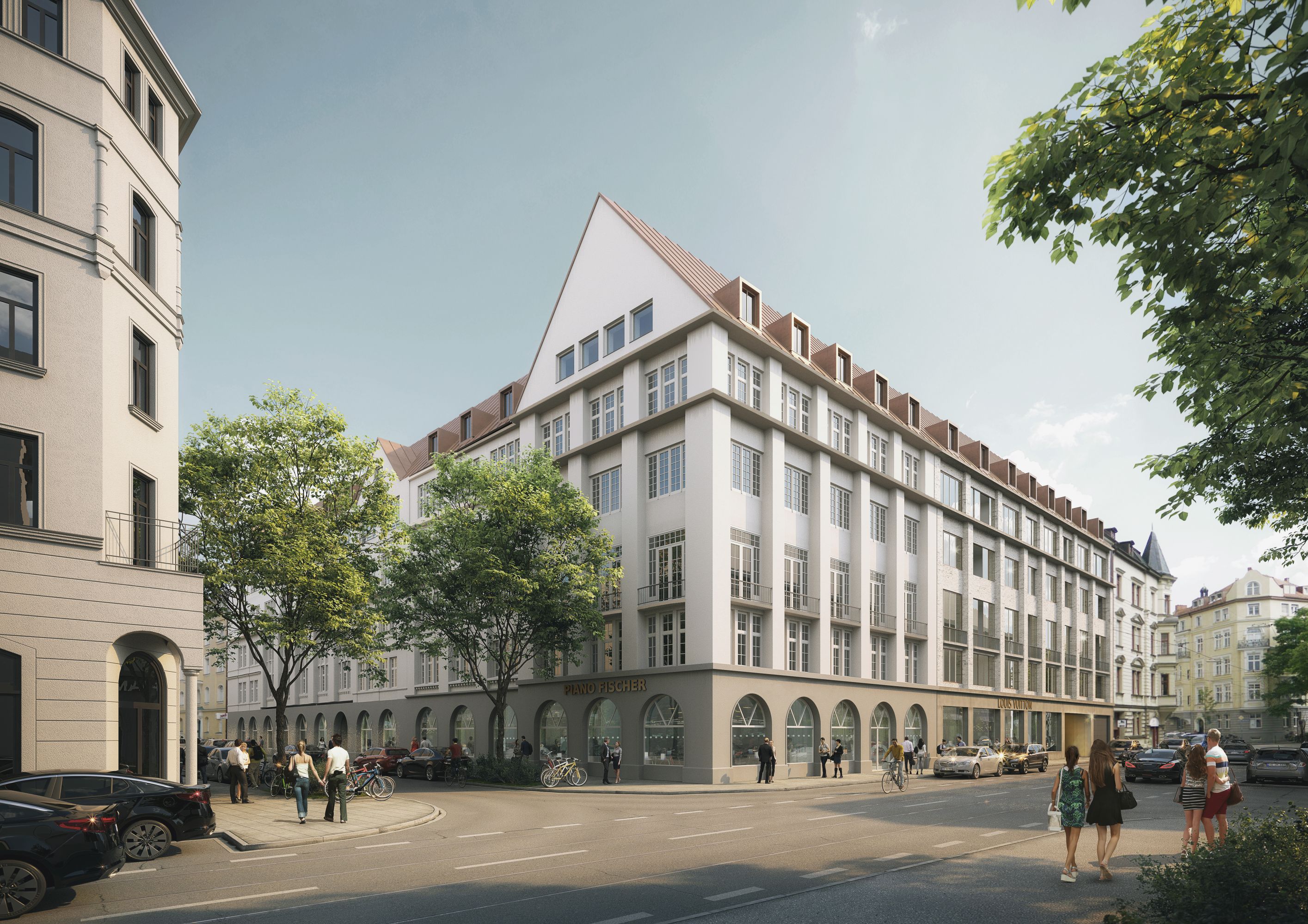 Die Konzeption für das Grundstück an der Thiersch- und Liebherrstraße im Münchner Stadtteil Lehel verbindet das Alte und das Neue mit differenzierten Lösungsansätzen für die Straßen- und Hofbebauung. Während straßenseitig der vertraute städtische Charakter bestimmend ist, entfaltet sich im Innenhof ein inspiriert von der einstigen Auenlandschaft überraschender Grünraum. Die Fortführung der Straßenbebauung hinsichtlich Maßstab, Gliederungselementen, Proportion und Farbigkeit des Bestandes und eine Übersetzung dieser in die heutige Zeit ist eine wesentliche Entwurfsstrategie. Als Materialien dienen geschlemmtes Mauerwerk in den oberen Wohngeschossen, ein Kupferdach, das sich einheitlich über die gesamte Straßenbebauung legt und im Erdgeschoss Stahlbetonfertigteile, die die öffentliche Nutzung dieses Bereiches betonen. So entsteht eine Fortschreibung des industriellen Charakters des Bestandes in moderner, der Nutzung entsprechenden Erscheinung.