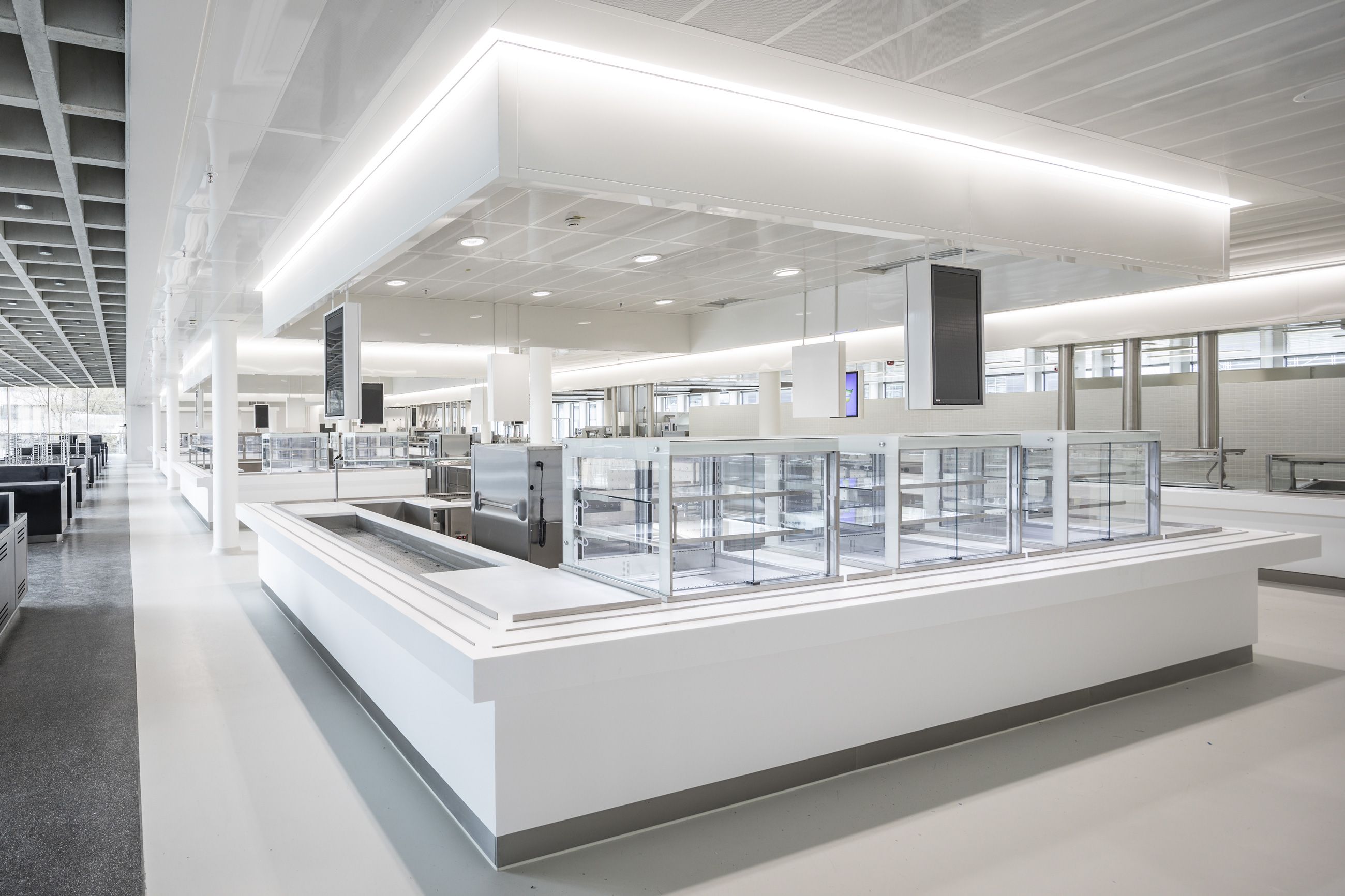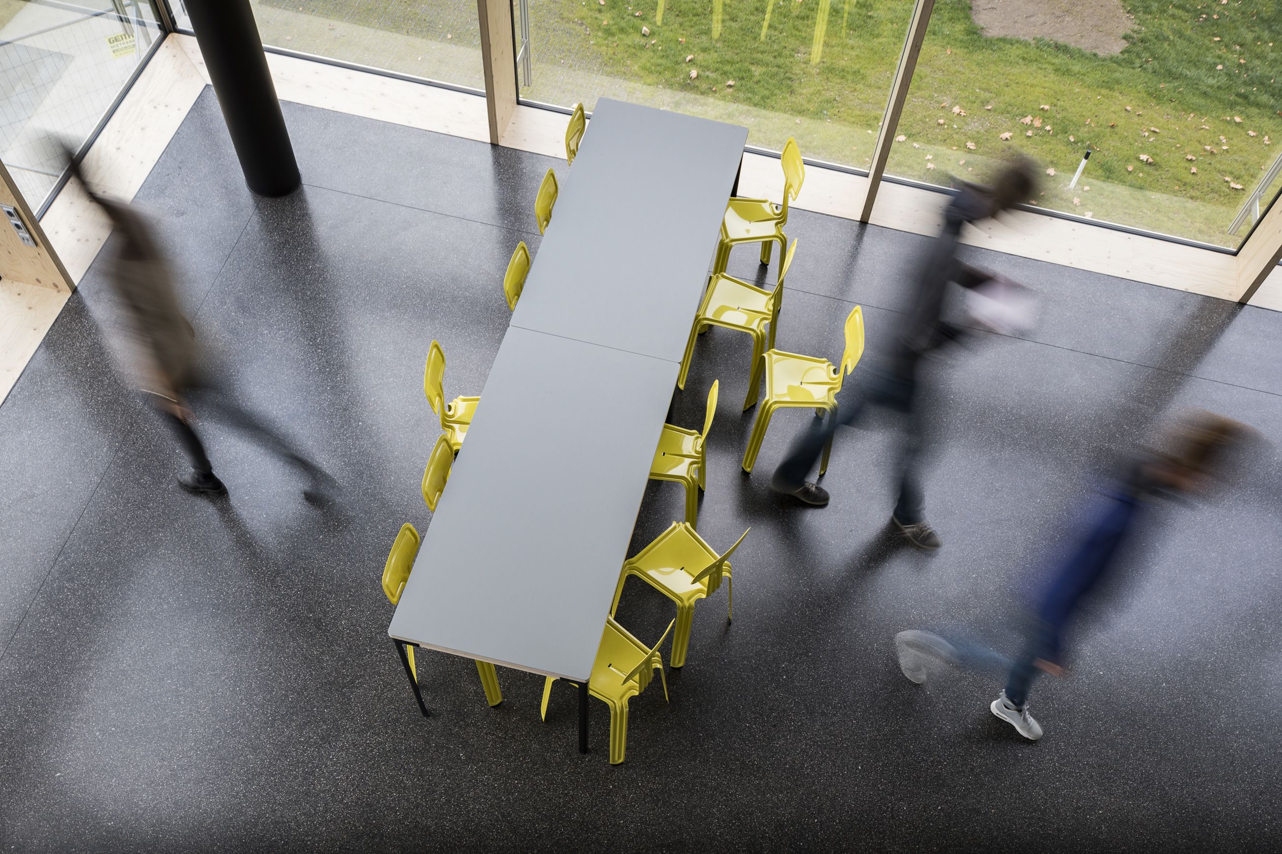 Für das Obergeschoss gilt: Vorbereiten, Kochen, Ausgeben, Essen, Rückgeben und Spülen liegen gemeinschaftlich auf einer Ebene. Die Funktionsverteilung gehorcht dem Personen- und Warenfluss, wobei sich der durch die Agora angenehm gegliederte Speisesaal in die Mitte öffnet. Ein uneingeschränkter Ausblick spiegelt die Weite des Campus und gibt Orientierung im Inneren.