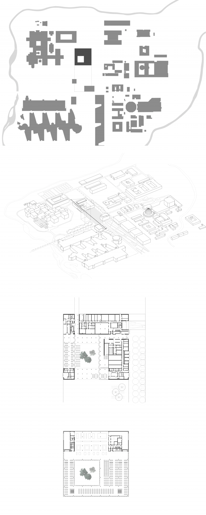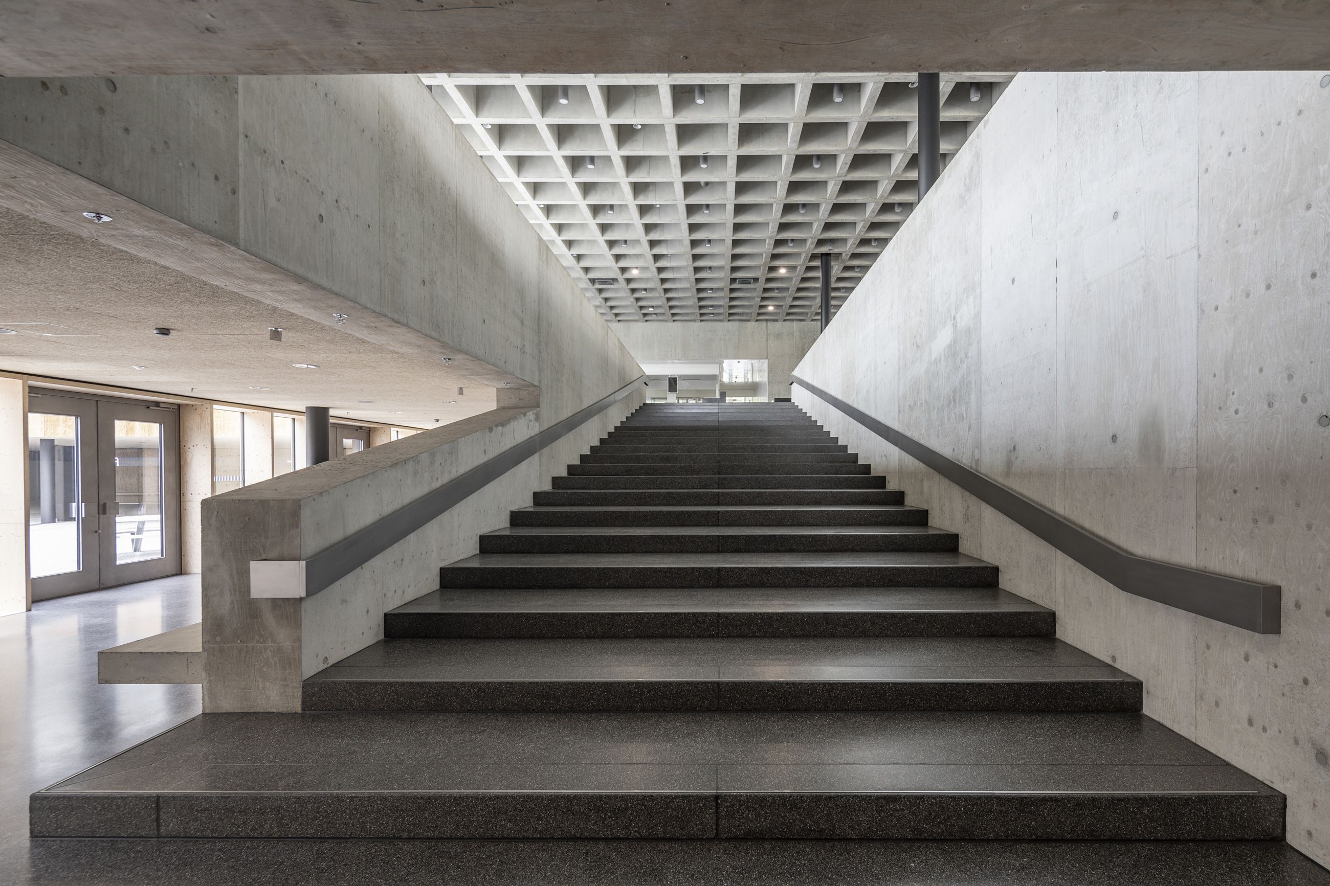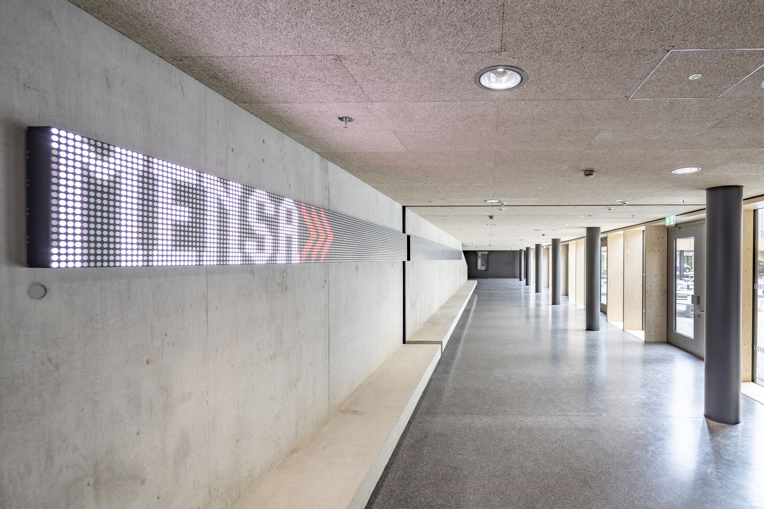 Über den innenliegenden Freiraum werden die einzelnen Funktionsbereiche erschlossen. Diese Agora ist ein Ort des Verweilens, der Begegnung und der Kommunikation. Ihre räumliche Erweiterung ist das Foyer, welches mit einem eindrucksvollen Stufengang die Vertikalerschließung inszeniert. In der Basis sind die öffentlich zugänglichen Nutzungen um die Agora gruppiert: Foyer, Cafeteria und Studentenkneipe sorgen für pulsierendes, studentisch-attraktives Leben.