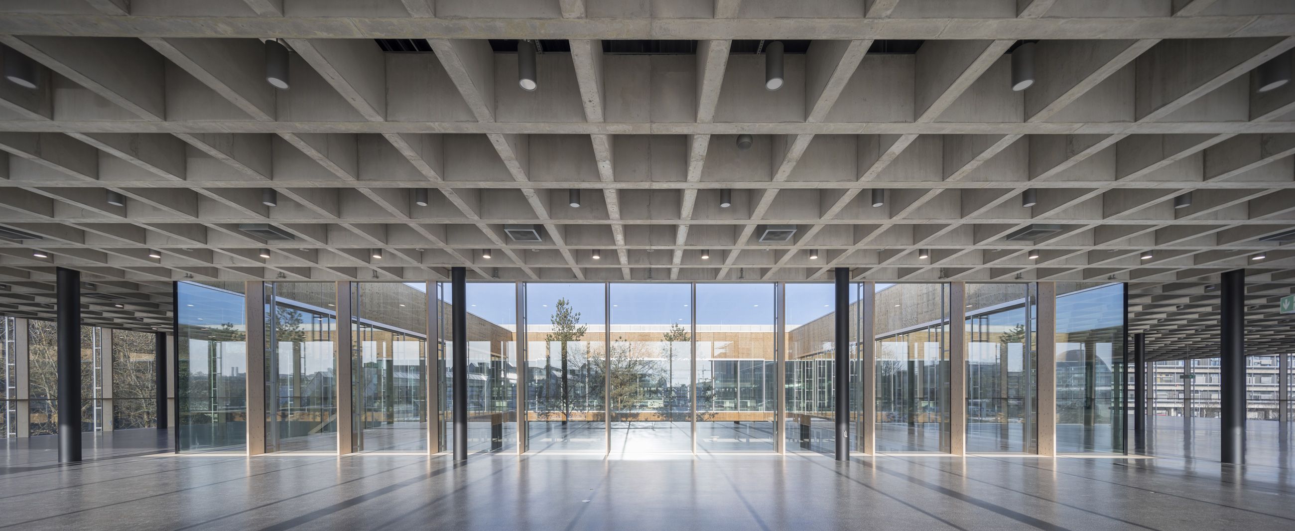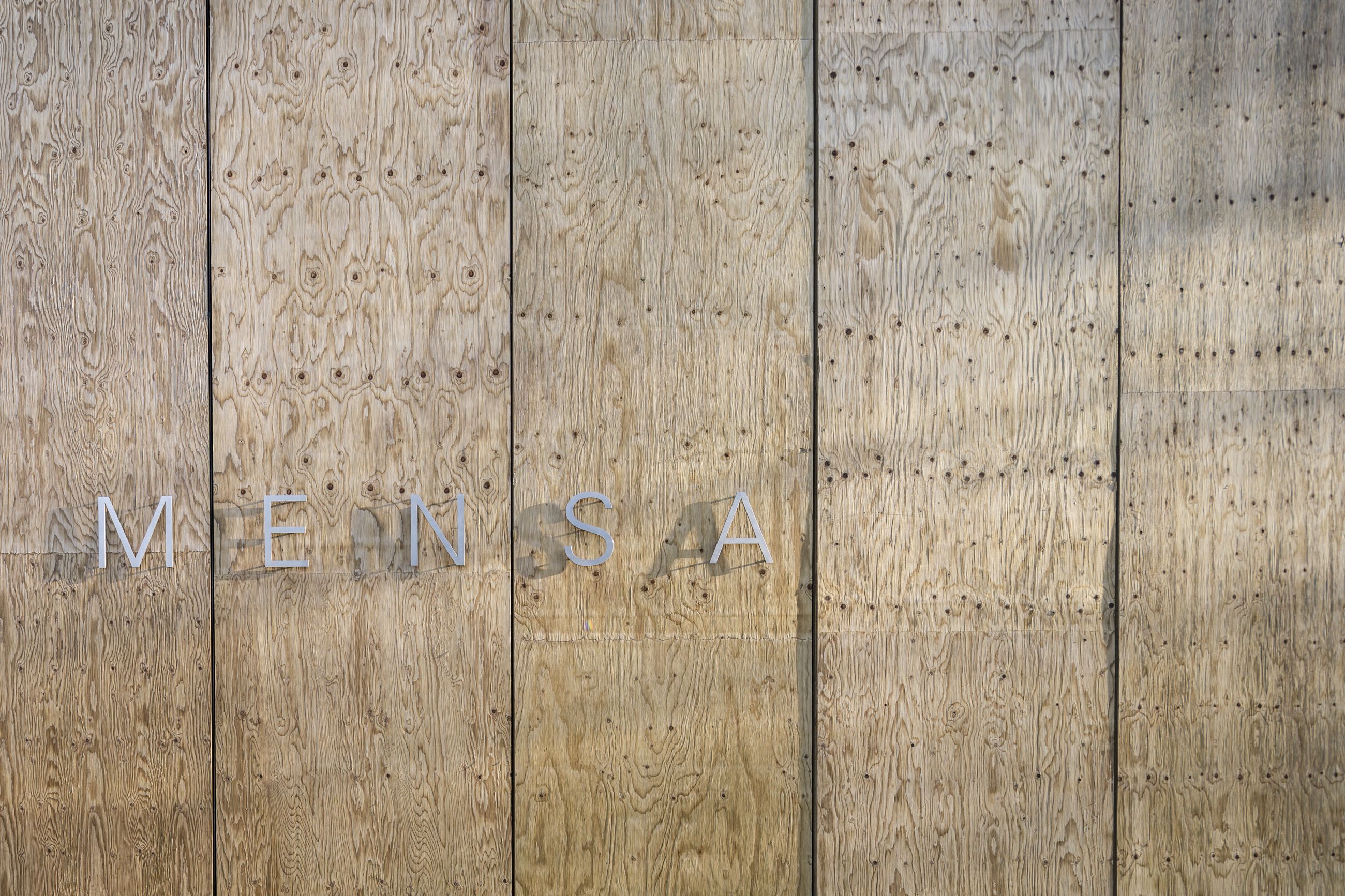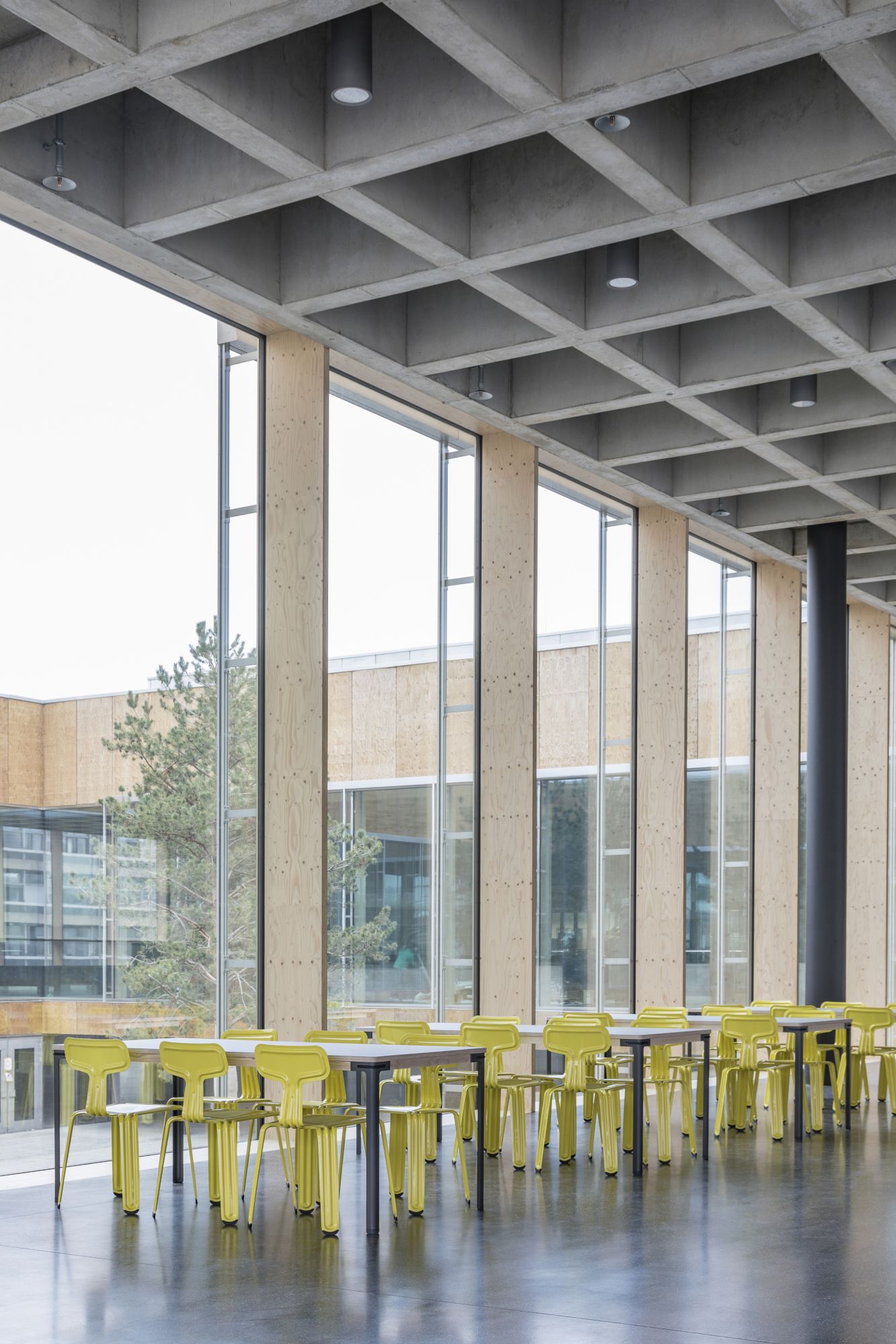 Die konstruktive Ordnung des tragenden Gerüstes aus Stahlbeton reagiert auf die Schichtung der unterschiedlichen Nutzungen und räumlichen Strukturen: der Sockel eng und dicht, der Raum (Speisesaal) licht und weit. Ein Tragrost aus Stahlbeton erinnert an die Mensa des Architekten Franz Hart auf dem Stammgelände der Universität in der Stadt. Er bildet das prägnante Dachtragwerk des Speisesaals und verleiht dem Raum in Verbindung mit dem allseitigen Lichteinfall Identität und eine einzigartige Atmosphäre.