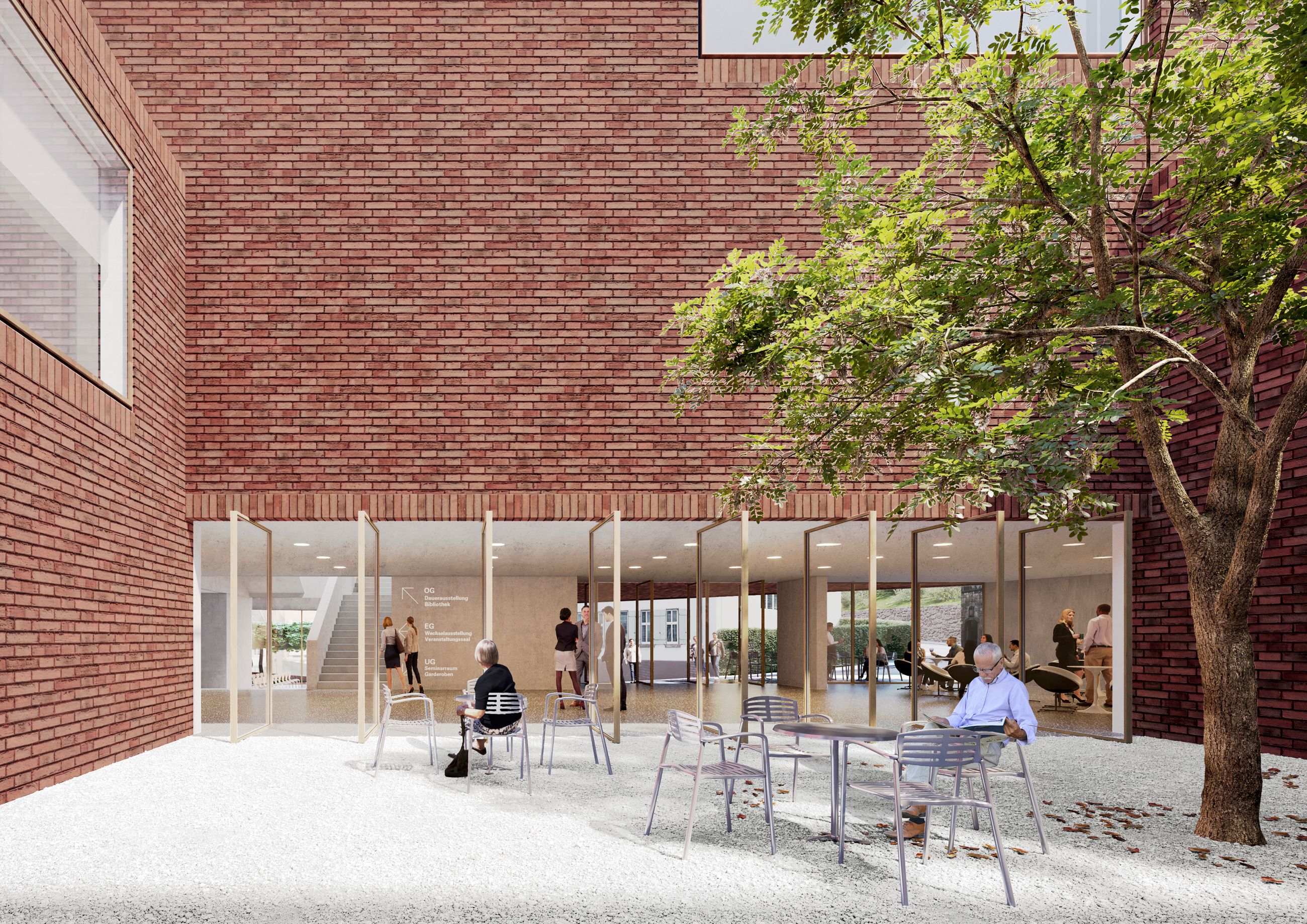 Ein markanter Gebäudeeinschnitt an der Bremeneckgasse erzeugt eine großzügige Zugangssituation, so erhält das Neue Dokumentations- und Kulturzentrum eine gut wahrnehm- und auffindbare Adresse. Der gedeckte Eingangsbereich bildet das Bindeglied zum Foyer und erzeugt zusammen mit dem Museumscafé eine einladende und offene Erscheinung. Die klare Struktur ermöglicht eine leichte Orientierung im Gebäude. Der Gemeinschaftshof gibt dem Dokumentations- und Kulturzentrum eine bauliche Mitte. Er kann flexibel mit dem Foyer und dem Museumscafé zu einer großzügigen Veranstaltungsfläche für Festakte zusammengeschaltet werden.