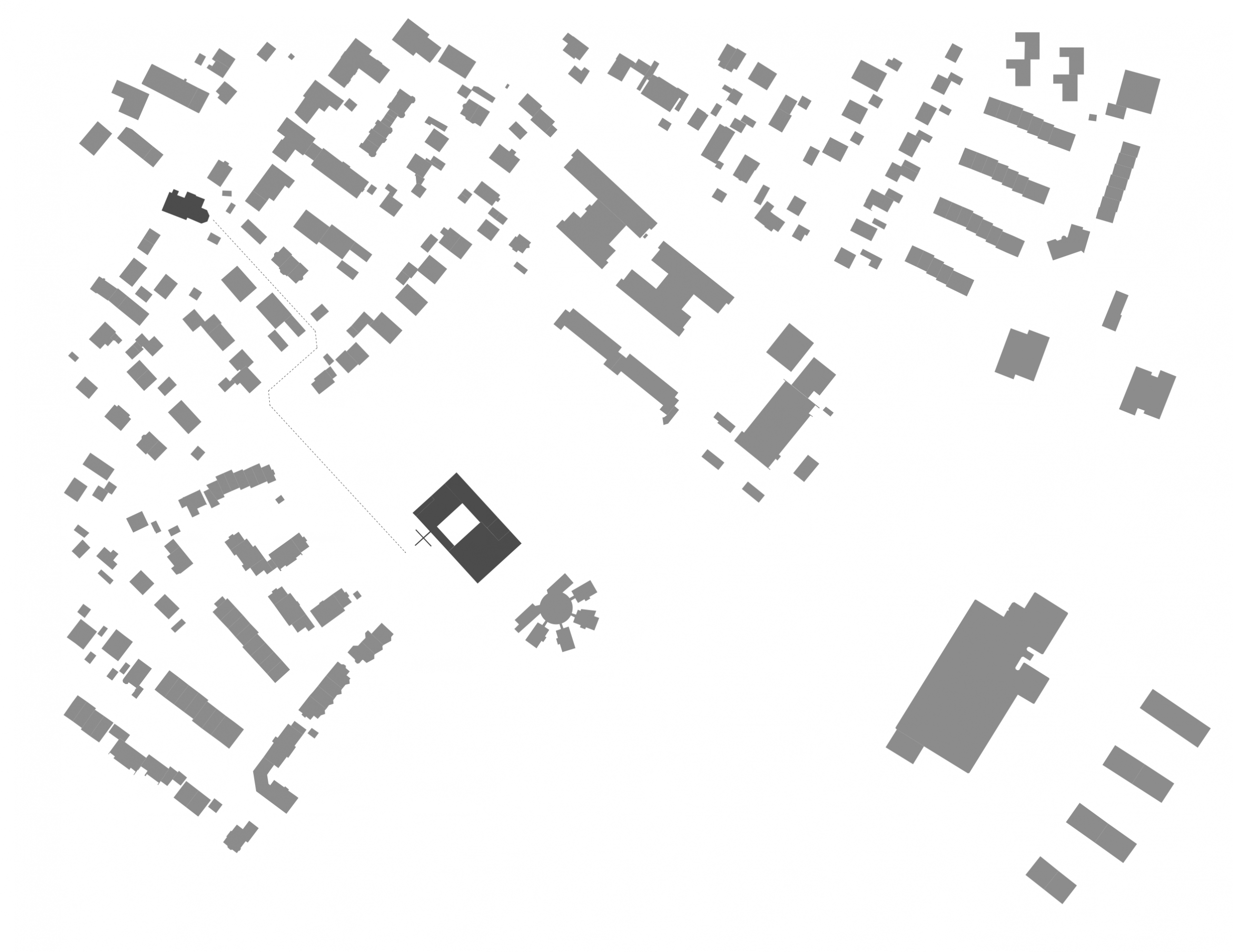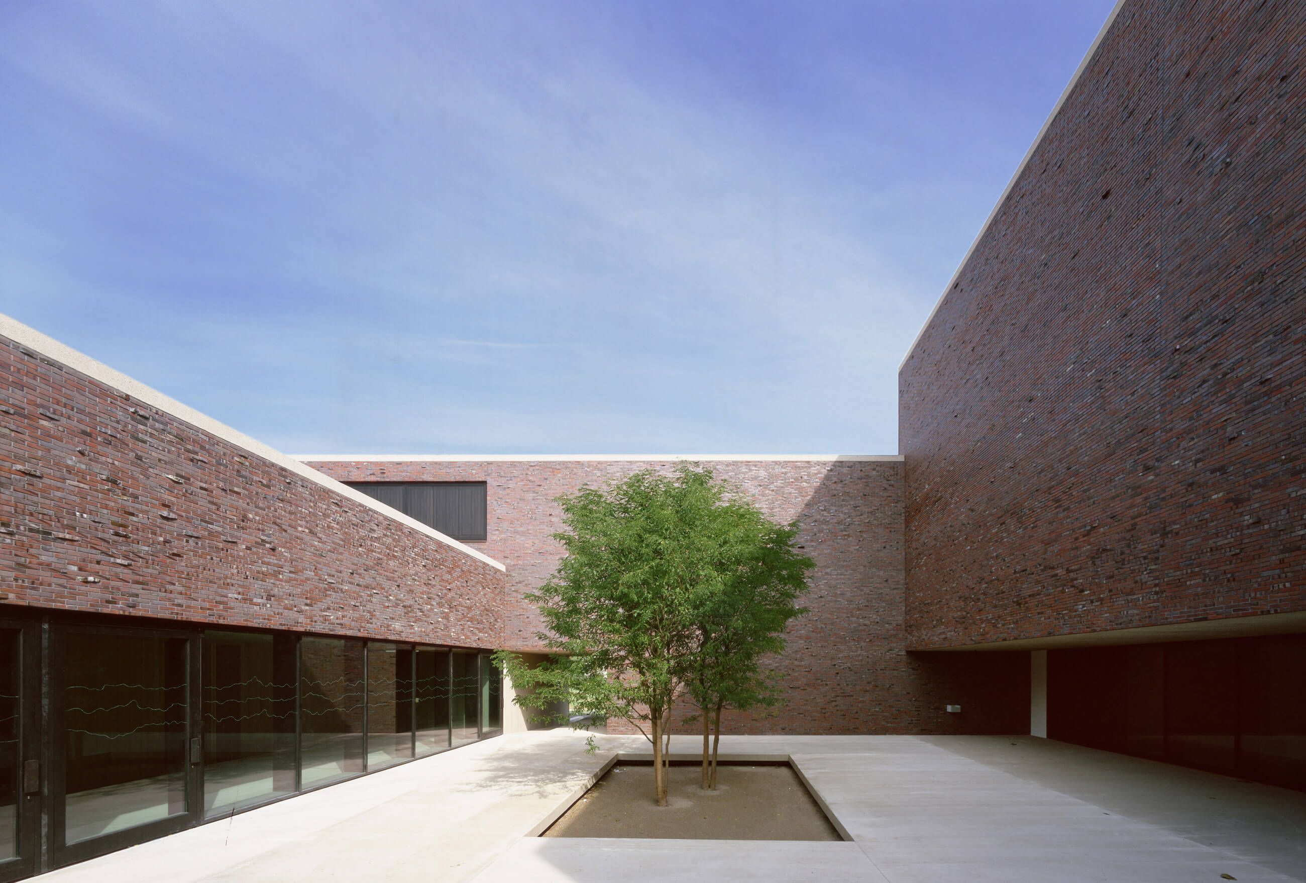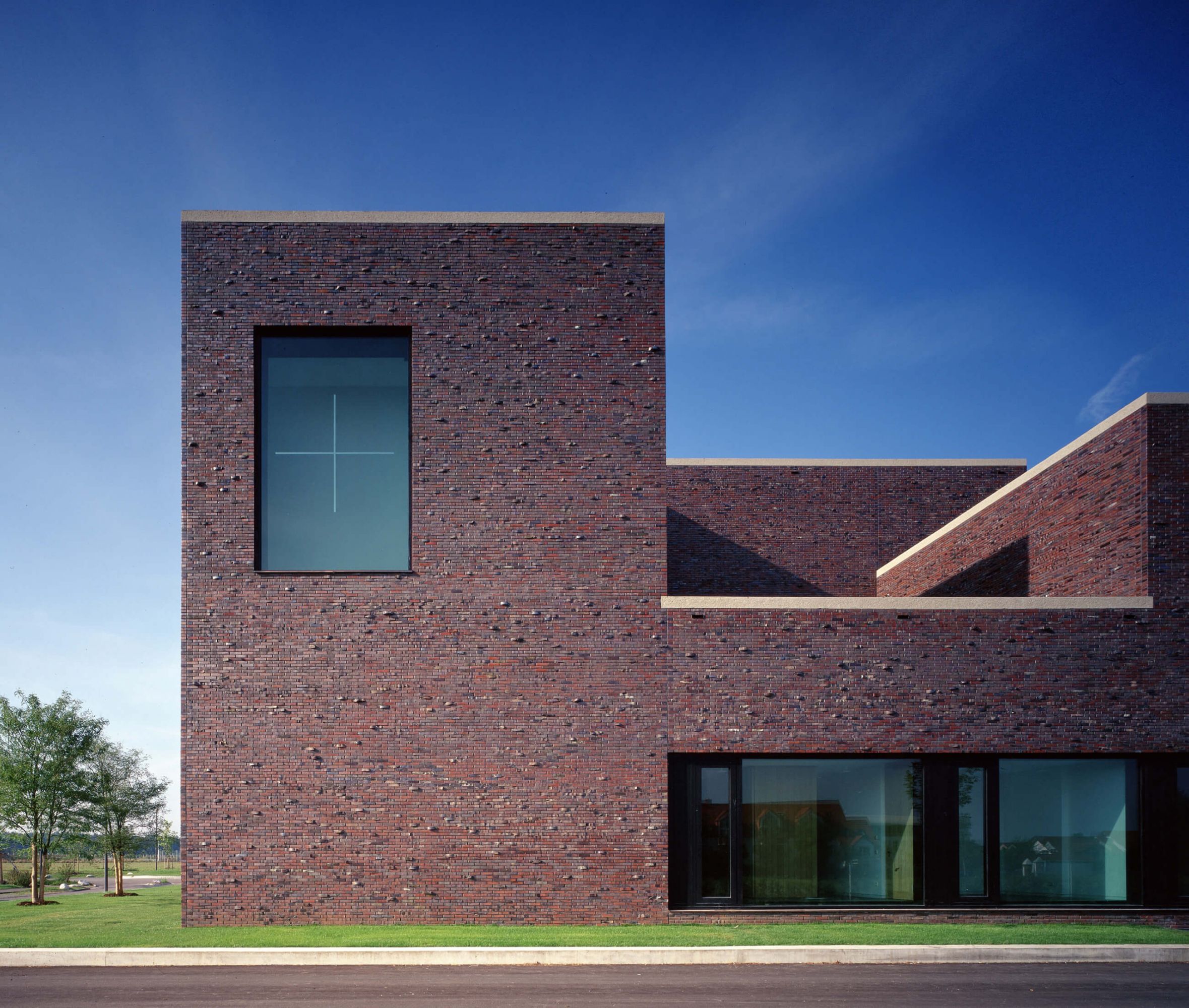 Der Baukörper des neuen Pfarrzentrums ordnet die städtebauliche Situation und ist als kraftvolle Skulptur ausgeformt. Seine verschiedenen Funktionen gruppieren sich um einen Innenhof, der Kirchenraum dominiert sinnstiftend die Baumasse. Der Glockenträger des neuen Gemeindezentrums ist auf die alte Kirche ausgerichtet.