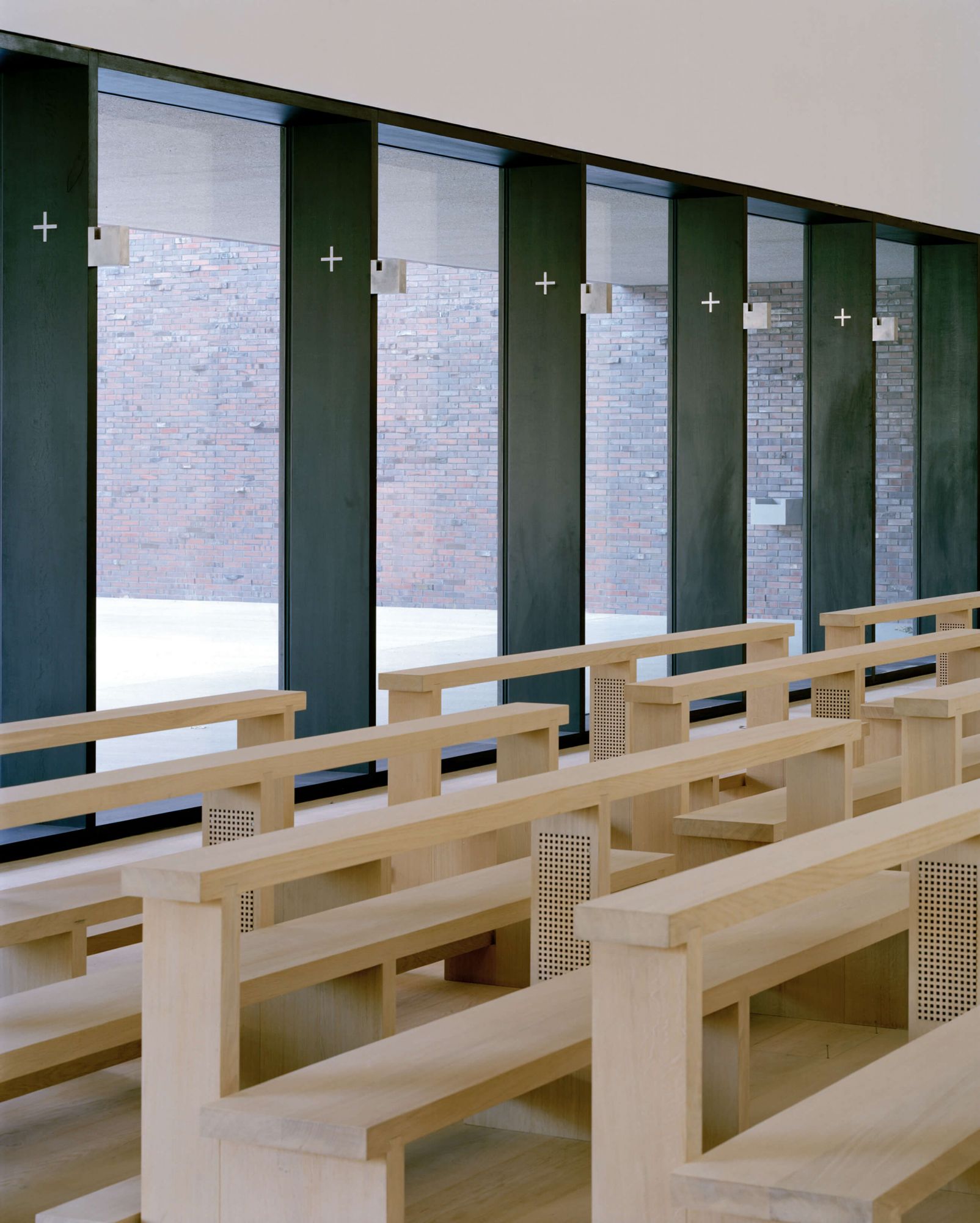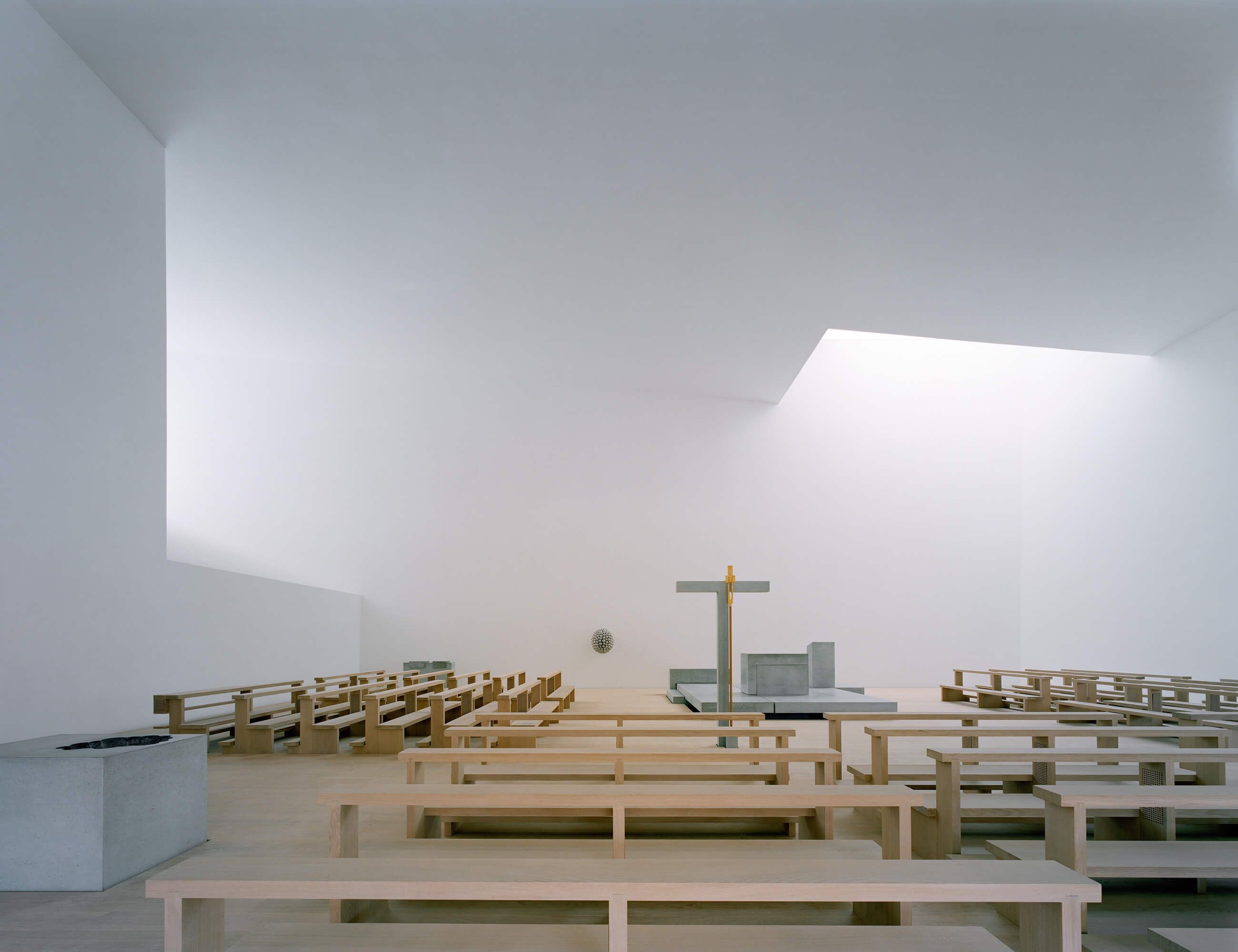 Der Boden des sakralen Lichtgefäßes ist ein hölzerner Grund; samt Gestühl ganz aus massiver Eiche gefügt, ist er in weiße Futteral eingelegt. Das Material Holz als gewachsener Baustoff ist Sinnbild für die gewachsene Gemeinde und reflektiert die Geschichte des Ortes (Neuried = Neue Rodung). Die aus dem goldenen Schnitt entwickelte Raumhülle der Kirche mit geneigten Wand- und Deckenflächen, Öffnungen zum Licht und der Empore entwickelt skulpturale Kraft. Die glatten, gekalkten Wandflächen im Inneren bilden den Grund für das Licht und den stillen, erhabenen Ort für die Liturgie.