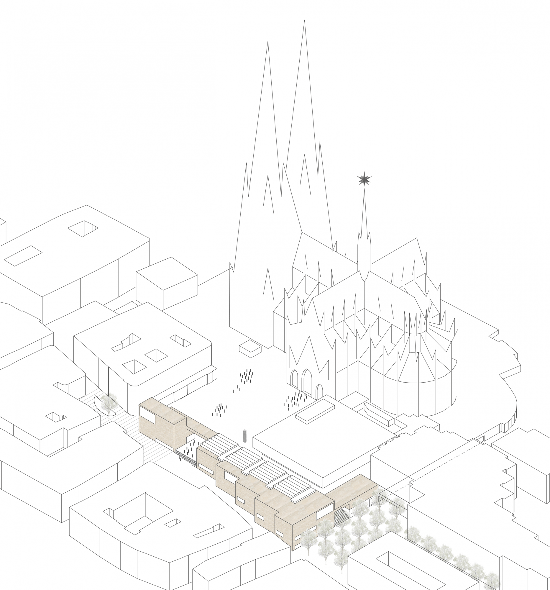 Die Übernahme der Höhen der umliegenden Bebauung wie die Gebäudehöhen des Domhotels, als Maximum und Hochpunkt, die Höhe des Römisch- Germanischen Museums als Horizont und die Abstufung der Höhenentwicklung zum Kurt-Hackenberg-Platz tragen dazu bei, dass sich der neue Baukörper maßstäblich in den Stadtraum von Köln einfügt. Die große Öffnung in der Achse der Via Culturalis stellt den Sichtbezug zum Dom her und unterstützt damit die Idee einer kulturellen und historischen Bedeutungslinie. Der neue Baukörper fasst die Domplatte und vermeidet die Ausbildung einer harten und ausgrenzenden Kante im Stadtraum. Gassenbreite Übergänge und Treppenanlagen verbinden die Domplatte mit dem Kurt- Hackenberg-Platz und der Via Culturalis.