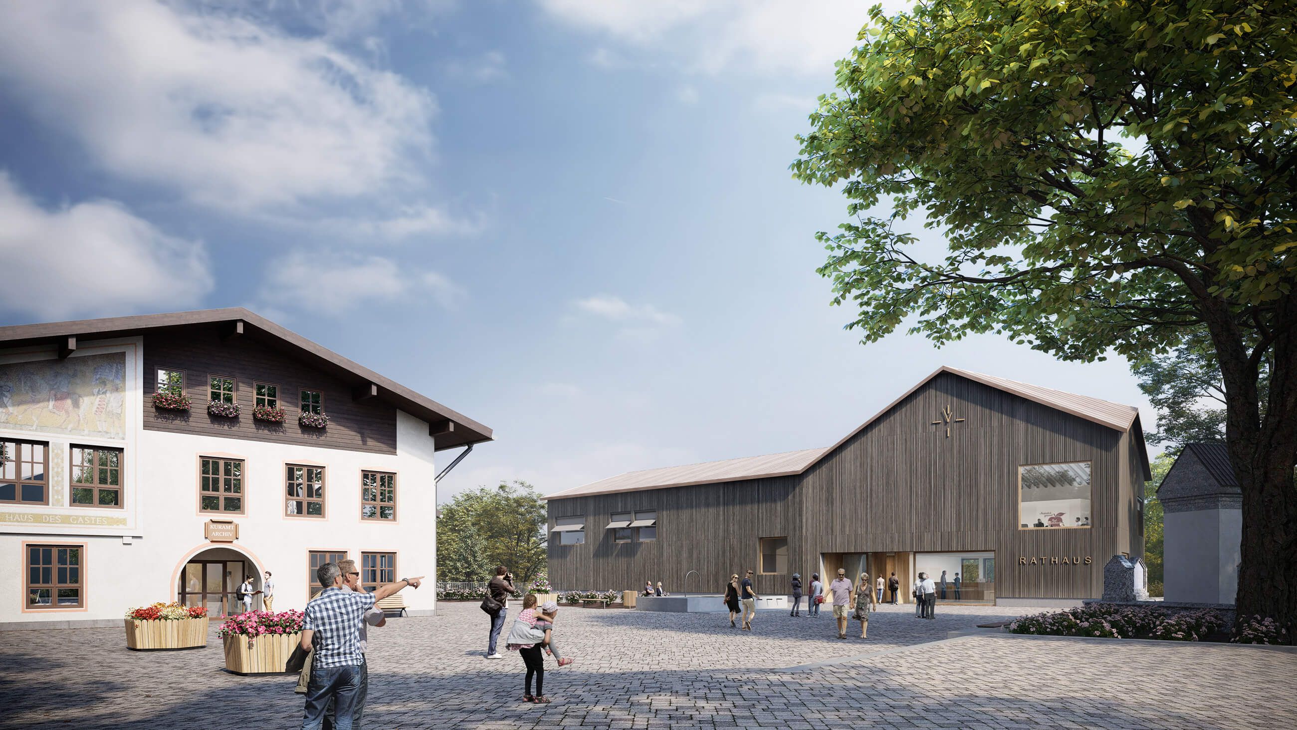Der überdimensionale Quergiebel des neuen Rathauses hat einerseits eine adressbildende Wirkung zum Rathausplatz hin, andererseits deutet er die innere Funktion: Im Obergeschoss ist hier der große Sitzungssaal mit Öffnung zum Dorfplatz angeordnet, der Einblicke in das Tagungsgeschehen möglich macht – ganz im Sinne der gelebten Transparenz. Auf die bestehenden topographischen Niveaus antwortet die innere Organisation des Neubaus mit Feinsinn. Einladend öffnet sich das großzügige Foyer mit angegliedertem Trauzimmer zum Rathausplatz hin und wird zum Ort des Willkommens. Über einen Nebeneingang kann das neue Rathaus von den Bürgern und Mitarbeitern, vom geplanten Parkplatz oder von der Bushaltestelle herkommend, über den künftigen Bürgerpark erreicht werden.