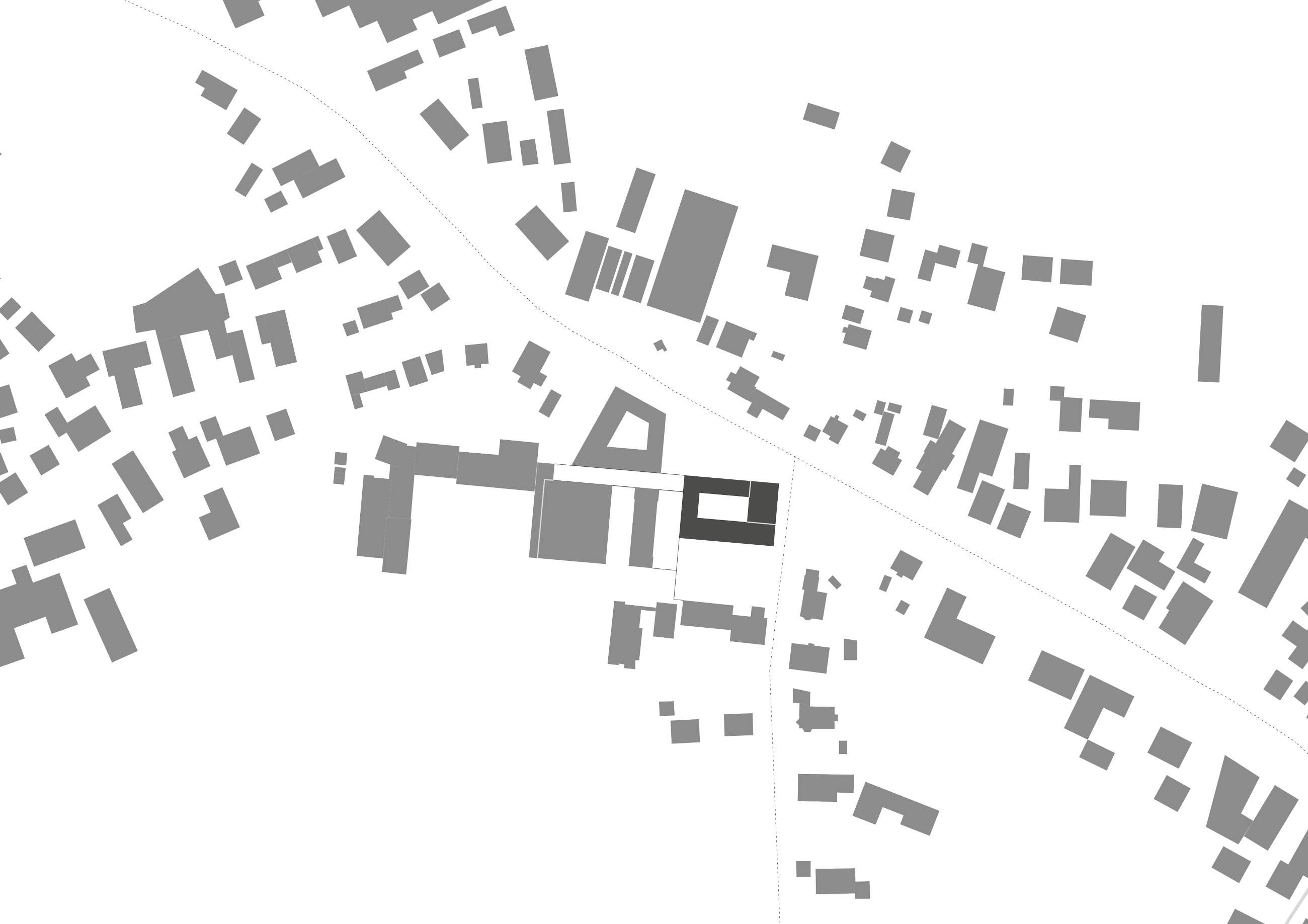 Ein Ensemble aus Rathaus und Bürgerhaus bilden die neue Ortsmitte und formen einen Zentrumsplatz aus. Die beiden Baukörper sind Hofstrukturen, die in ihrer Ausformung auf die topographischen und städtebaulichen Besonderheiten des Ortes eingehen. Die Konzeption für die neue Zweifachturnhalle und Versammlungsstätte sieht einen 31 x 35m breiten und langen Baukörper vor, der an gleicher Stelle der jetzigen Turnhalle und in der Flucht des Pfarrzentrums steht. Somit entsteht eine wichtige Verbindungsachse zwischen den öffentlichen Gebäuden, wie Grundschule, Turnhalle, Pfarrzentrum, Bürgerhaus und Rathaus.