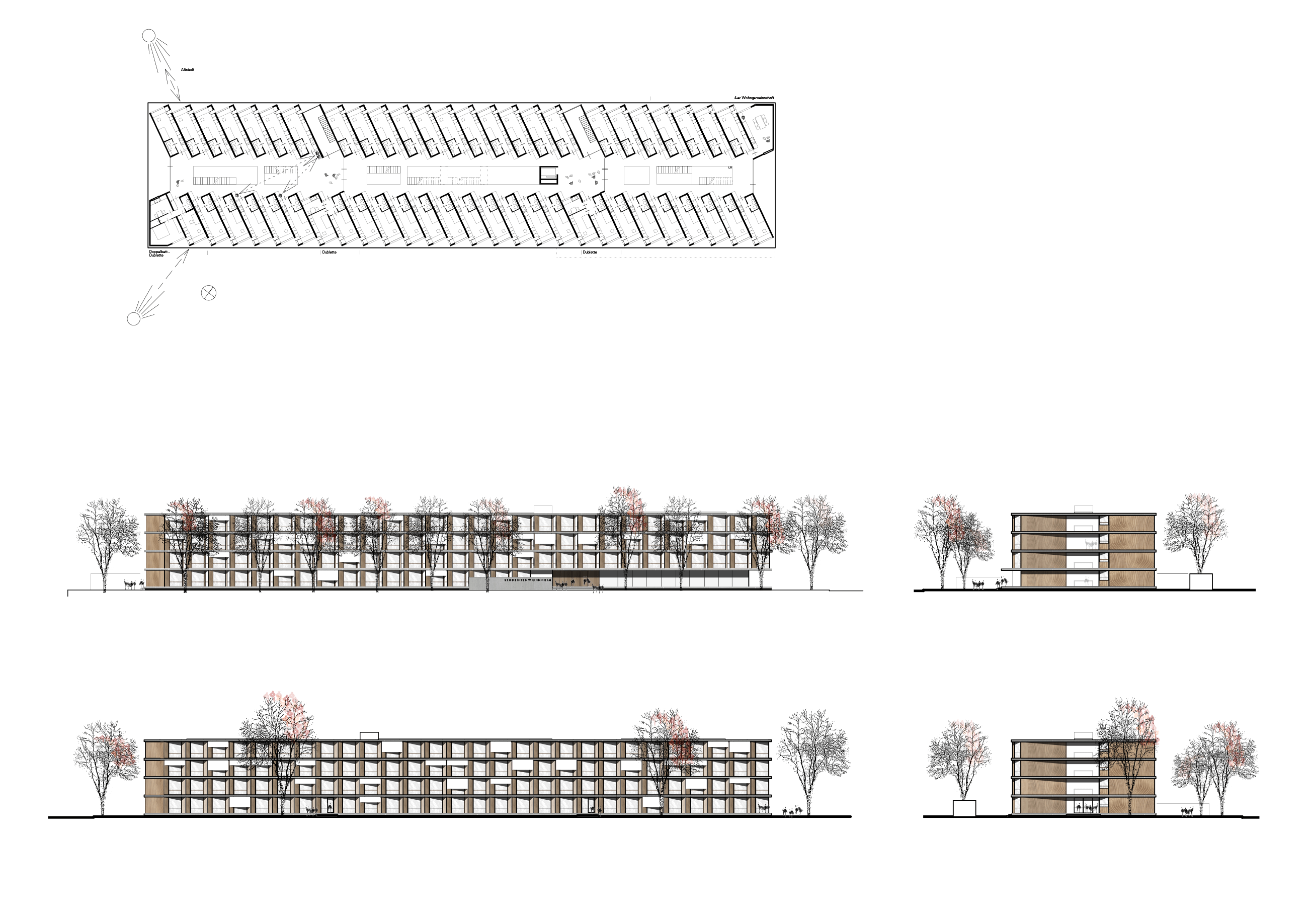 Die Grundstruktur unserer Bauwerkskonzeption ist geprägt von der Systematik einer hoch effektiven Zweibundanlage. Die Einzelzimmer als Individualräume werden um die mittige Erschließungszone angeordnet. Inspiriert von der Struktur der Landshuter Altstadt (Gasse und ablesbar gereihte, giebelständige Einzelhäuser) entsteht eine „Mitte“ mit pulsierendem studentischen Leben, getragen von Gemeinschaft und Kommunikation. Auch ist dies der Bereich für informelle Begegnung und soziale Kontrolle. Dem Eingangsbereich sind die erdgeschossigen Gemeinschaftsflächen, sowie das Büro zugeordnet.