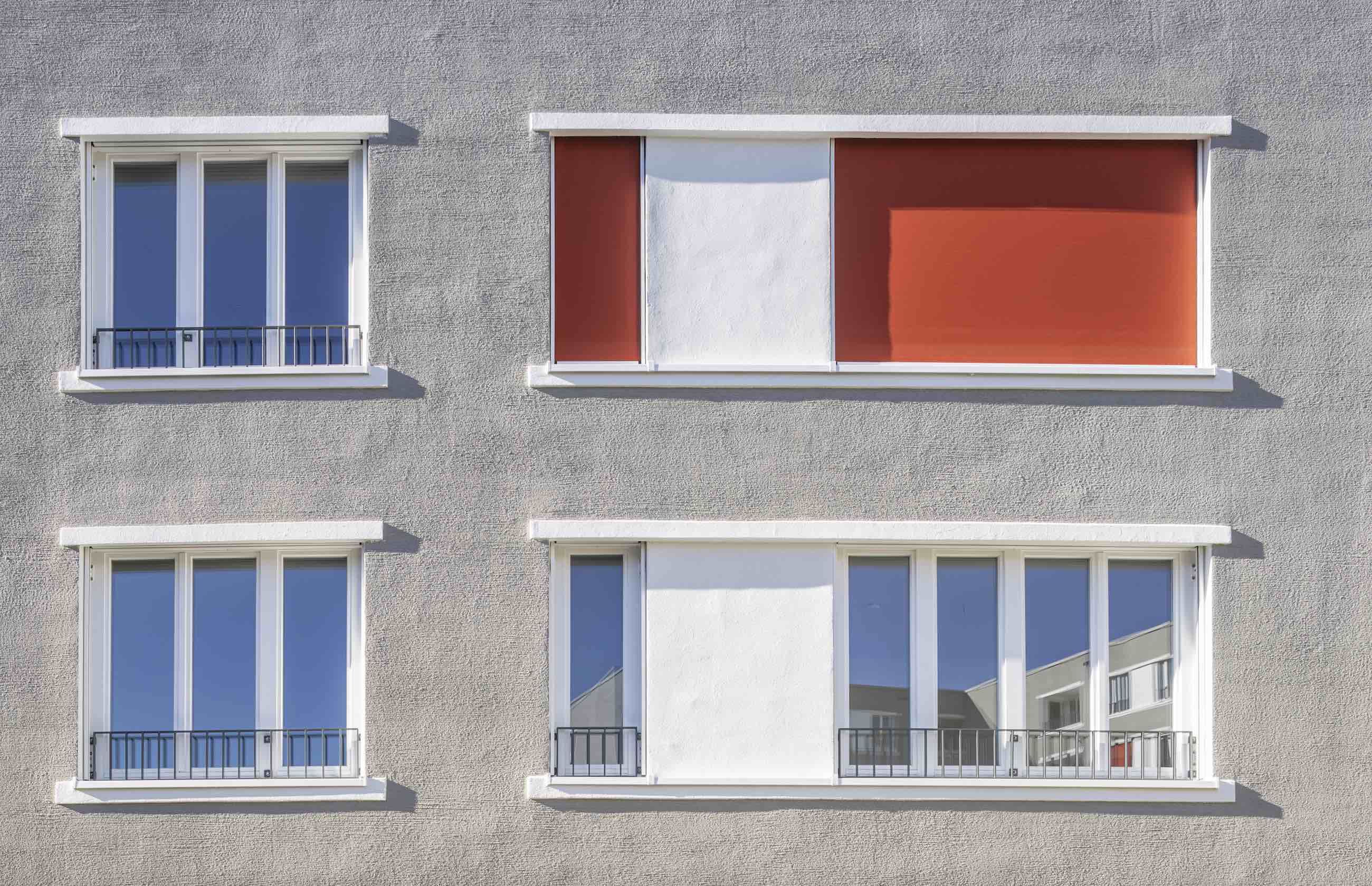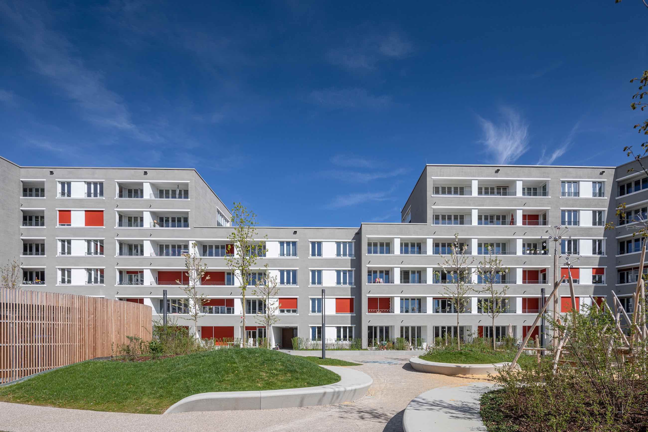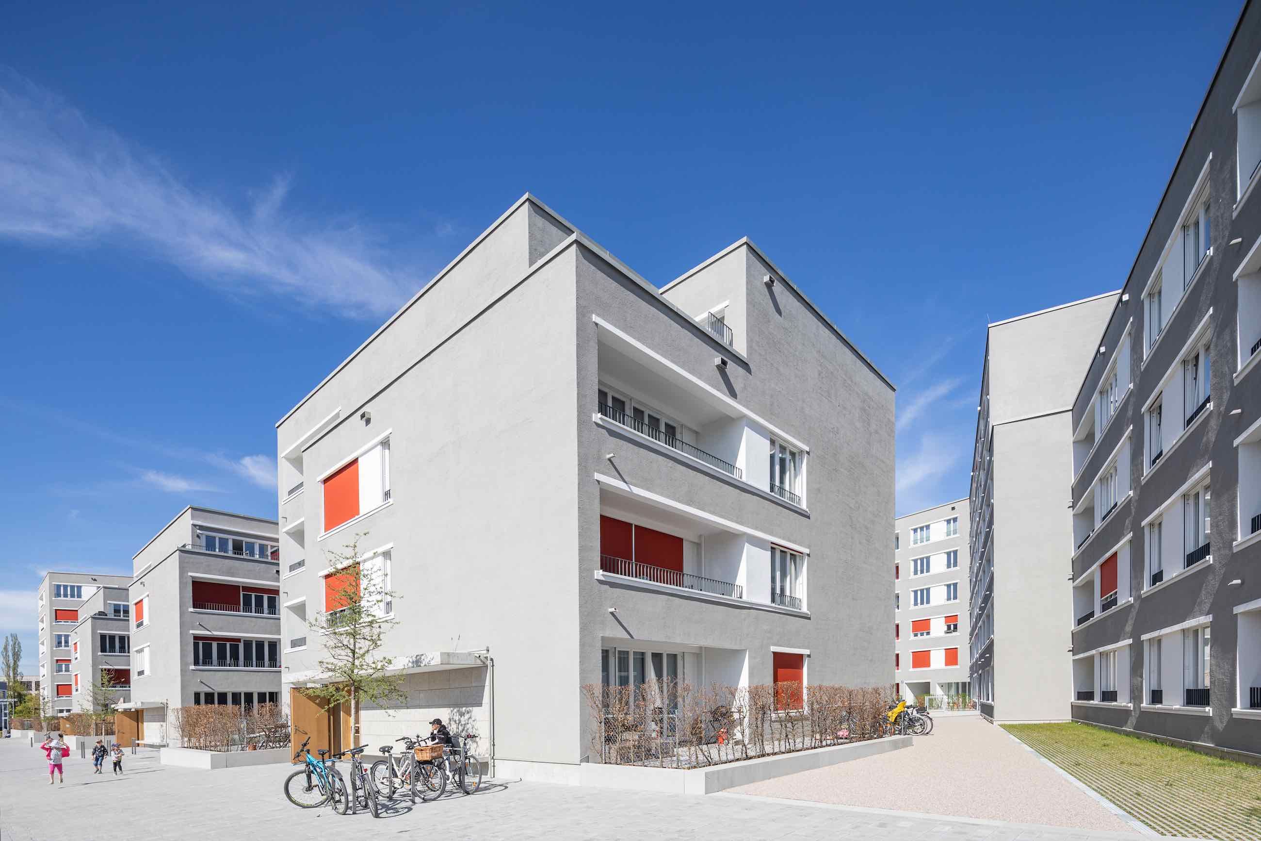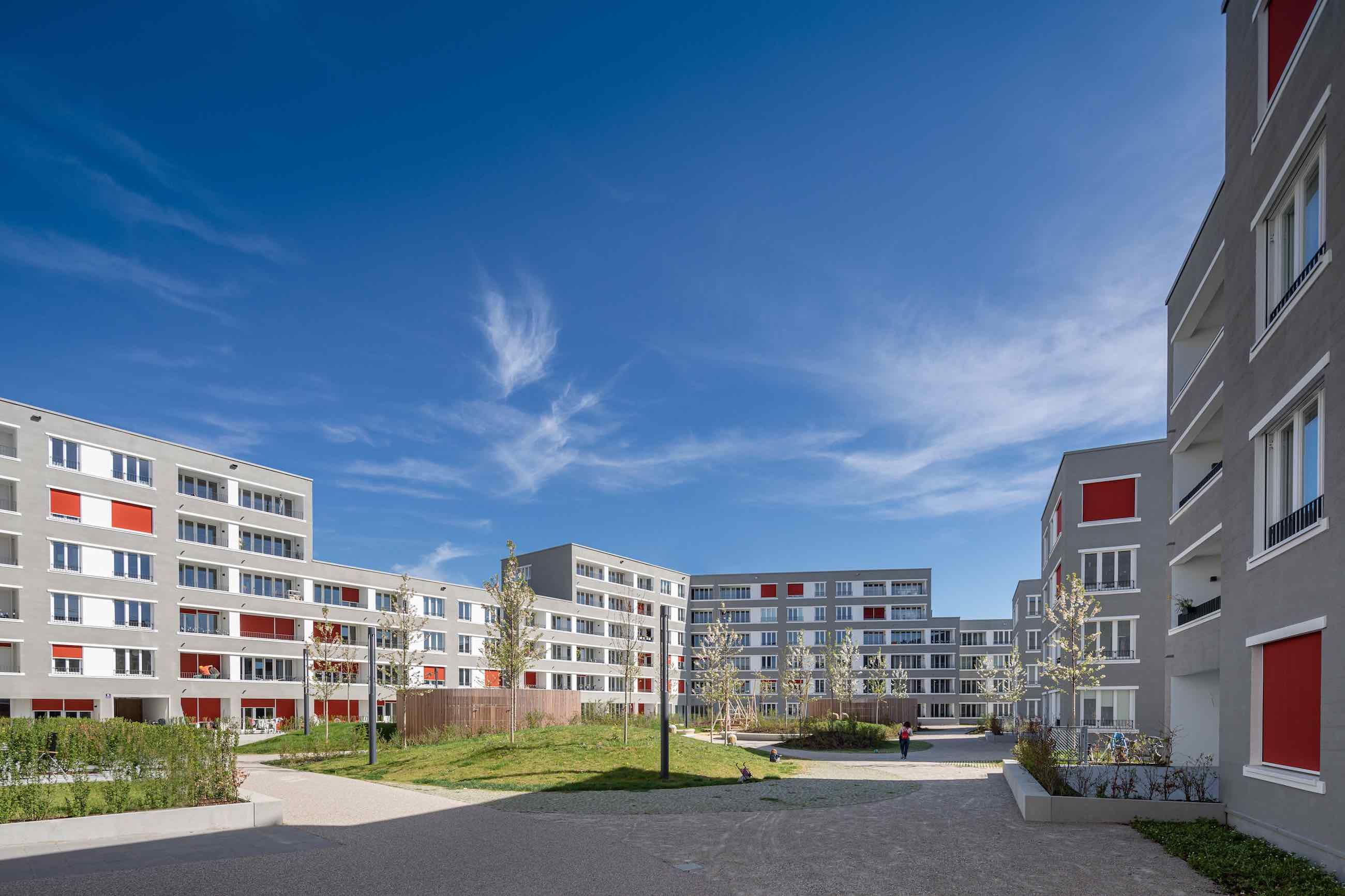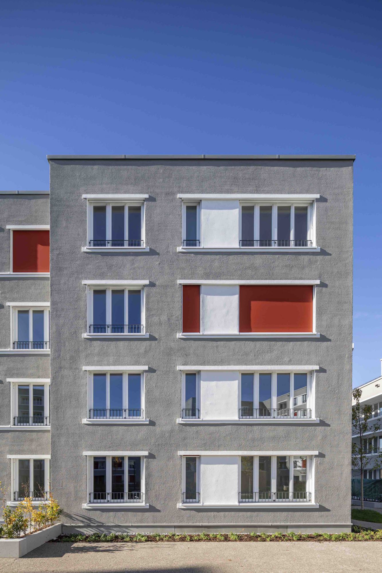 Die größeren, durchgesteckten Drei- und Vierzimmerwohnungen ermöglichen den Südlichteinfall in die nach Nordwesten ausgerichteten Wohnungen am Quartiersplatz. Das von einem städtischen Charakter geprägte äußere Erscheinungsbild wird von der differenzierten Volumetrie bestimmt, wohl geordnete Lochfassaden verleihen den Massivbauten Ruhe und Kraft. Der Besenstrichputz mit weiß gefassten Holzfenstern und Gesimsbändern sorgt mit den roten Stoffmarkisen für eine zeitgemäße Erscheinung und natürliche Schönheit.