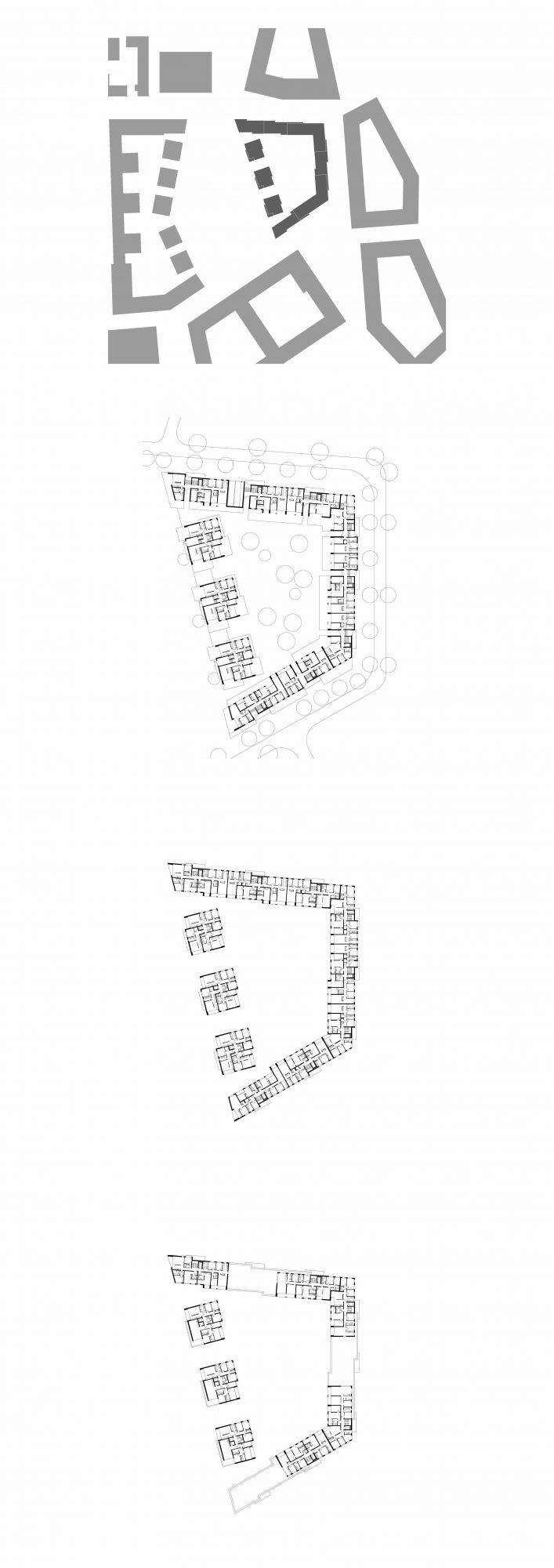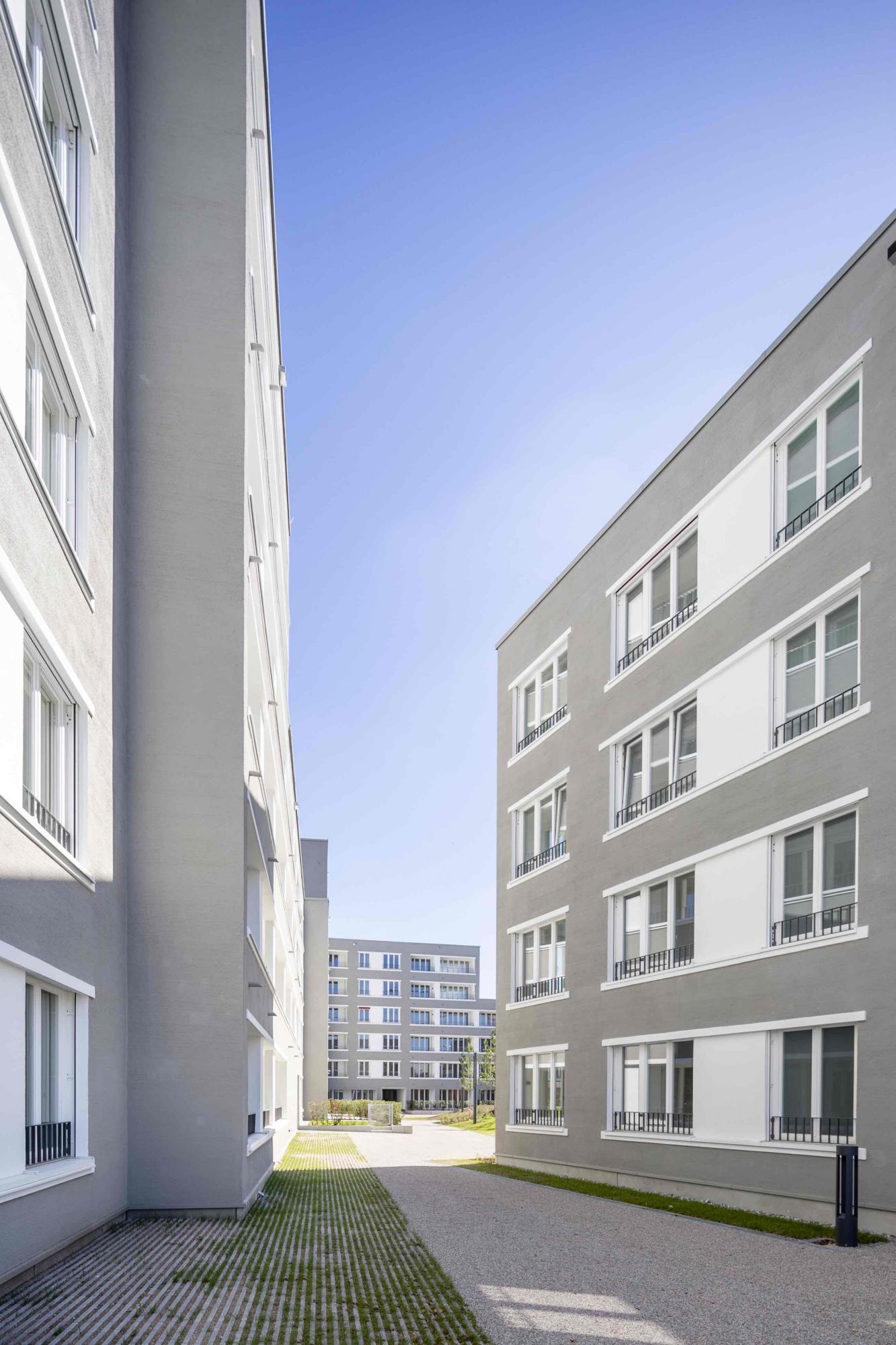 Durch das nach Norden hin abfallende Gelände ergibt sich für die Bebauung bereits im Osten den für Privatheit notwendigen Abstand zum Straßenniveau. Im Süden schafft das festgesetzte Vorfeld Distanz zur Straße. Sämtliche Wohnungen orientieren sich zum ruhigen Innenhof, den Wohnräumen vorgelagerte Loggien bilden private Freibereiche.