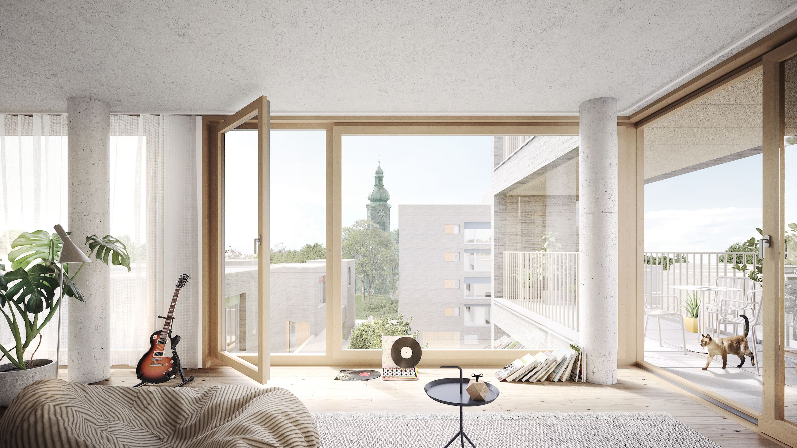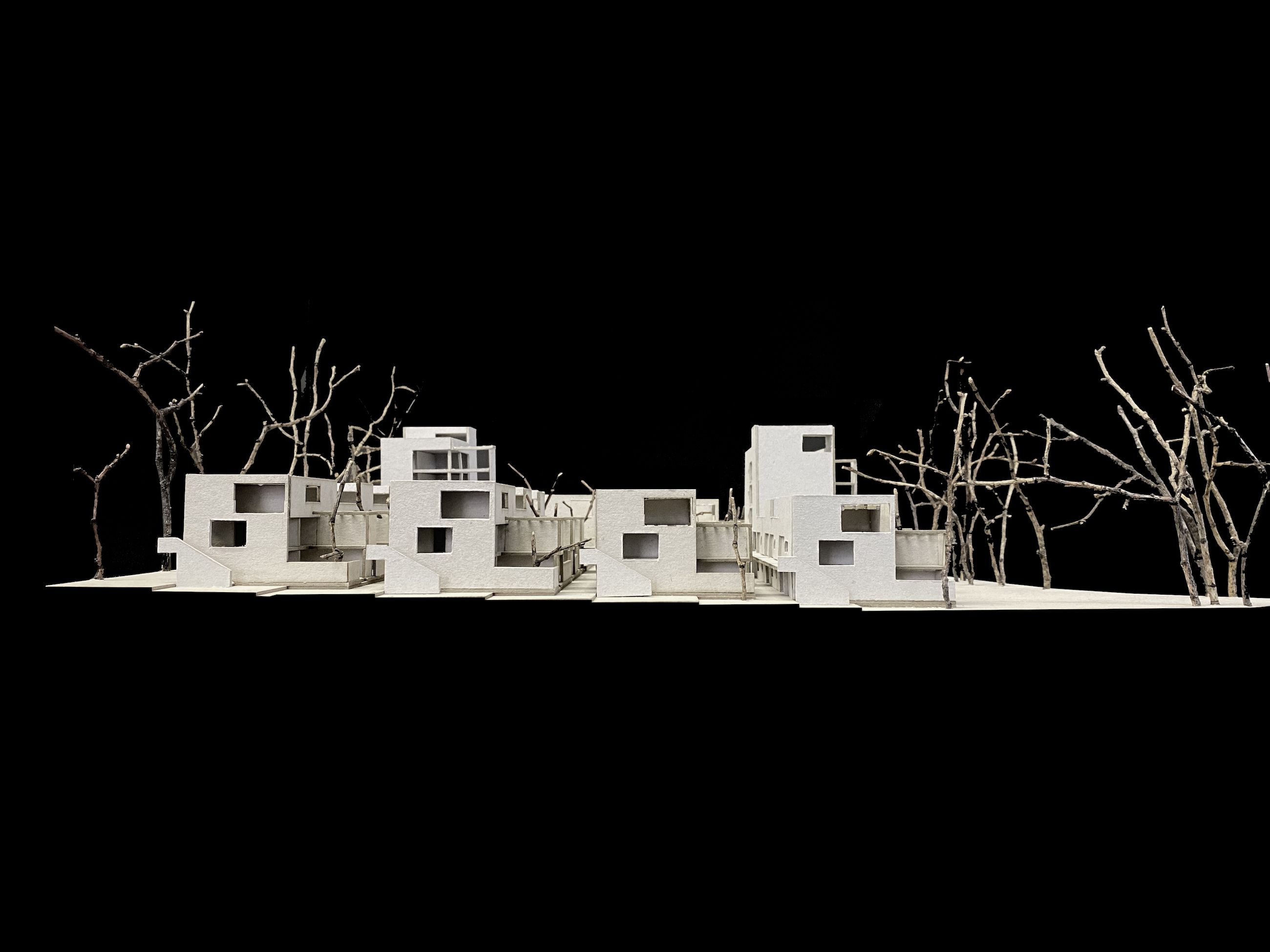 Durch die einheitliche Materialität der Häuser wird das Quartier zu einem Ganzen zusammengebunden: Einheit und Vielfalt. Die monolithische Gebäudestruktur aus Dämmziegeln mit ihren rhythmisierend aufsteigenden Kronen wird über einen einheitlichen, groben Verputz zusammengebunden. Die auskragenden Elemente der Pergolen sorgen für eine Verwebung innerhalb des Quartiers. Die Lochfassaden im Norden bieten die nötige Privatsphäre und erzeugen gezielte Ausblicke. Zu den privaten Freibereichen im Süden und Westen hingegen öffnen sich die Wohnungen durch raumhohe Verglasungen.