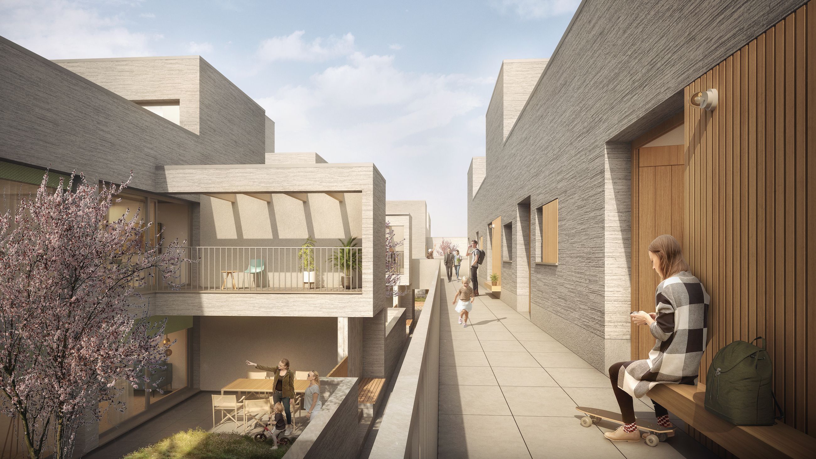 Das neu geschaffene Quartier bildet durch seinen öffentlichen Platz, die halböffentlichen Wege und Laubengänge, die die Wohnungen erschließen, Orte der Begegnung und Kommunikation. Im Gegensatz dazu bieten die Wohnungen mit ihren klar begrenzten, privaten Freibereichen ein hohes Maß an Privatheit.