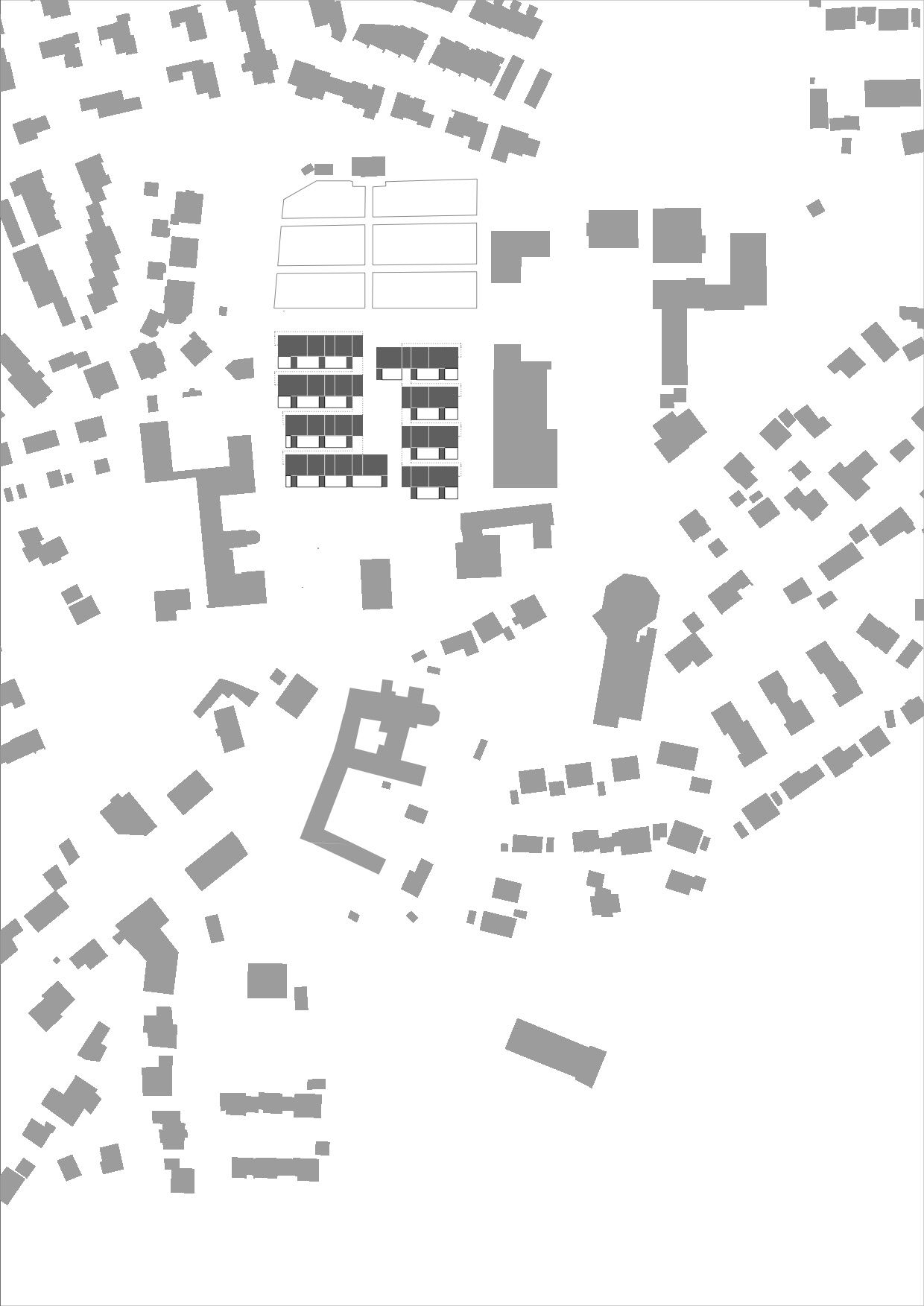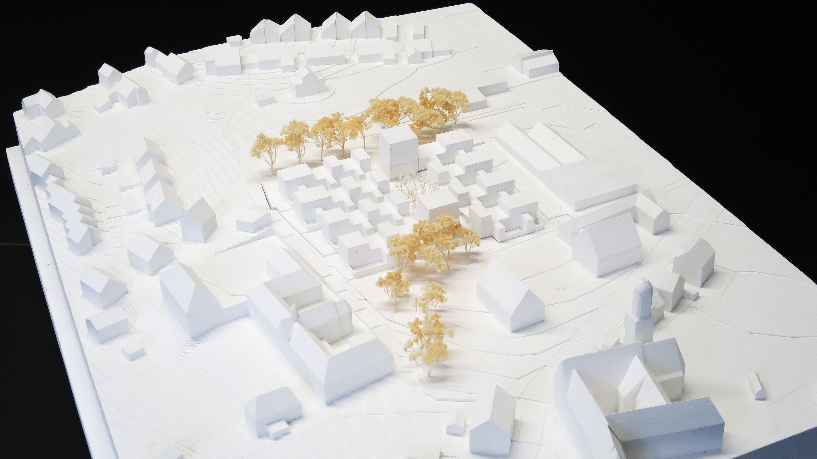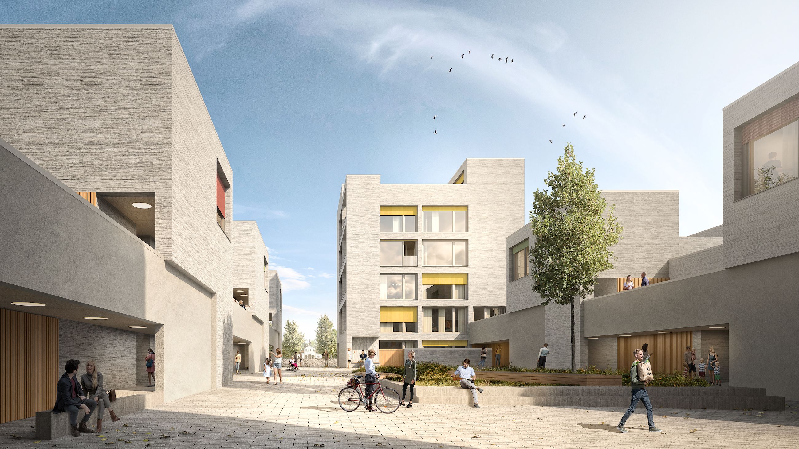 Der zentrale Quartiersplatz zum gemeinschaftlichen Aufenthalt mit Wiese, Bäumen und Brunnen, ist das „Herz“ des Quartiers. Die aus der Formation der Baukörper entstehenden Freiräume zeichnen sich durch ihre Klarheit und Stringenz aus. Mit der Ausbildung eines Rückens auf der Ostseite zum Supermarkt wird die Süd-West-Richtung gestärkt.