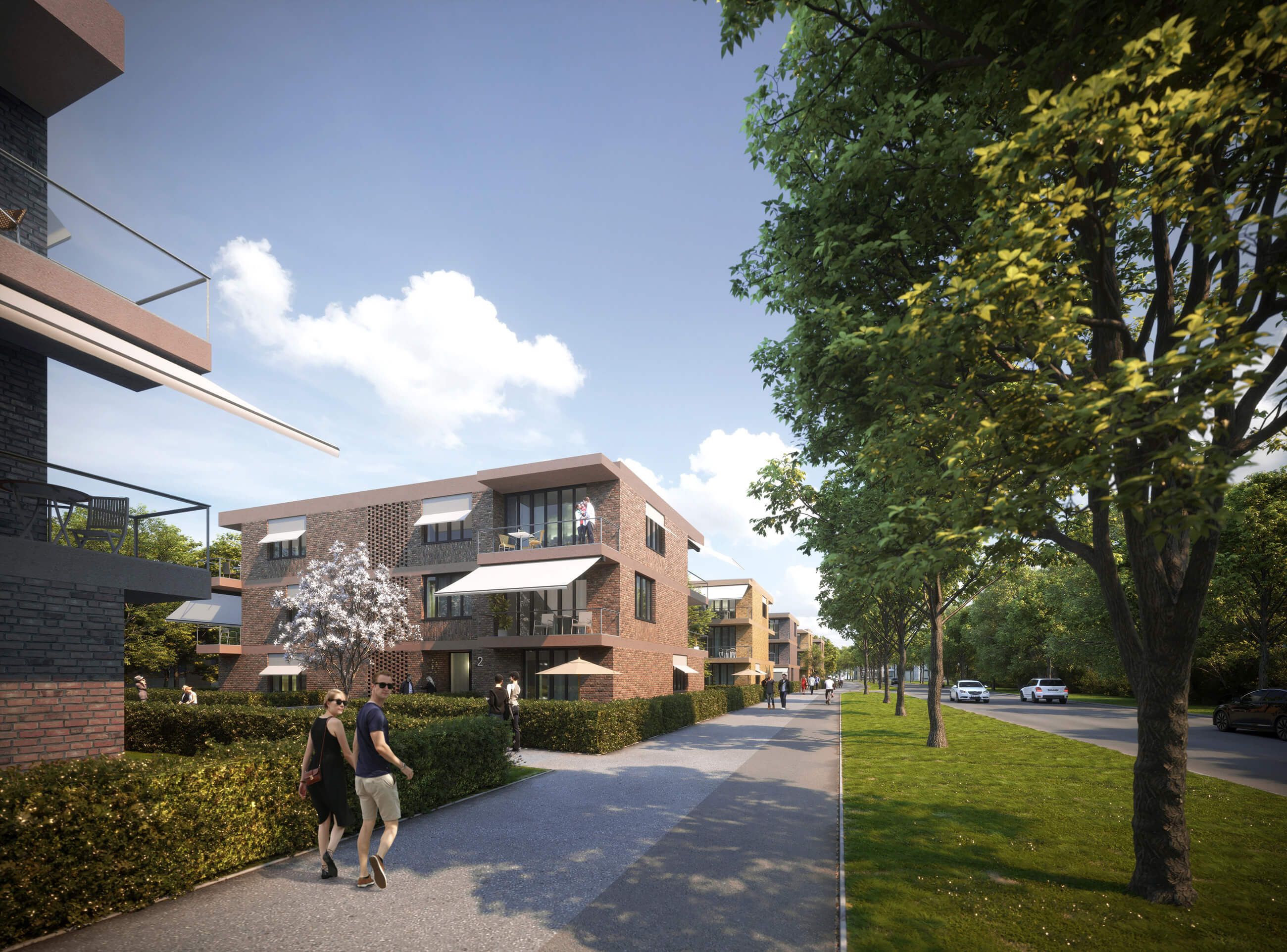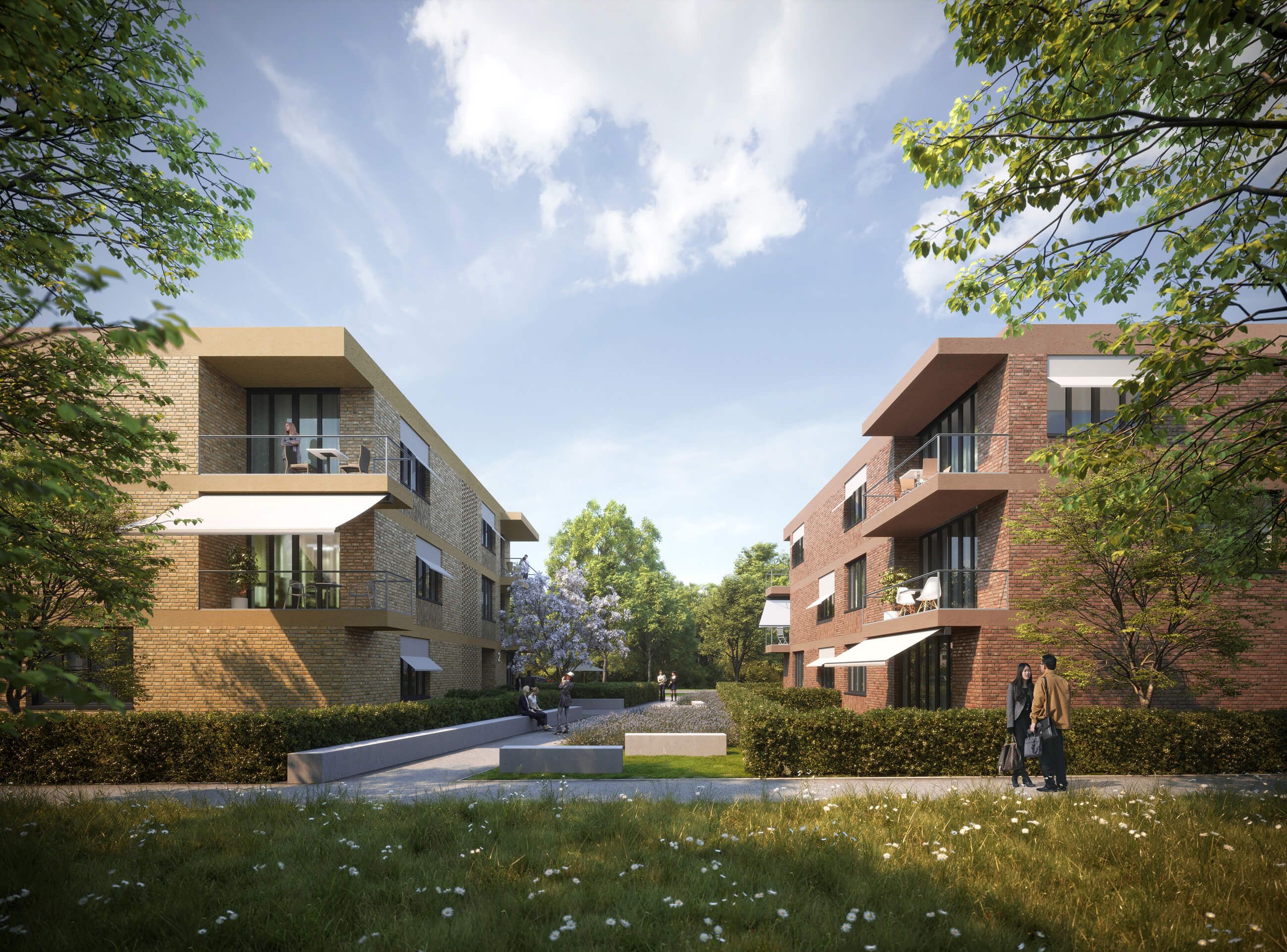 Die Erscheinung nach außen wird bestimmt durch ein abwechslungsreiches Fassadenbild. Als Teil einer Farbfamilie changieren die Ziegelbauten zwischen Rot-, Braun- und Ockertönen. Ein durchgehendes Fensterformat stärkt die Einheit der sechs Gebäude. Durch die unterschiedliche Setzung der Fenster gewinnen die Gebäude an Individualität und Wiedererkennungswert. Horizontal wird die Fassade durch die auskragenden Balkone und Fassadenbänder gegliedert, während die Fensterformate eine vertikale Ausrichtung erzeugen.