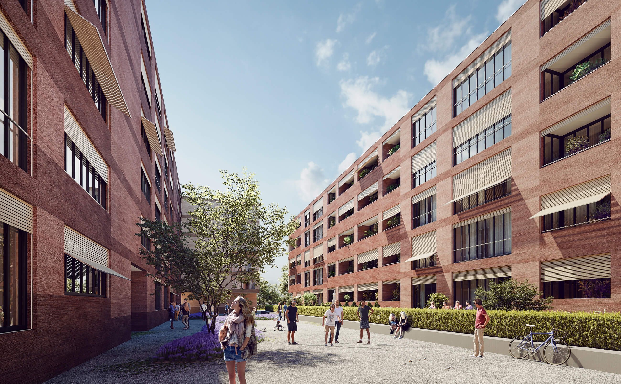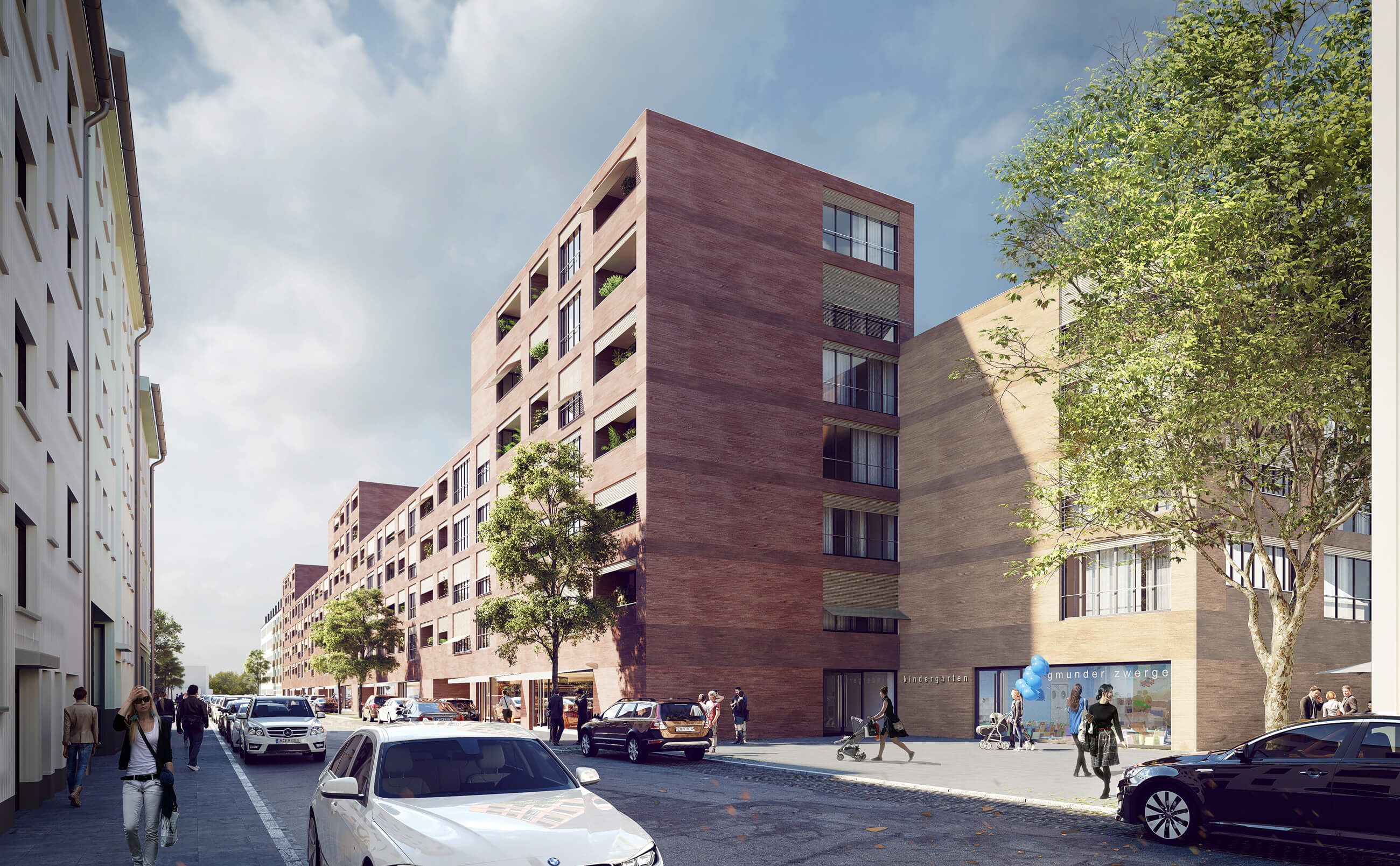 Bei sämtlichen Gebäudeteilen wird in der Höhenentwicklung eine erhöhte Erdgeschosszone berücksichtigt, die zur Wohnnutzung als Hochparterre ausgebildet werden kann. Ausschließlich straßenzugewandte Erdgeschosse werden für Gewerbenutzungen vorgesehen. Die Kindertagesstätten finden sich an der Hofmannstraße und an der Gmunder Straße im Südosten wieder. Hier entsteht, unter Einbeziehung des wertvollen Baumbestands, durch den bewussten Rücksprung der Gebäudeecke ein baumüberstandener Vorplatz für die KiTa.