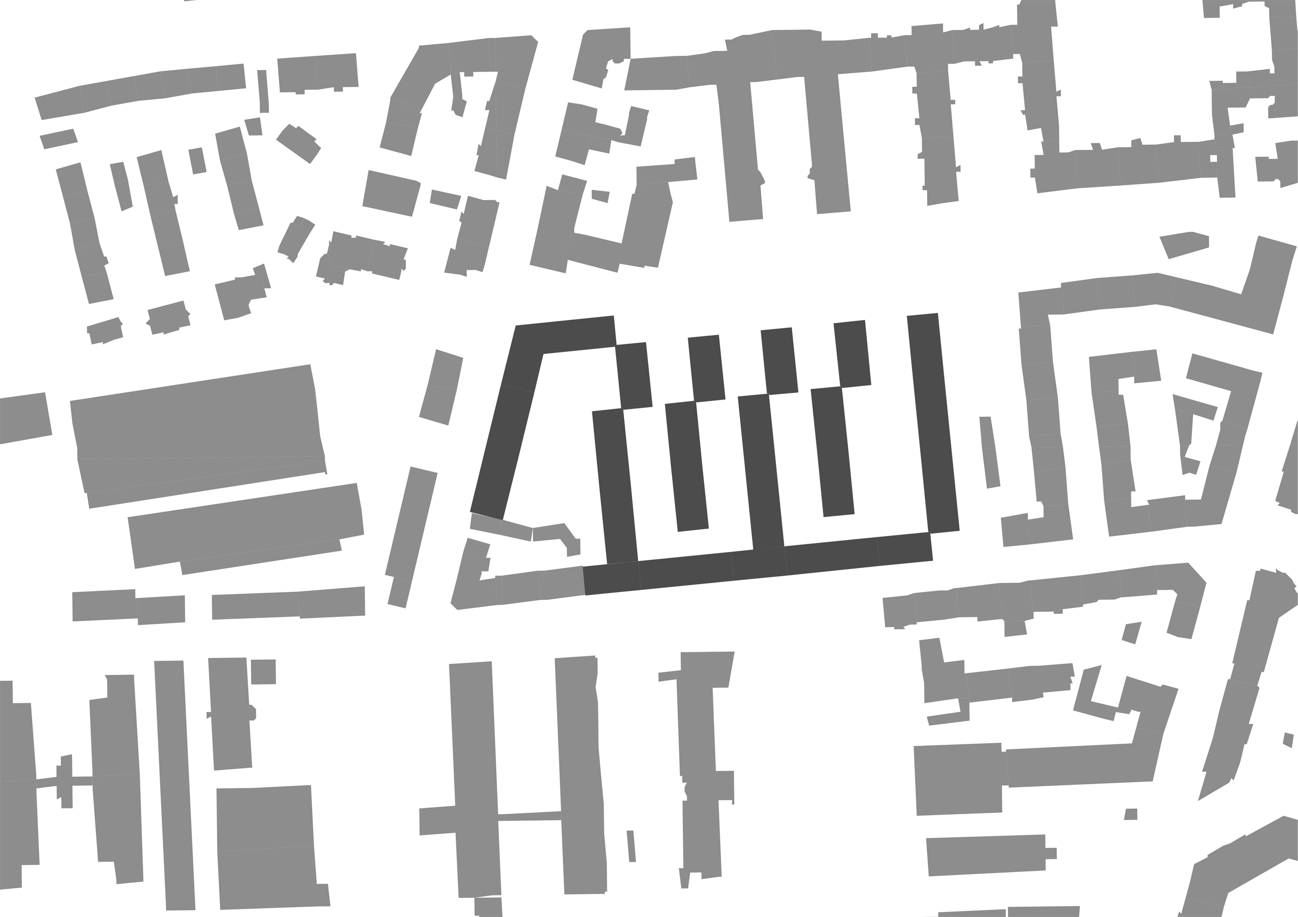 Im Inneren der Figur entstehen engmaschige, ineinander verzahnte Zeilen, die spannungsvolle Raumabfolgen entstehen lassen. Das formal eingegrenzte Repertoire bietet jedoch eine strukturelle Variationsbreite durch gleich- und verschiedenartige, gefasste Hofräume, die durch gezielte Maßnahmen einen differenzierten Charakter erhalten. Das Durchschreiten der Körper an den Schnittstellen der Zeilen lässt zusätzliche, neue Raumeindrücke und Blickbezüge entstehen und weitet die Hofräume auf.
