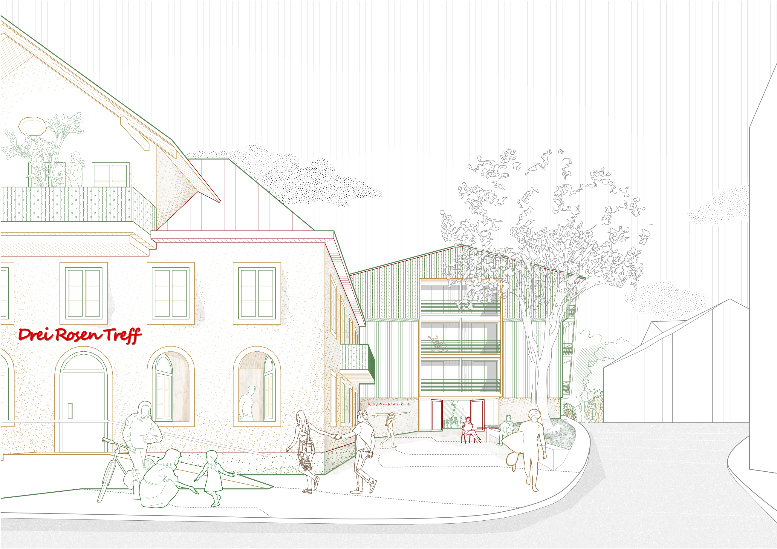 Mit dem traditionsreichen und wertgeschätzten Gasthof „Drei Rosen“ und dem ergänzenden Geschosswohnungsbau entsteht ein Wohnbau-Ensemble, das dem besonderen Kontext auf unterschiedlichsten Ebenen verpflichtet ist: Der ortsbildprägende Charakter des Gasthofs bleibt den Dießenern in gewohnter Erscheinung erhalten. Ein Quartierstreff in der ehemaligen Gaststube öffnet das alte Haus zukünftig für die Marktgemeinschaft. Der ergänzende Neubau schafft einen harmonischen Übergang zum südwestlich gelegenen Augustinum. Die Wohnungen im Hochparterre bieten zur Schützenstraße mit ihrer ausreichenden Privatheit ein hohes Maß an Besonnung, Belichtung und Wohnqualität.