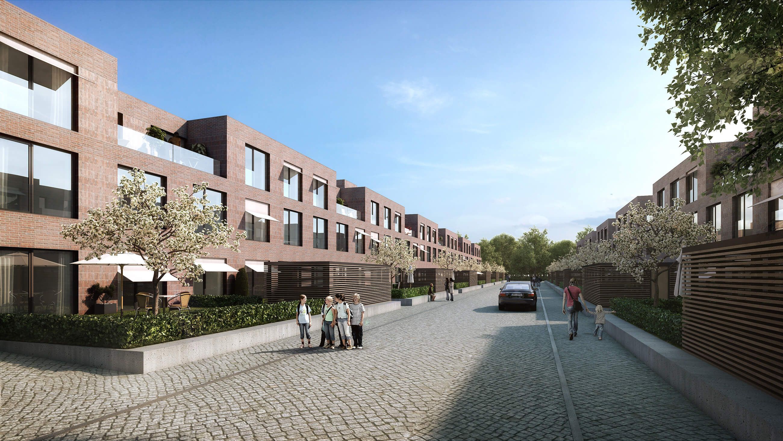 Die neue Wohnbebauung erhält die Straßenfluchten und die Siedlungsstruktur der ursprünglichen Bebauung. Die somit entstehenden Wohnungsbauten verlaufen von Nord nach Süd und bieten den neu entstehenden Wohnungen optimale Ost- Westbelichtung. Die Stich- und Durchgangsstraßen nach jedem zweiten Baukörper sind verkehrsberuhigt und als Spielstraßen ausgebildet, um die Wohn- und Lebensqualität in der Siedlung zu erhöhen. Städtebaulich wird an jedem zweiten Kopfende eines Baukörpers ein gemeinschaftlicher und öffentlicher Platz ausgebildet, der durch gemeinschaftliche, soziale, öffentliche und gewerbliche Einrichtungen in den Erdgeschossen die Adressbildung schafft und den Wiedererkennungswert des einzelnen Hauses erhöht. Der Platz ist Treffpunkt und die soziale Infrastruktur der Siedlung. Hier gibt es Cafés, Eisdielen, Mutter-Kind-Cafés, Kinderbetreuung und einen Jugend- und Seniorentreff. Gleichzeitig werden zweckmäßig hierüber die Tiefgaragen erschlossen. Der Raum zwischen den Wohnungsbauten wird wieder zum Grünraum.