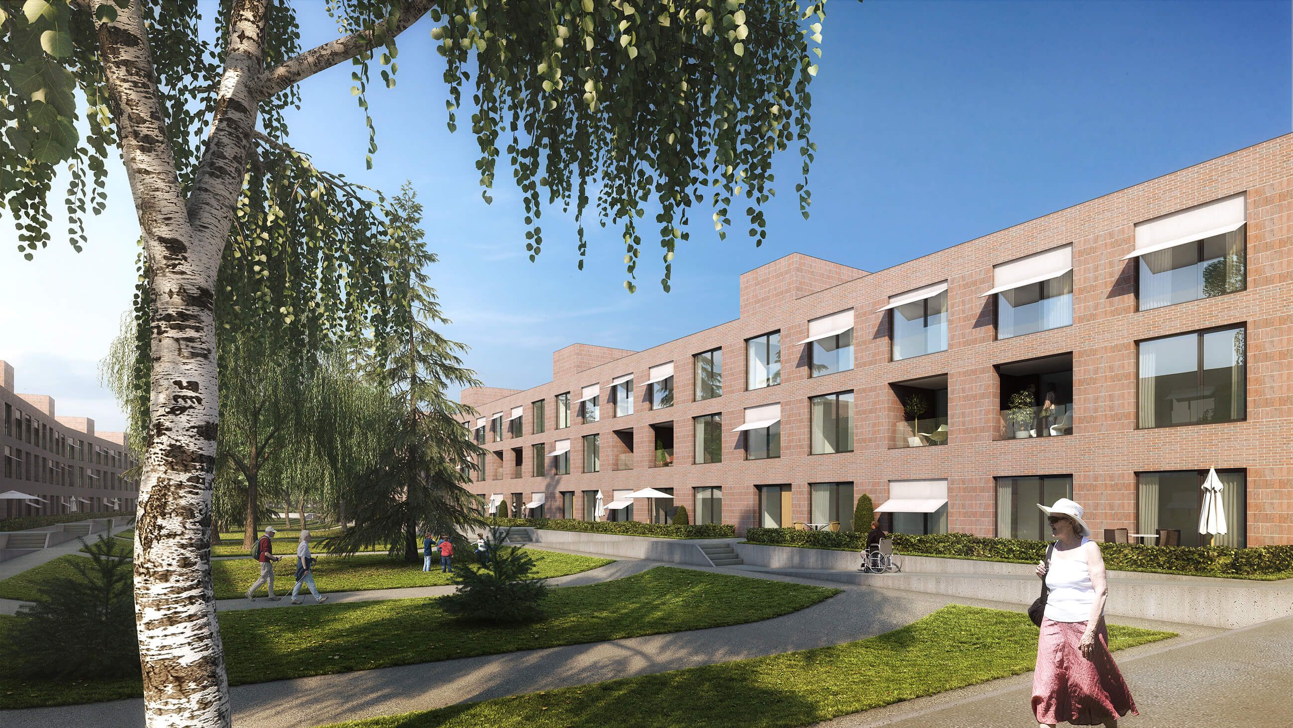 Je drei Vollgeschosse mit begrüntem Flachdach bilden die rechtwinkligen Baukörper. An der Rochusstraße sind gemäß Auslobung vier Vollgeschosse vorgesehen. Die Baukörper sind als Massivbau mit einer Verkleidung aus rotem Sichtziegelmauerwerk konzipiert. Alternativ können die Fassaden auch als wärmegedämmte Putzoberfläche gedacht werden. Haptik (Kellenwurfputz) und Farbigkeit (siena rot) des Putzes sind hierbei dem Material des Ziegels entlehnt. Die Lebendigkeit des Materials sowie die Lochfassade mit großflächigen Fenstern bilden eine flächige aber getaktete und rhythmisierte Fassade, die für den Betrachter spannungsvoll und doch leicht verständlich ist. Das Erdgeschossniveau ist überall leicht erhöht, sodass man die Gebäude barrierefrei über Rampen oder Aufzüge (Rochusstraße) betritt. Eine Sitzstufe begrenzt den ebenfalls leicht erhöhten Vorgarten und kann besonders an den Eingängen zum Treffpunkt der Nachbarschaft werden. Die Dachfläche ist begrünt und ist als gemeinschaftliche Dachterrasse für alle Bewohner nutzbar. Die Wohnbebauung wird in zwei Typen eingeteilt. Die innenliegende Bebauung entlang der Gerhard-Bruders-Straße ist Typ I, die Gebäude entlang der Rochusstraße sind Typ II.