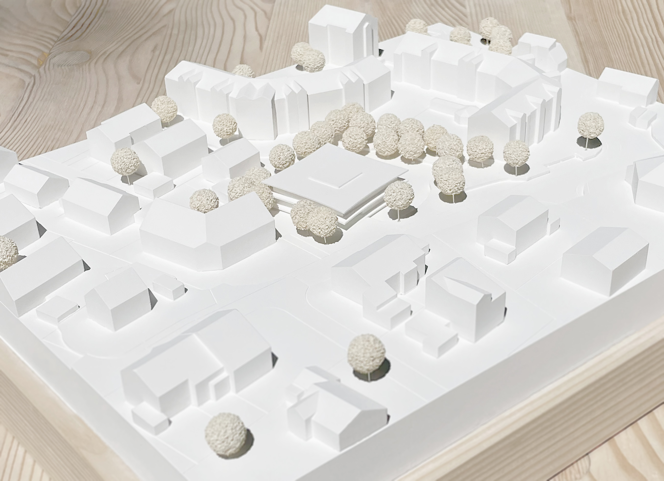 Im Abdruck des Bestandskindergartens zeigt sich der Ersatzneubau als ruhiger und unaufgeregter, zweigeschossiger Flachdachbau. Der Kindertageseinrichtung liegt eine klare und einfache Struktur zugrunde. In jedem Geschoss sind vier quaderförmige Einheiten um einen zentralen und offenen Erschließungsraum jeweils im 90° Winkel zueinander angeordnet, wodurch die bildliche Figur einer Windmühle entsteht.