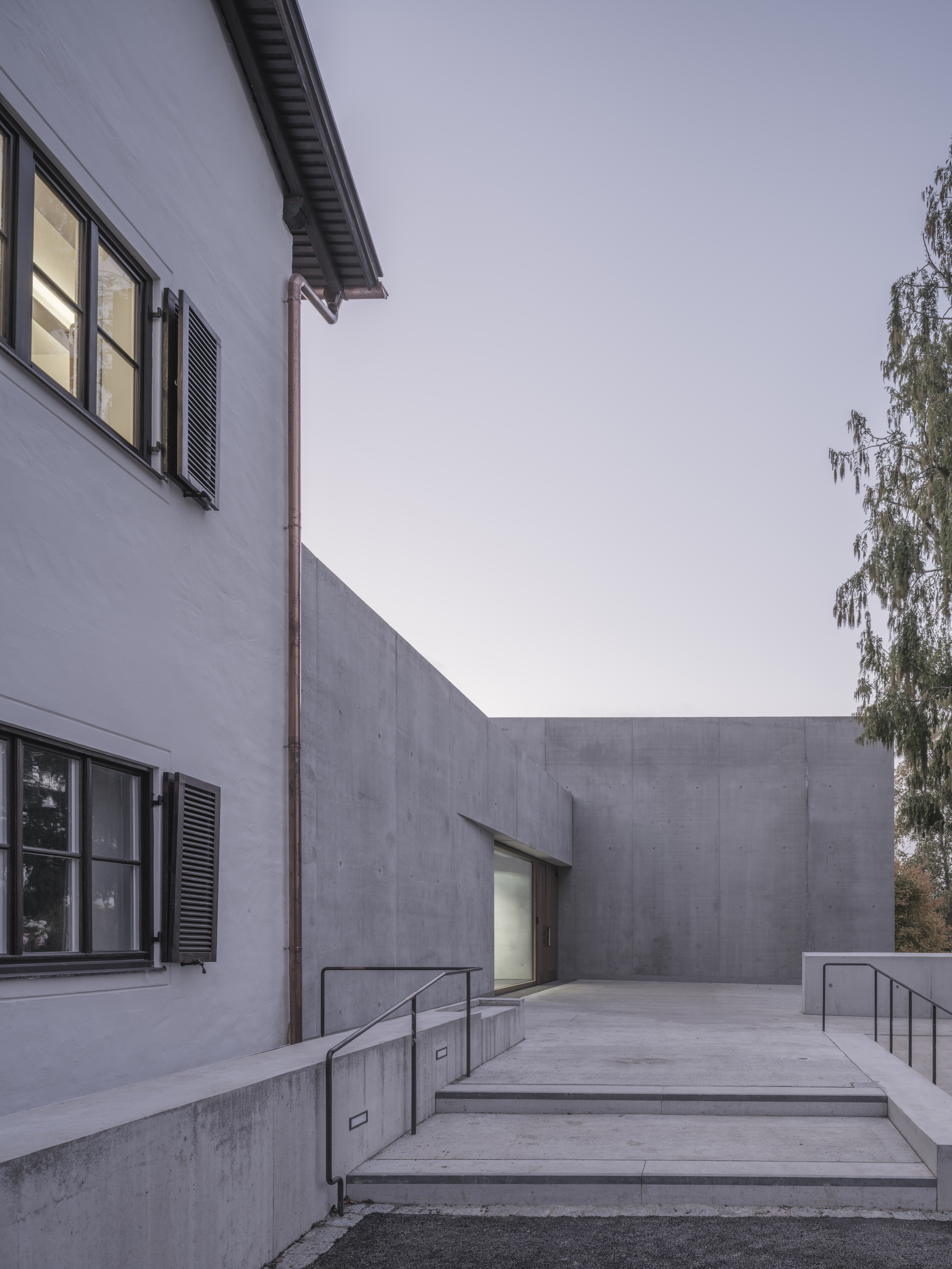 Im Erweiterungsbau spiegelt sich Carl Orffs Idee einer elementaren Musik in einer auf das Wesentliche reduzierten, ganzheitlich gedachten Architektur: Proportion, Licht, Material und Fügung bilden eine Einheit, deren Wirkung sinnlich erfahrbar und von zeitloser, universeller Gültigkeit ist. Aus dieser Reduktion entstehen Räume von großer Intensität. Die monolithische Konstruktion aus Infraleichtbeton verleiht ihnen eine klare Ordnung und eine konzentrierte Atmosphäre, die den Fokus ganz auf das Erleben der Ausstellung richtet. Wie eine Bühne stellt die Architektur den Raum in den Dienst der Inszenierung. Die Betonrippenkonstruktionen zitieren die Holzbalkendecken des Bestands und spannen weite, stützenfreie Räume auf, die flexibel bespielt werden können.