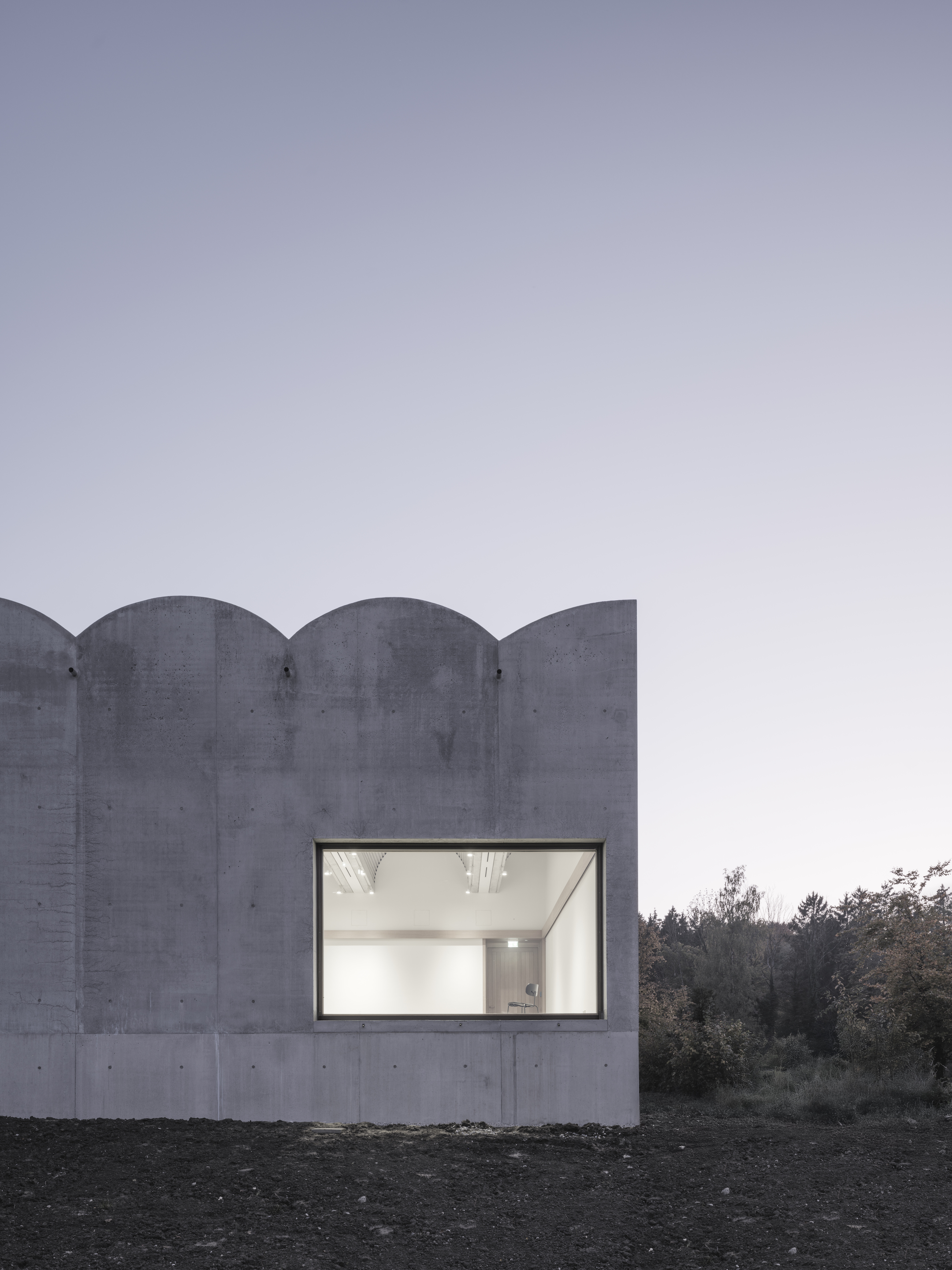 Die klimastabile, massive Bauweise ermöglicht auch eine Reduzierung der Haustechnik. So entsteht ein Gesamtbild kraftvoller, präzise gestalteter Einfachheit: Neben dem rohen Beton prägen Einbauten aus Eiche und ein Grund aus geschliffenem Gussasphalt das Innenbild. Lediglich der hohe Saal ist durch seine weiße Fassung innerhalb der Raumfolgen akzentuiert.